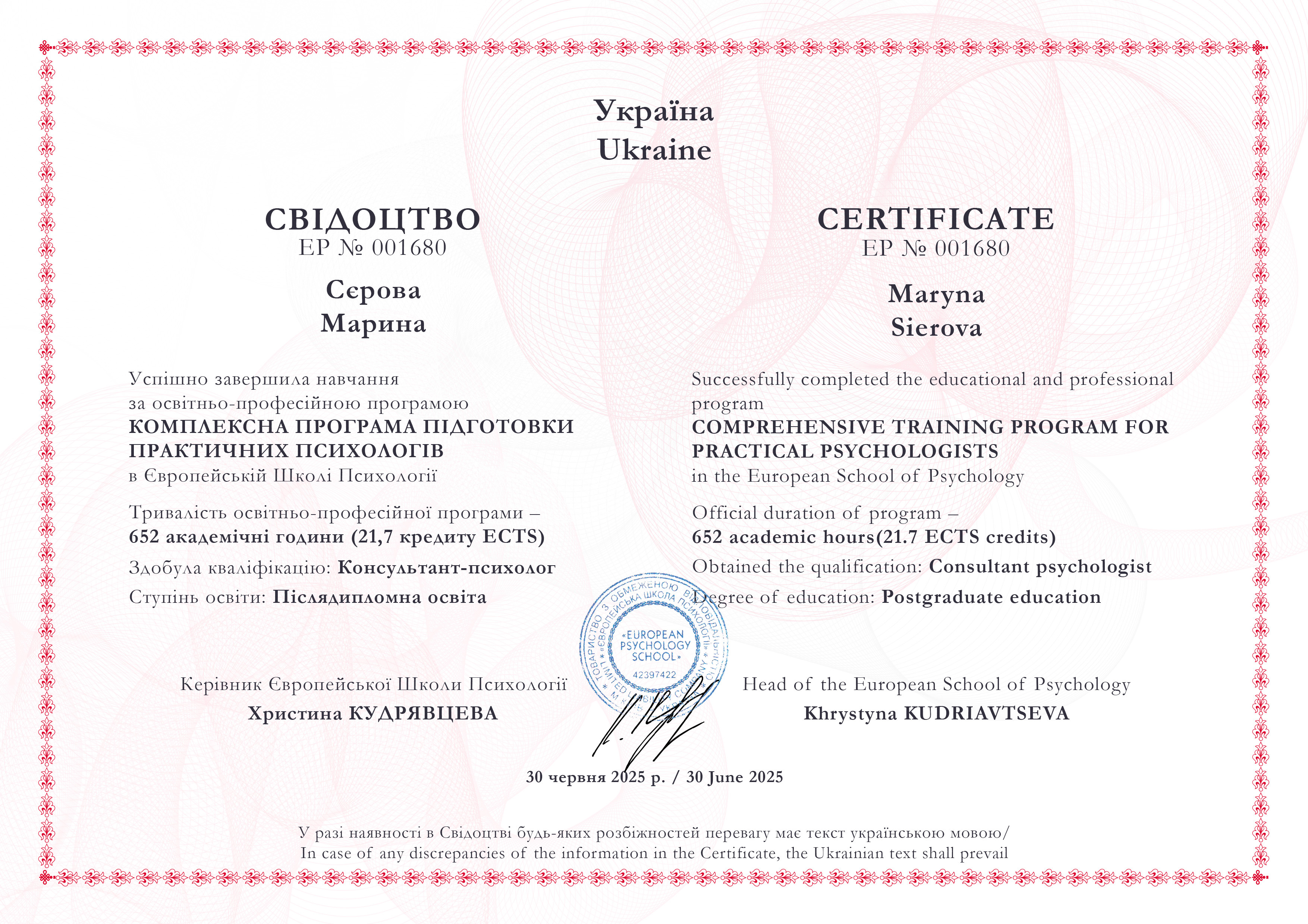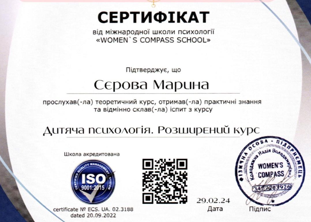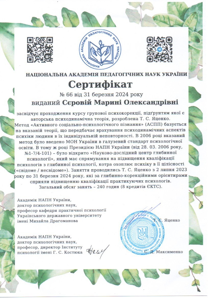 1. Донбасский педагогический университет. Получила степень магистра по специальности 053 - Психология.
