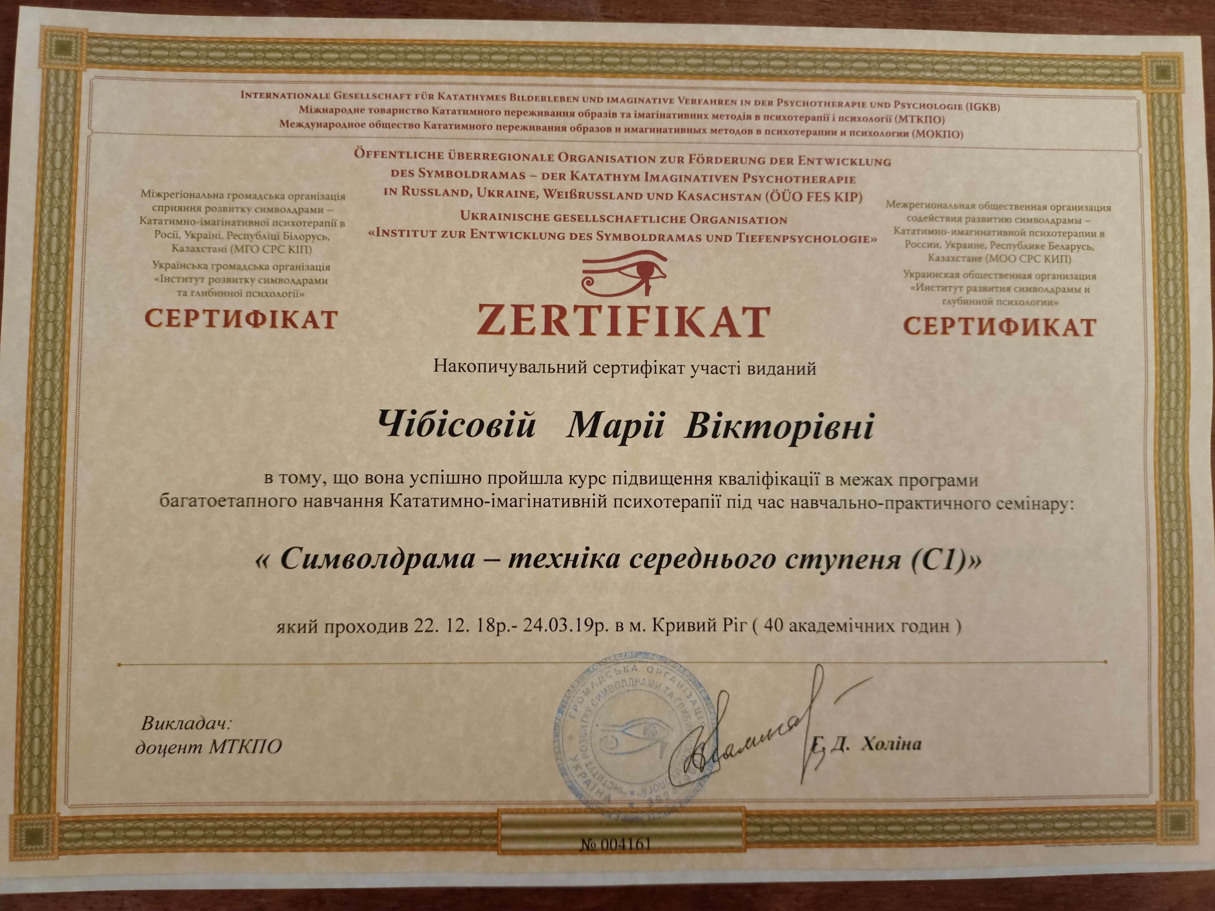 Вселенская терапия, точка сборки. Прошла курсы повышения квалификации по телесно-ориентированной психотерапии, бодинамике и символдраме и сказкотерапии.