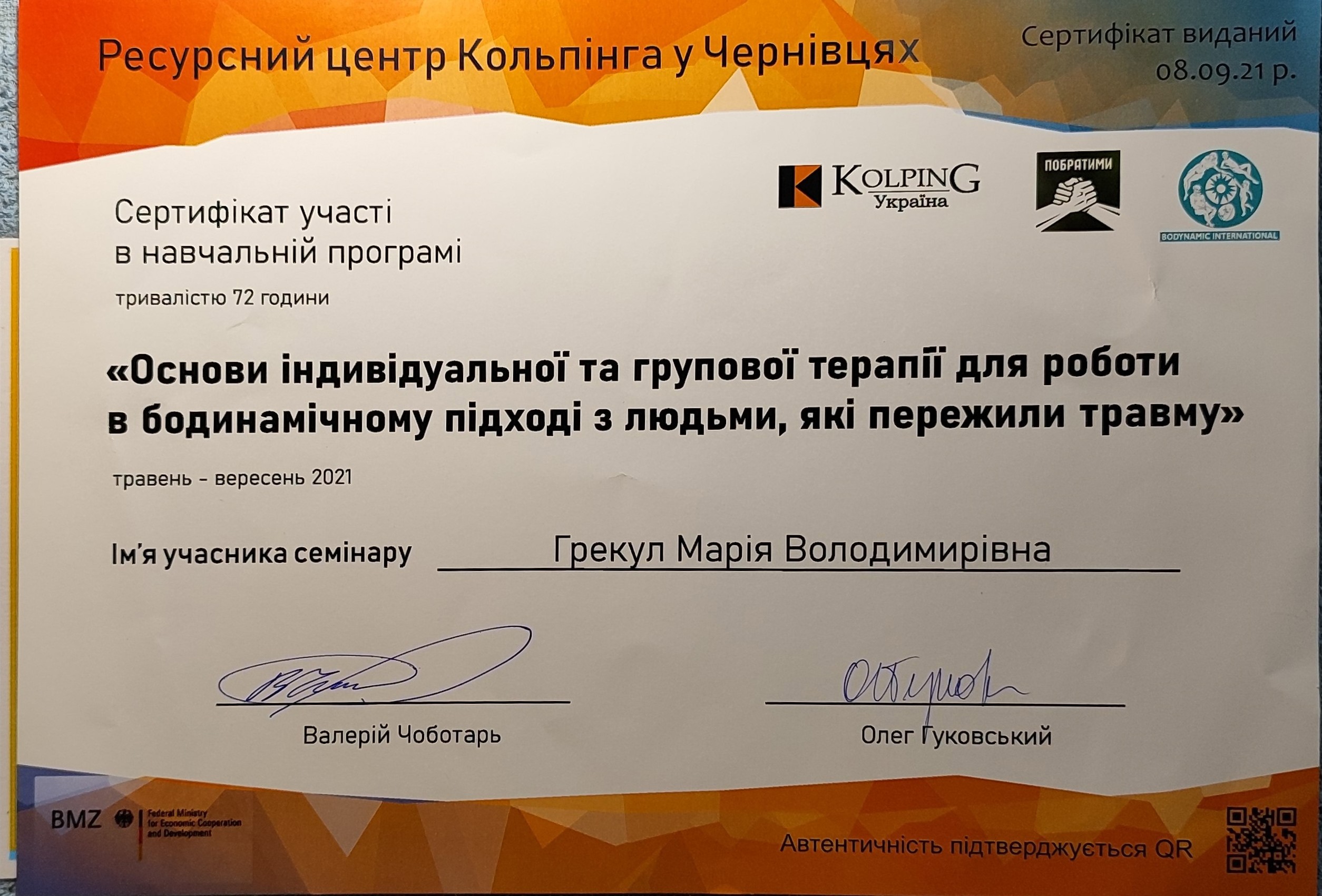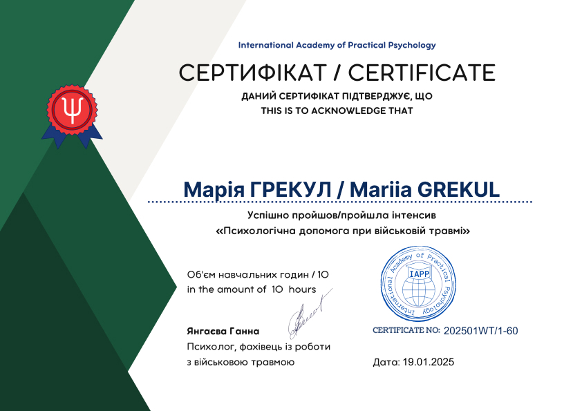 В 2020 году прошла курс повышения квалификации психологов Государственной пограничной службы.