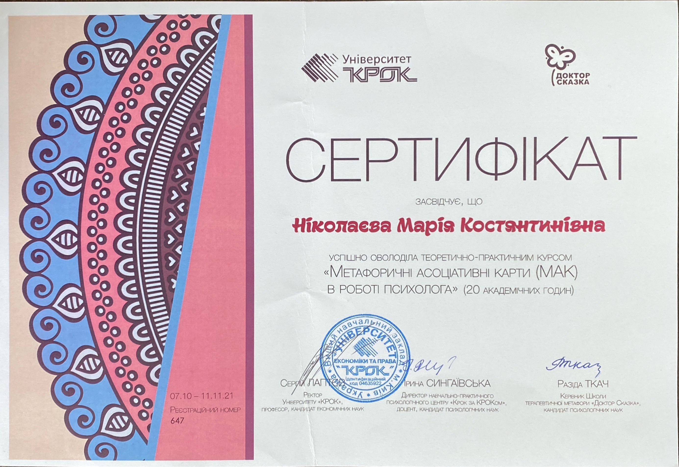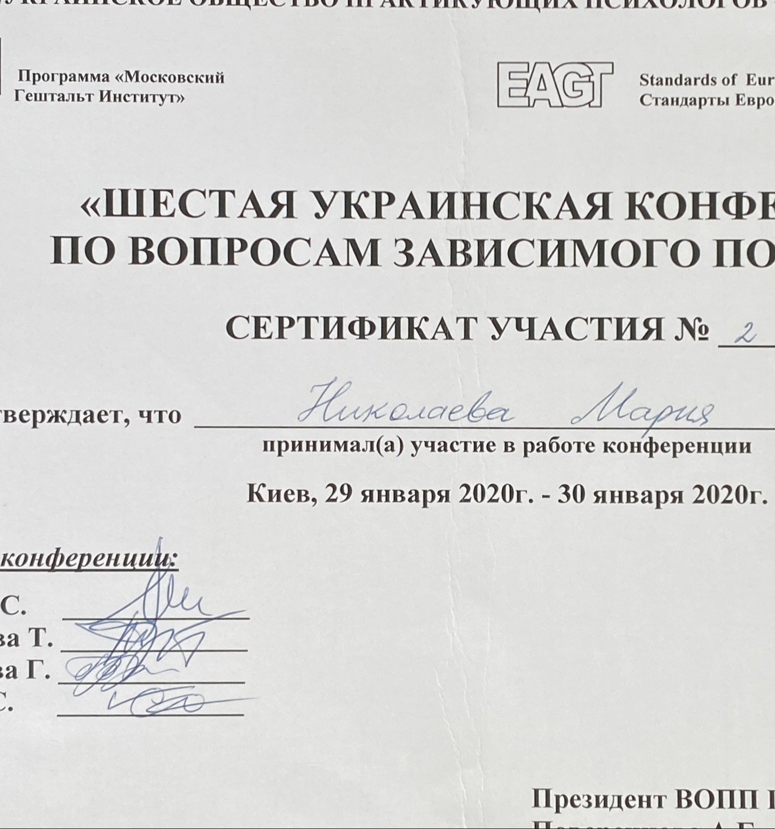 Получила две специализации (созависимость в работе с парой и клиническая и сексология) и в дальнейшем развиваюсь (семинары, специализации и т.п.).