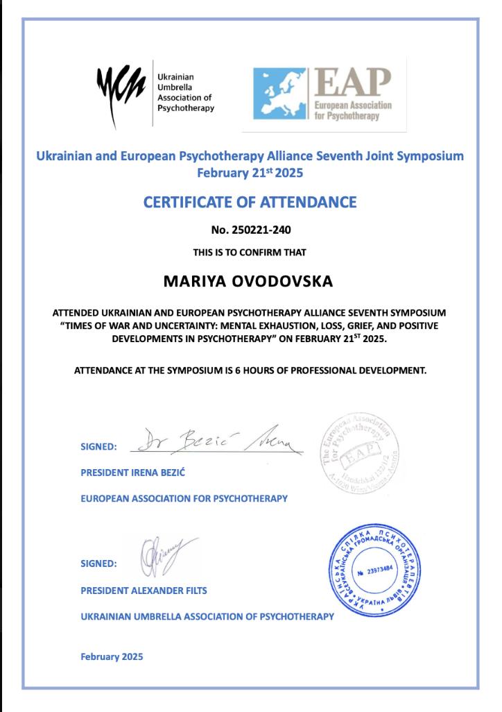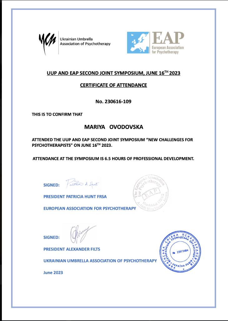 2023 – Стала членом «Украинского Союза Психотерапевтов». Соблюдаю этические стандарты работы, прохожу регулярные супервидения и продолжаю профессиональное развитие в международном психотерапевтическом контексте.