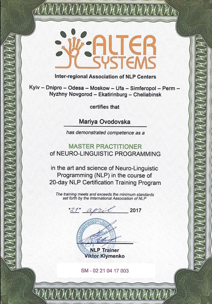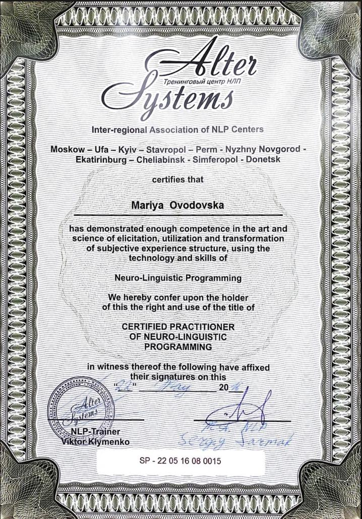 2017 – Получила сертификат NLP Practitioner. Освоила базовые методы нейролингвистического программирования для работы с мотивацией, реакциями, установками и внутренними ограничениями.