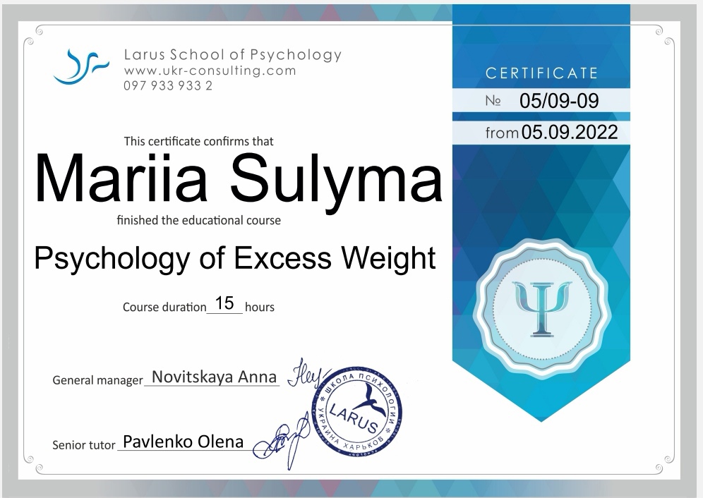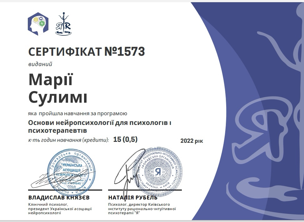 Я магистр психологии, психосоматический релаксолог, сейчас учусь на клинического психолога в Харьковском медицинском университете