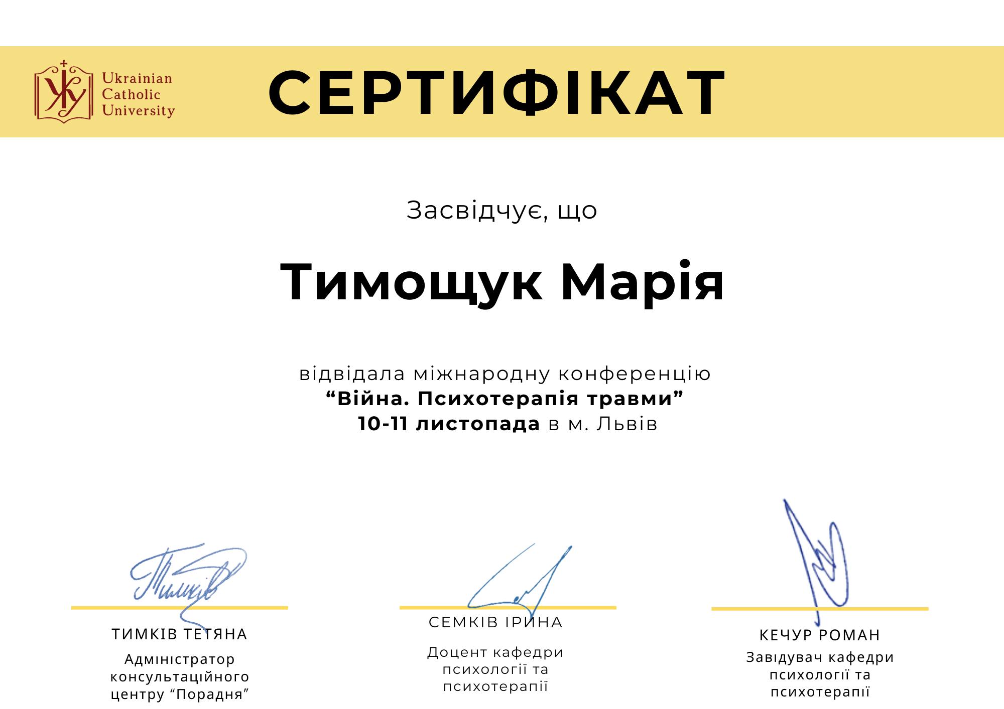 Я завершила магистратуру по психологии в Киево-Могилянской академии и нахожусь в длительном обучении на психотерапевтку в гештальт-подходе (Киевский гештальт университет, тренер - Светлана Походенко и Елена Васильева). В 2025 году принимала участие в летнем образовательном гештальт-интенсиве от КГУ, а также прошла обучение на 8-ми шаговой программе по работе с потерей для взрослых и подростков (Институт психологии здоровья)