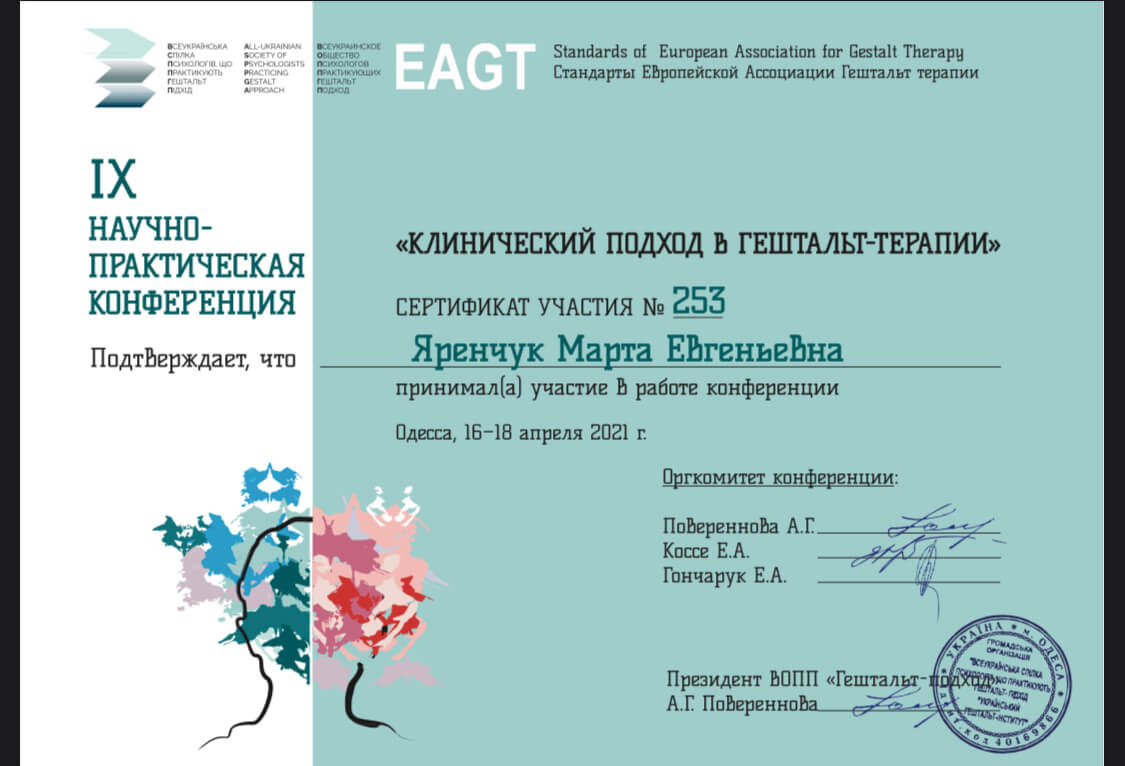 2020-2021 Первая ступень Национальной Ассоциации Гештальт-терапевтов Украины.