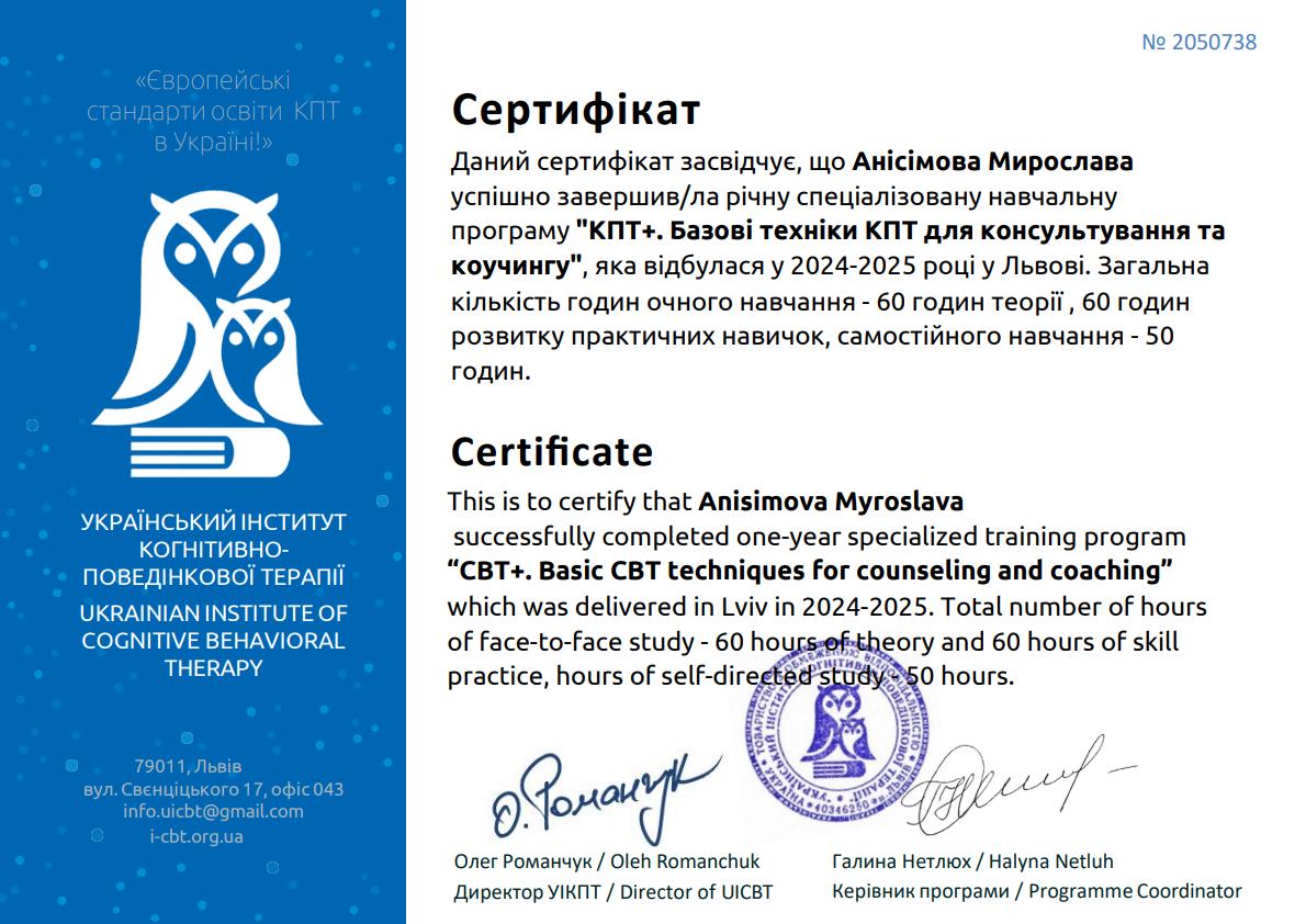 Одновременно прохожу курс КПТ+ базовые техники КПТ для консультирования и коучинга в Украинском институте когнитивно-поведенческой терапии.