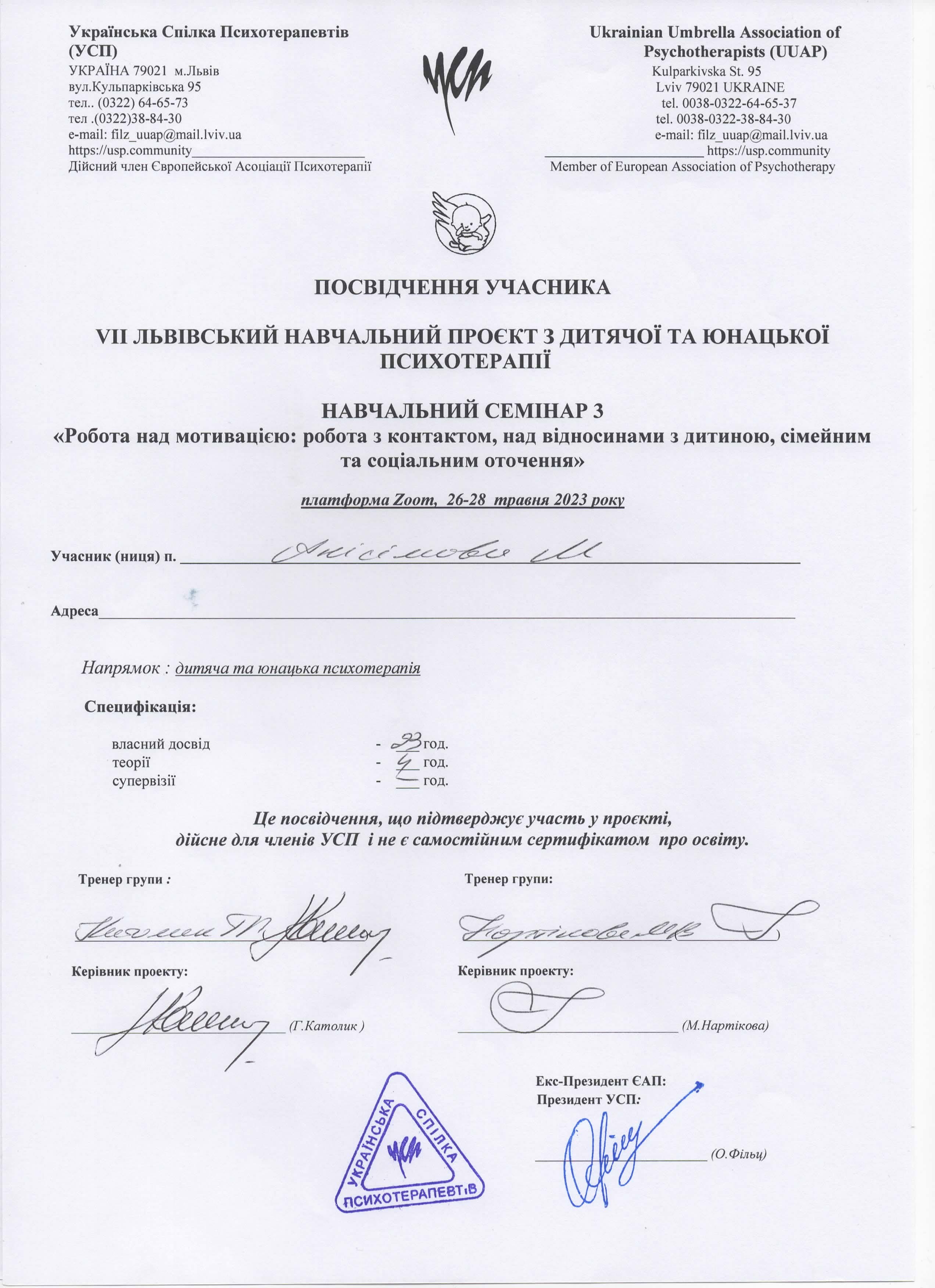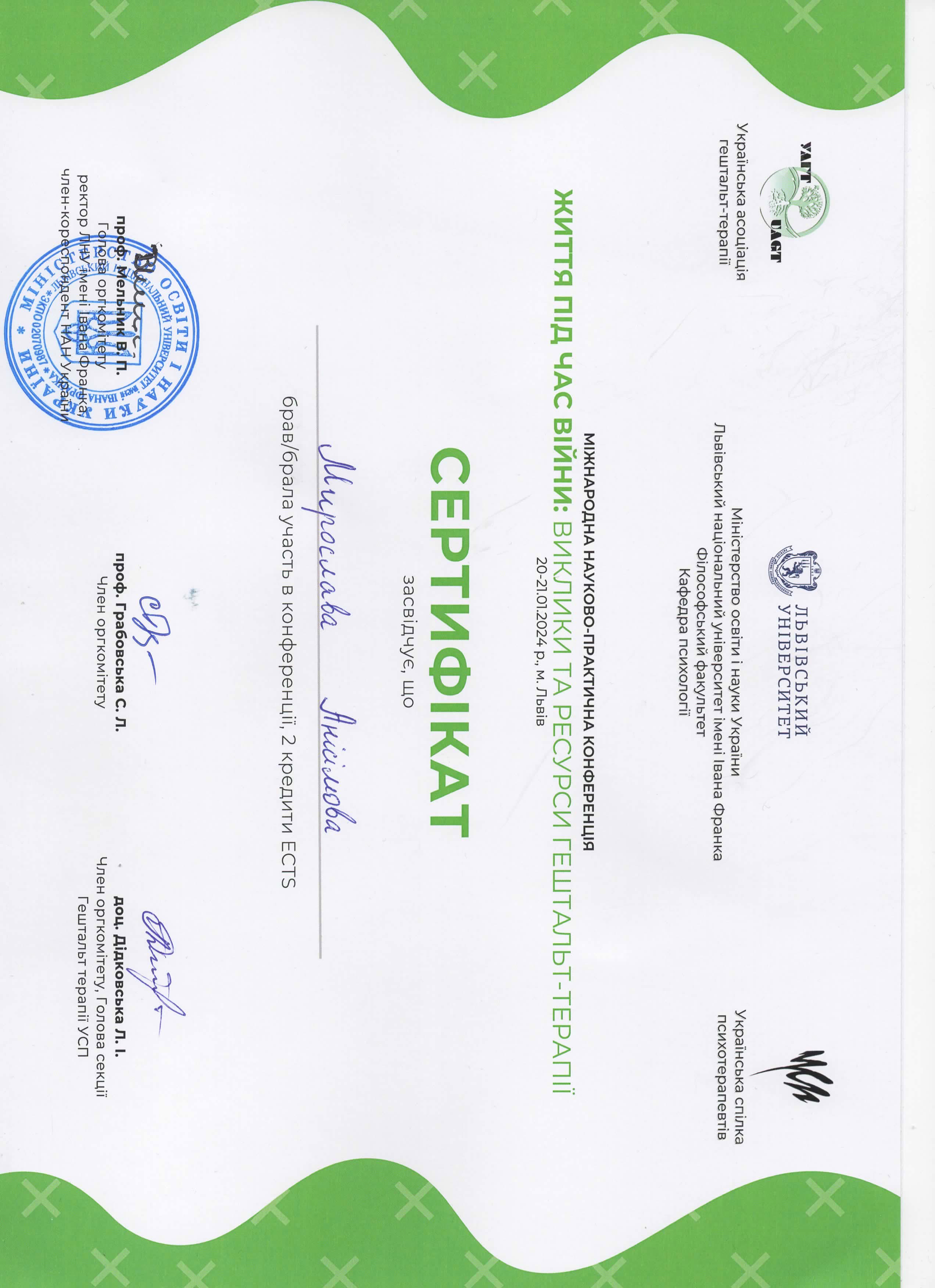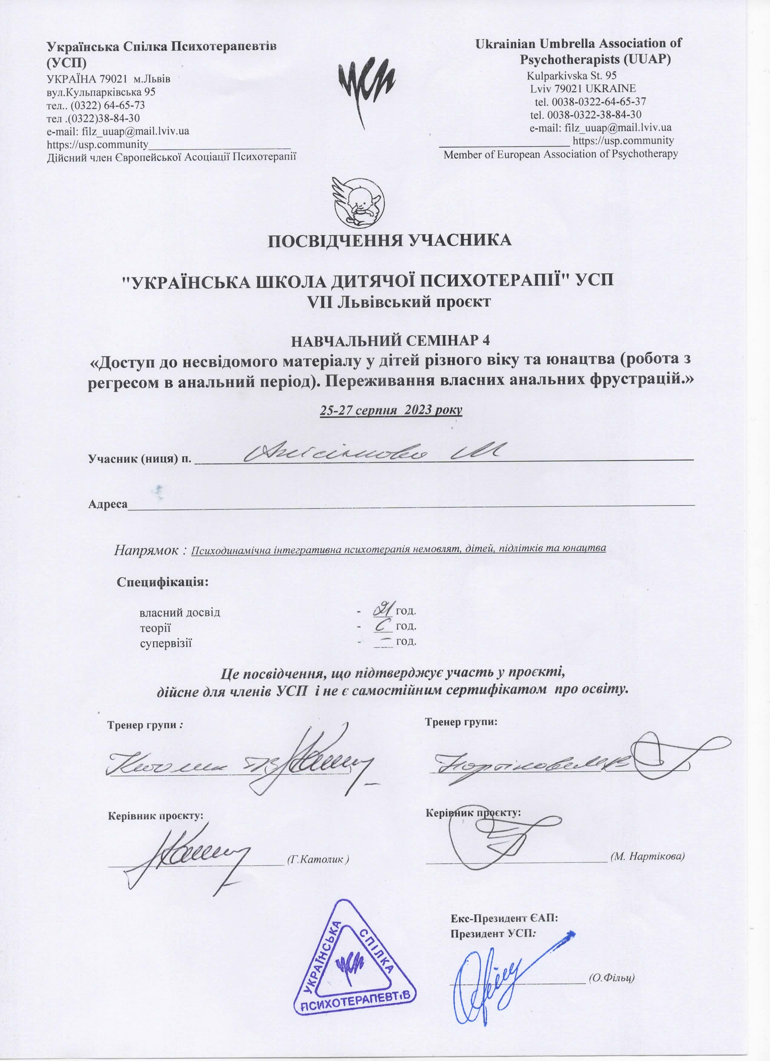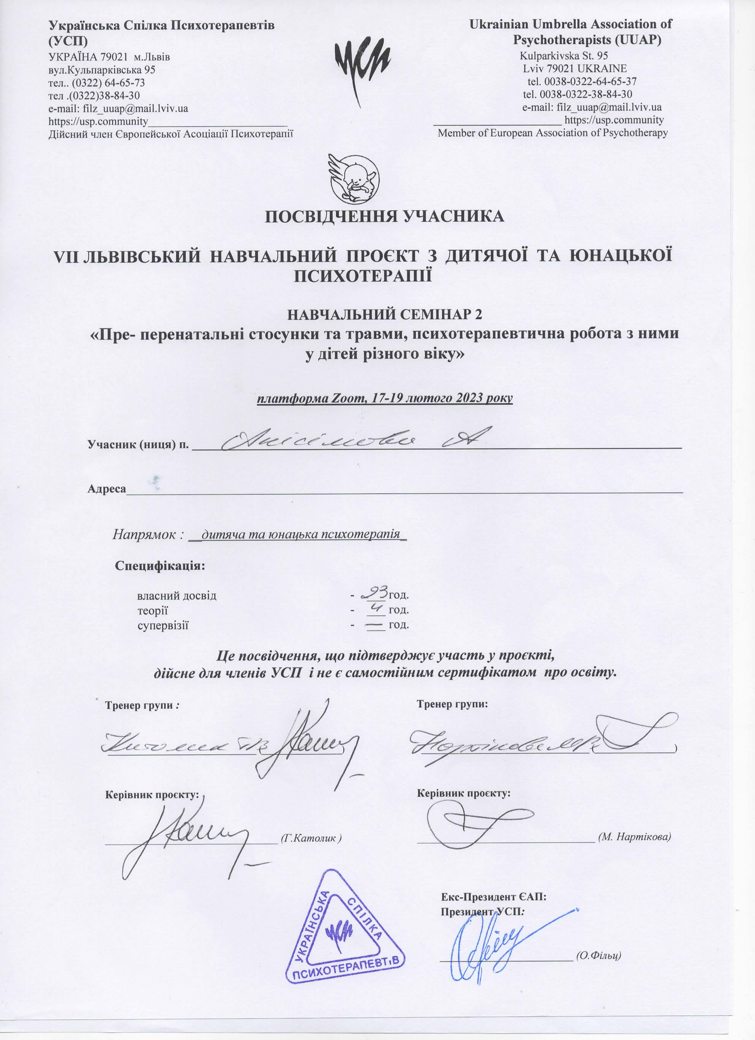Продолжаю повышать квалификацию и получаю образование психотерапевта в гештальте направления в Украинском Психотерапевтическом Университете.