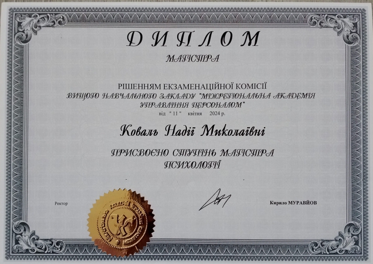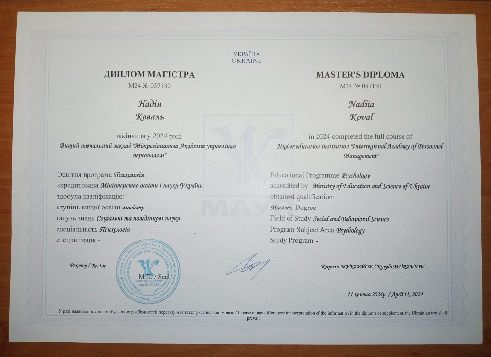 Я магистр психологии и транзакционный психоаналитик. Мой путь в профессии психолога начался с работы над собой. Я посещала много лет личного психотерапевта, а также опыт групповой психотерапии, что является важным условием для качественной работы с клиентом.