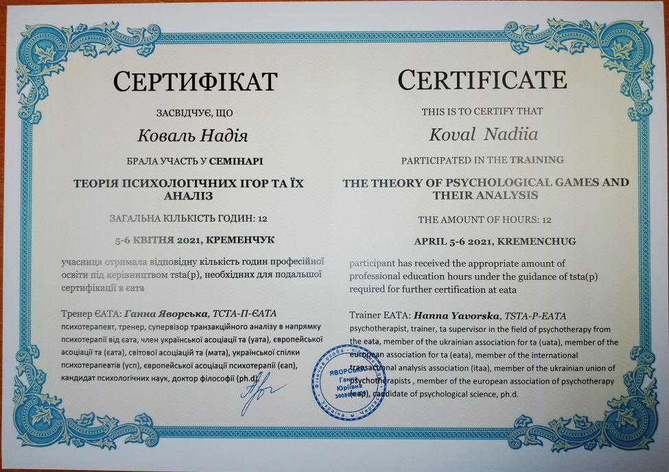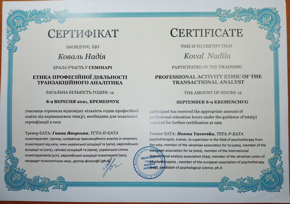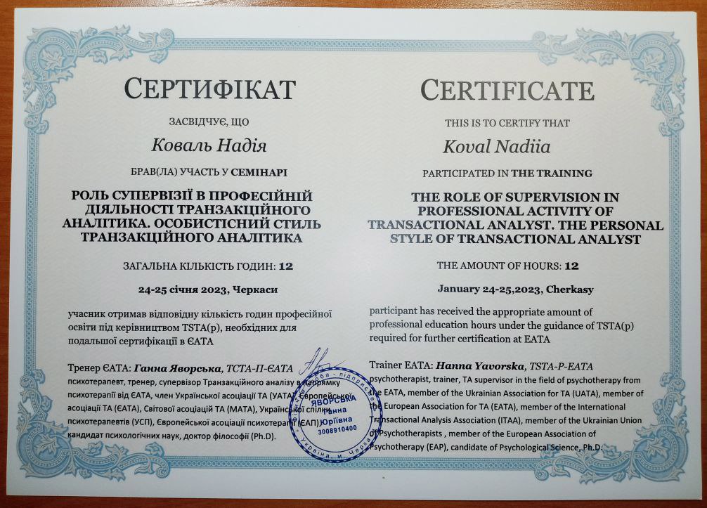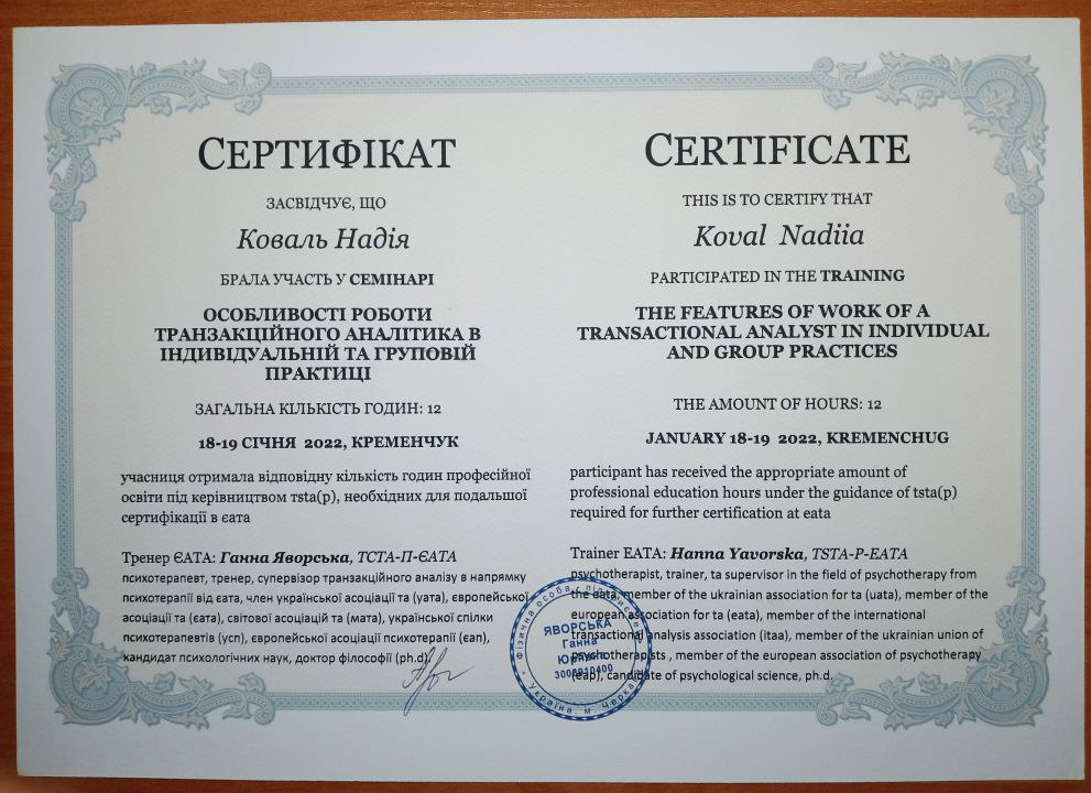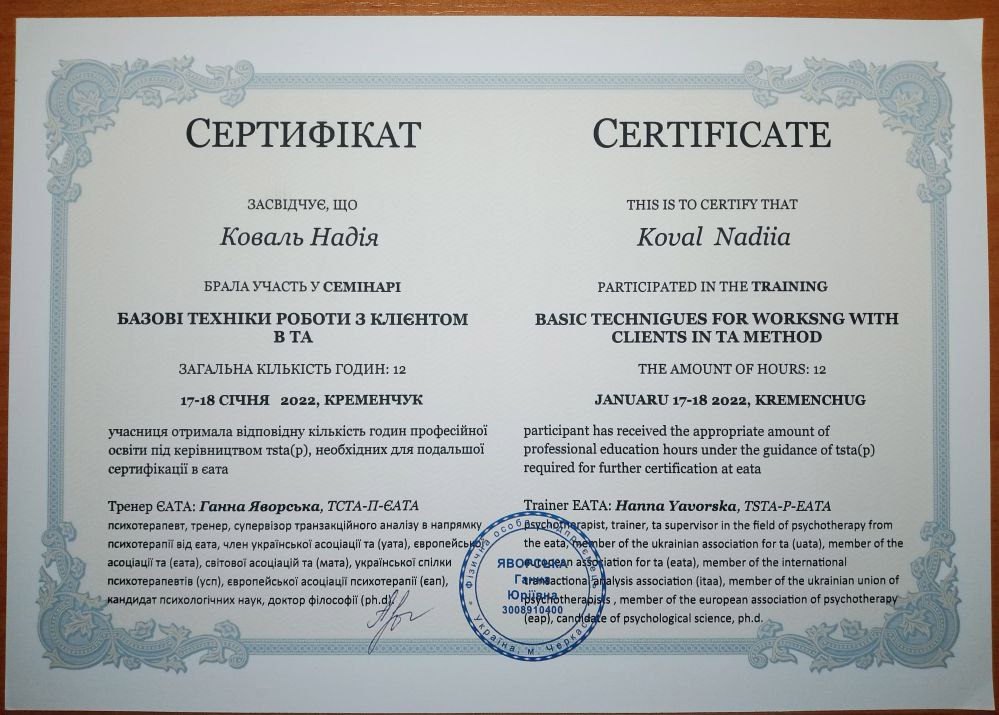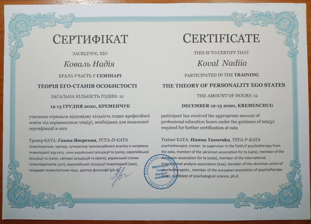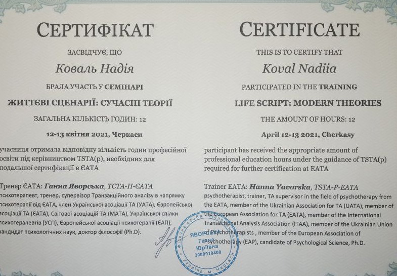 Если ты хочешь понять себя, научиться правильно выражать эмоции, научиться строить здоровые отношения с окружающими и самим собой, понять свой сценарий и строить жизнь своей мечты – приглашаю Вас на сессии в методе транзакционного анализа. Также в своей работе использую элементы Гештальт - терапии, Когнитивно - поведенческой терапии.