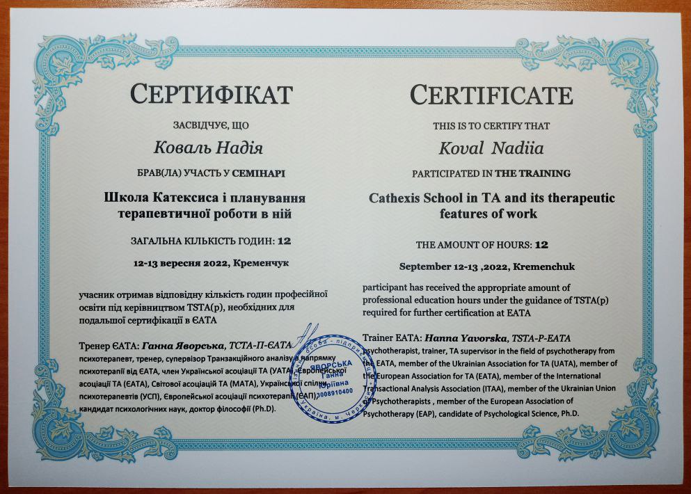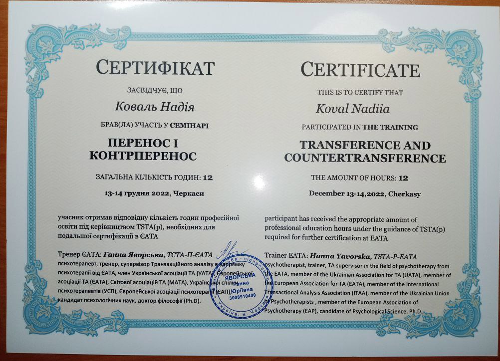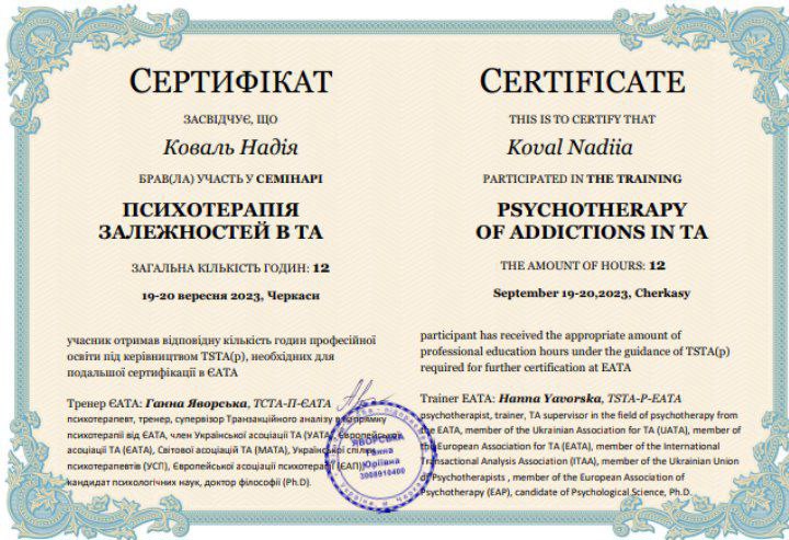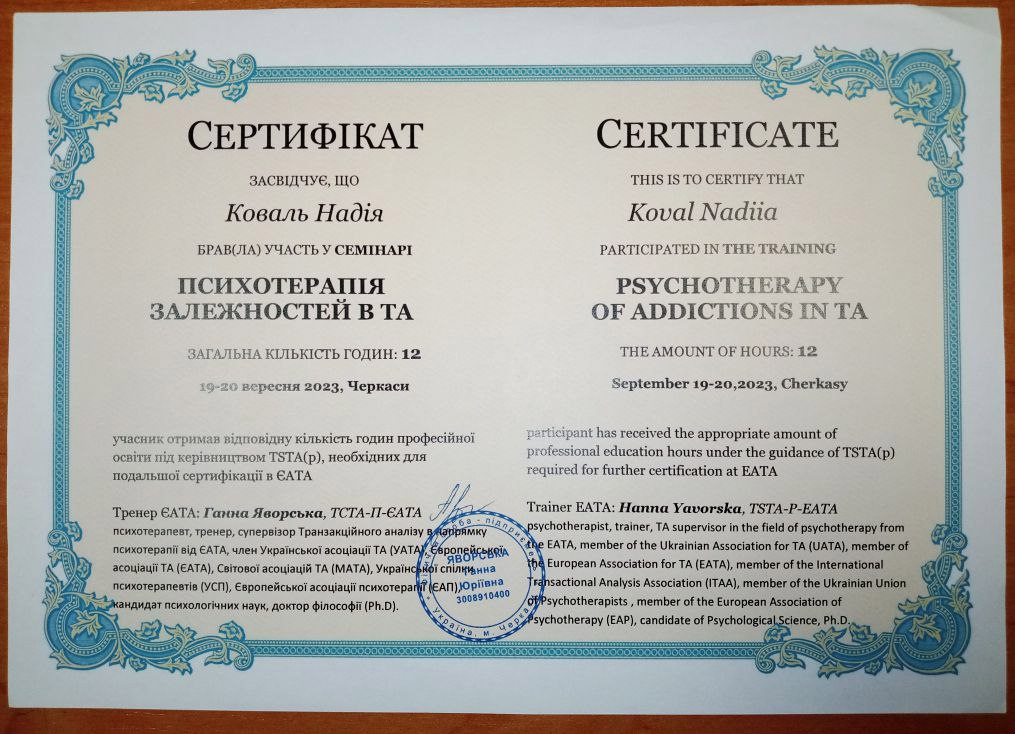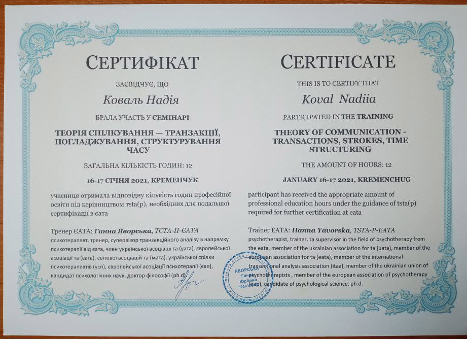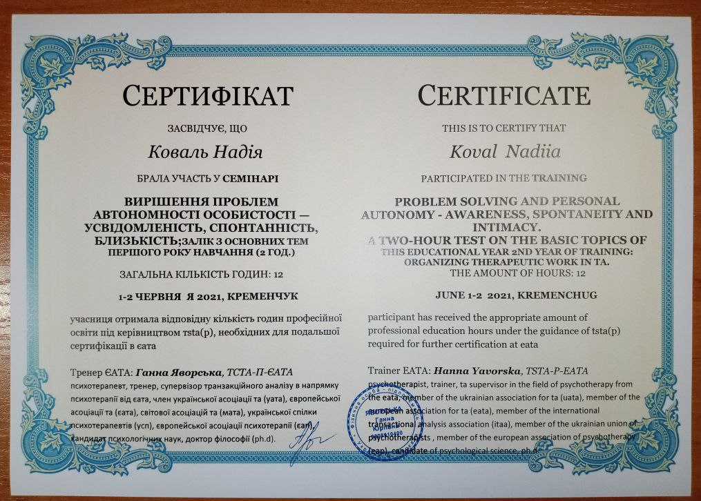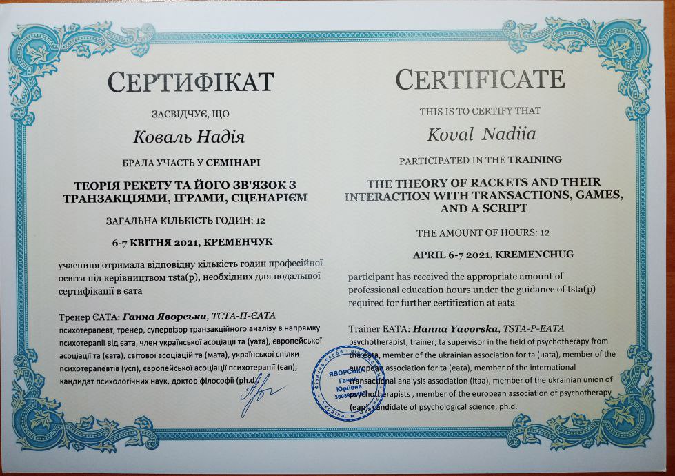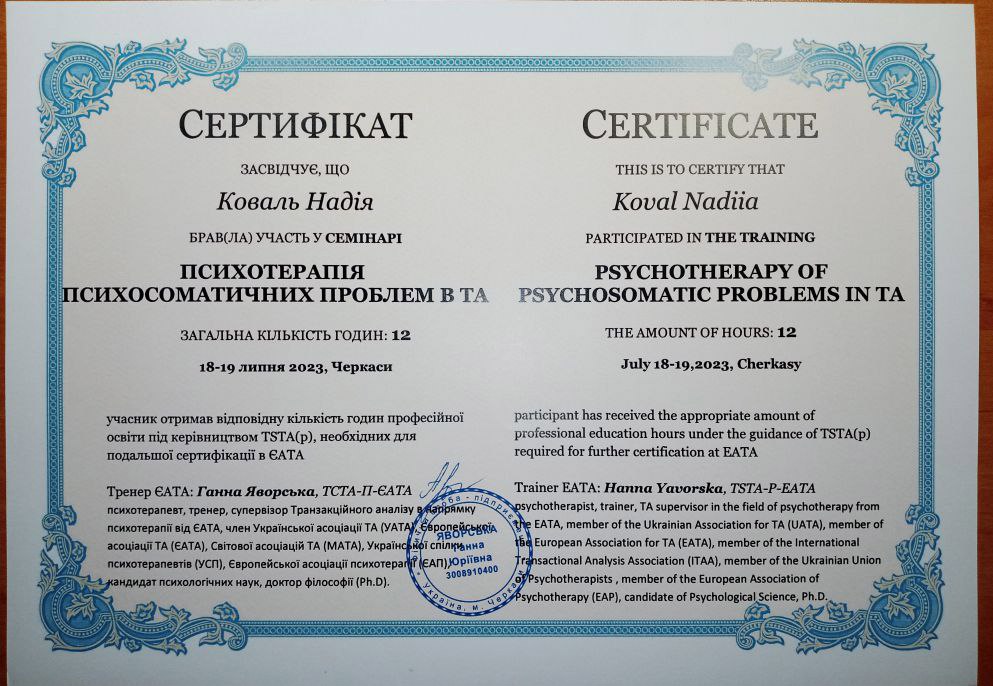 Если ты хочешь понять себя, научиться правильно выражать эмоции, научиться строить здоровые отношения с окружающими и самим собой, понять свой сценарий и строить жизнь своей мечты – приглашаю Вас на сессии в методе транзакционного анализа. Также в своей работе использую элементы Гештальт - терапии, Когнитивно - поведенческой терапии.