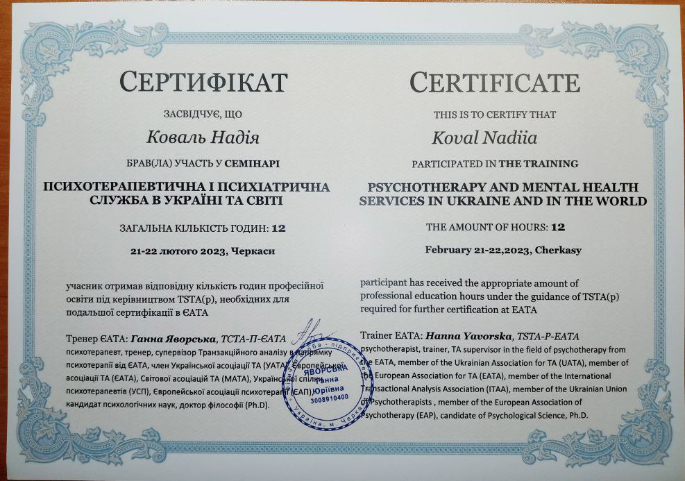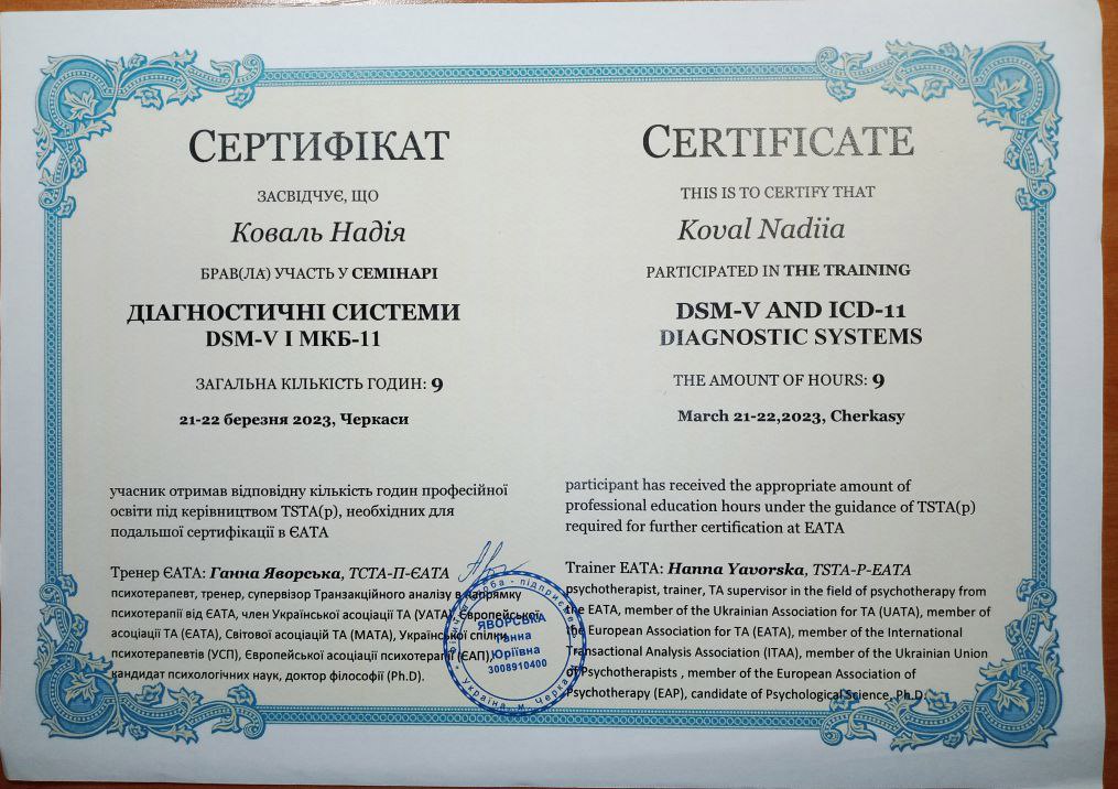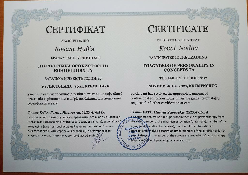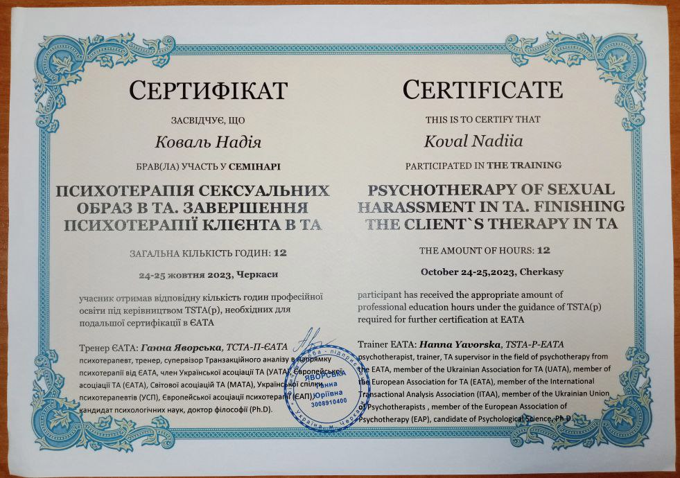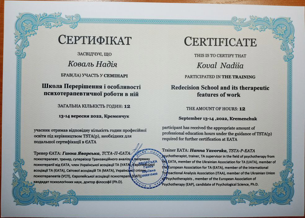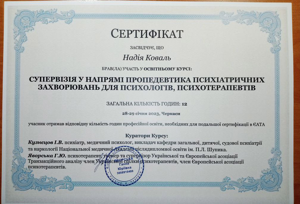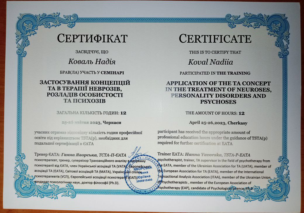 Если ты хочешь понять себя, научиться правильно выражать эмоции, научиться строить здоровые отношения с окружающими и самим собой, понять свой сценарий и строить жизнь своей мечты – приглашаю Вас на сессии в методе транзакционного анализа. Также в своей работе использую элементы Гештальт - терапии, Когнитивно - поведенческой терапии.