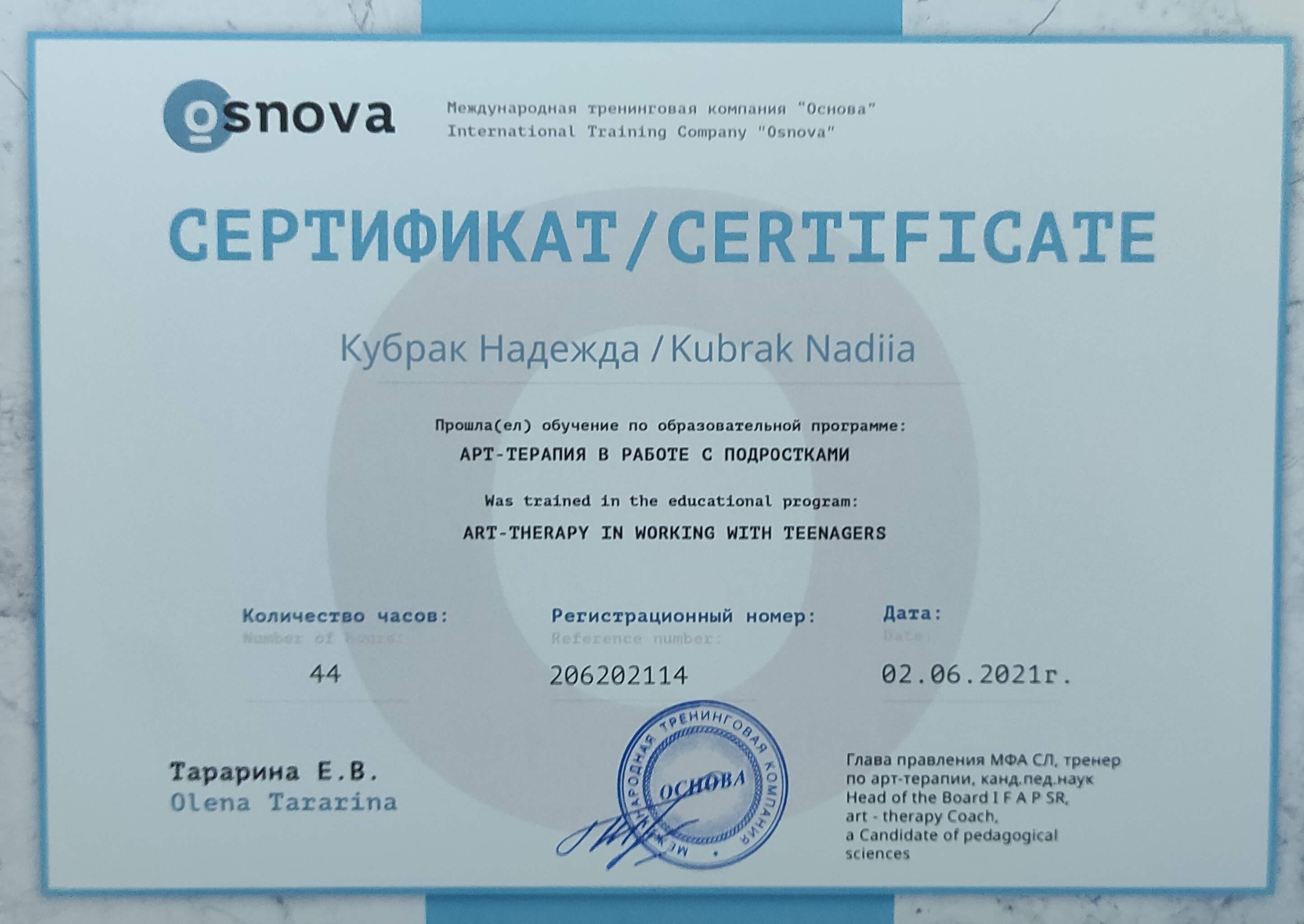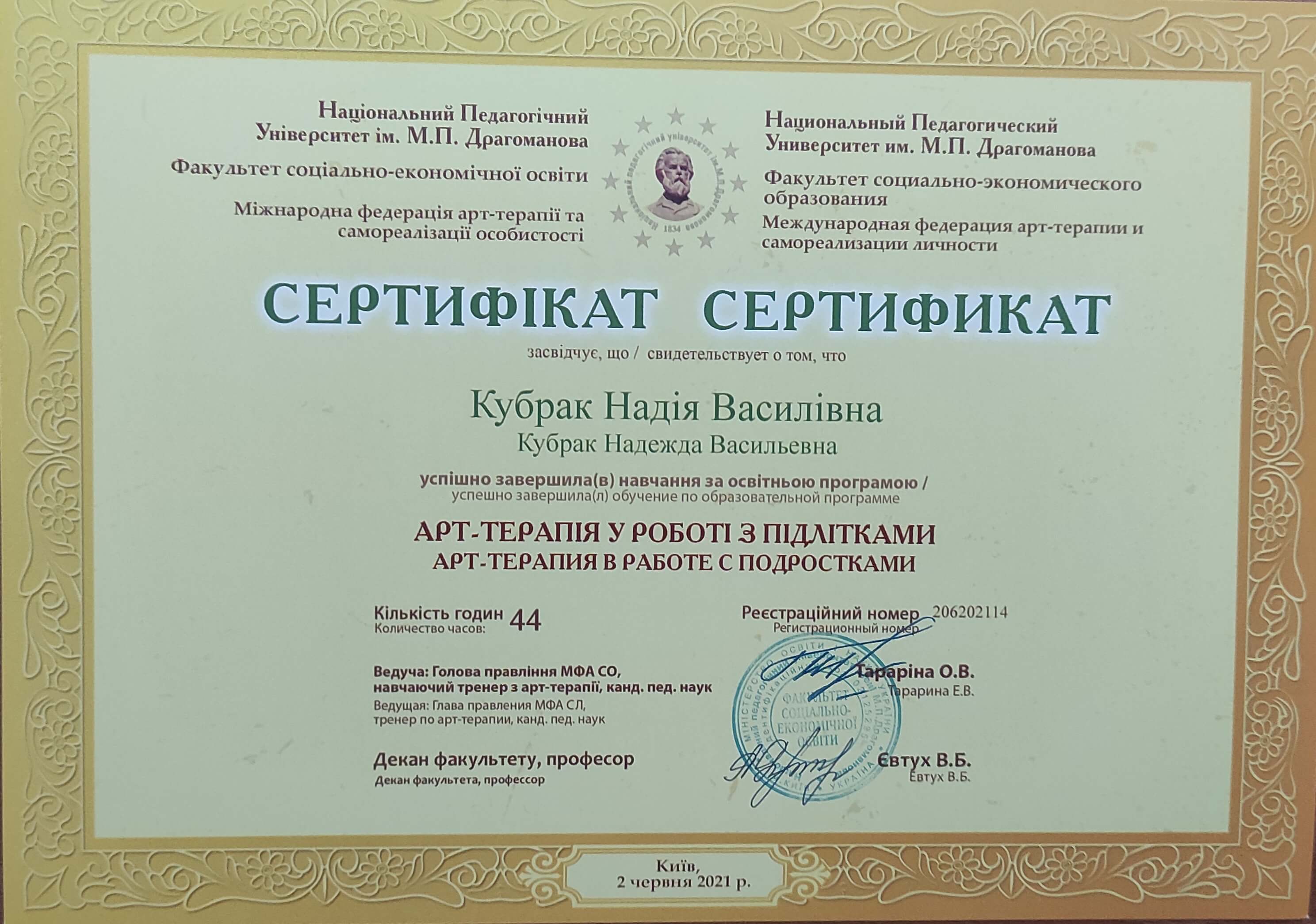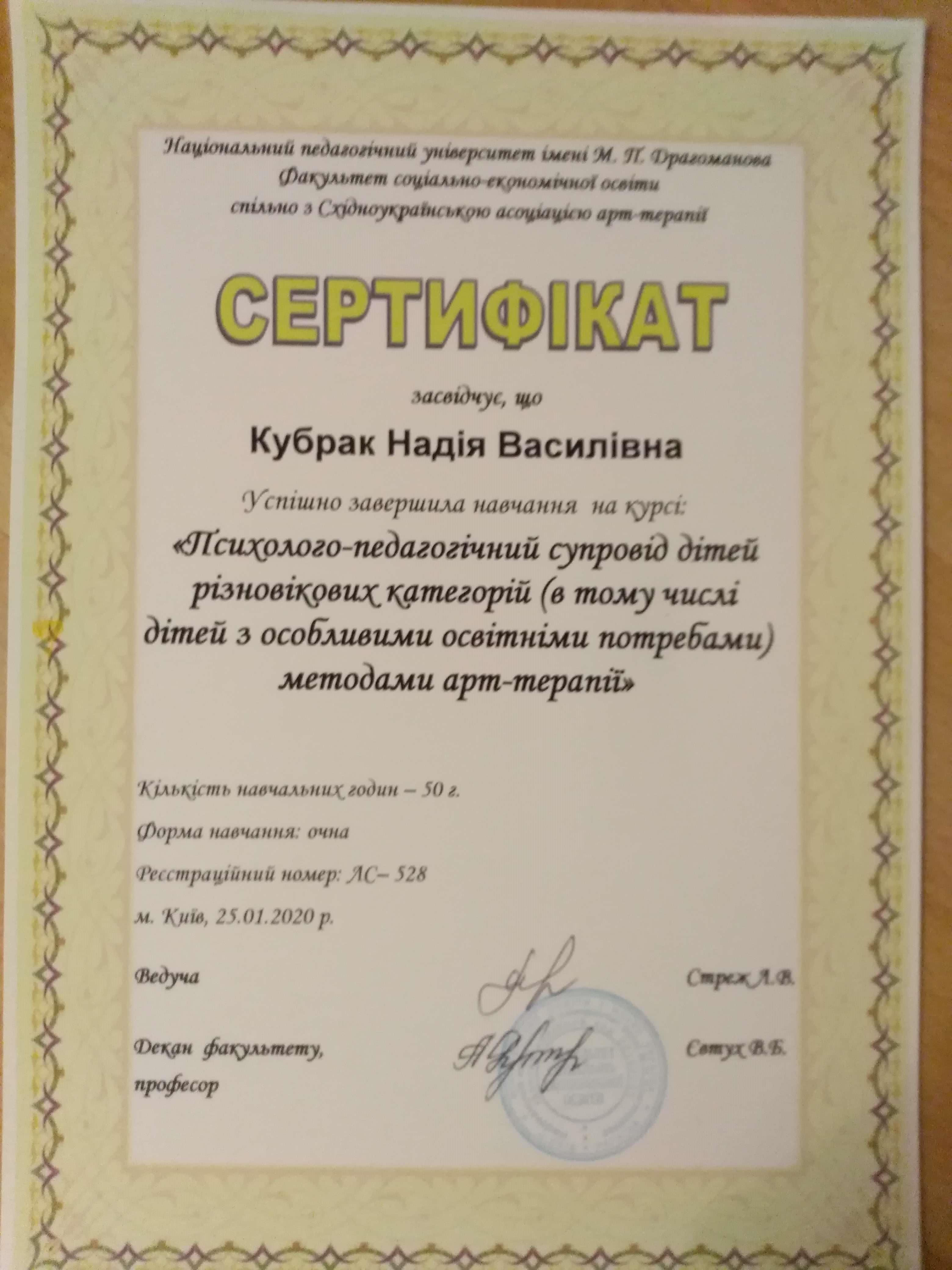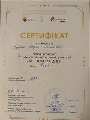 -Успішно завершила навчання на курсі: "Психолого-педагогічний супровід дітей різновікових категорій (в тому числі дітей з особливими освітніми потребами) методами арт-терапії" 2020 р. (50 год)