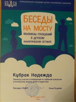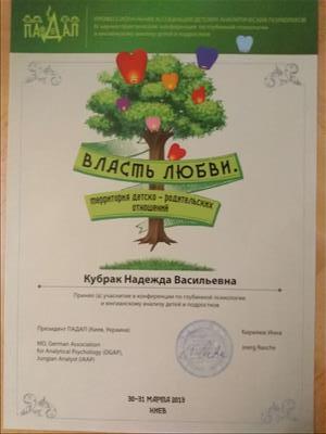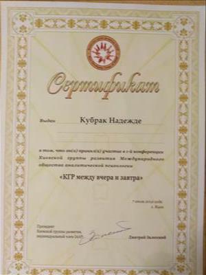 -успішно пройшла спеціалізований авторський курс "Невротичні розлади дітей дошкільного віку" від журналу "Практичний психолог:Дитячий садок" (34 год)