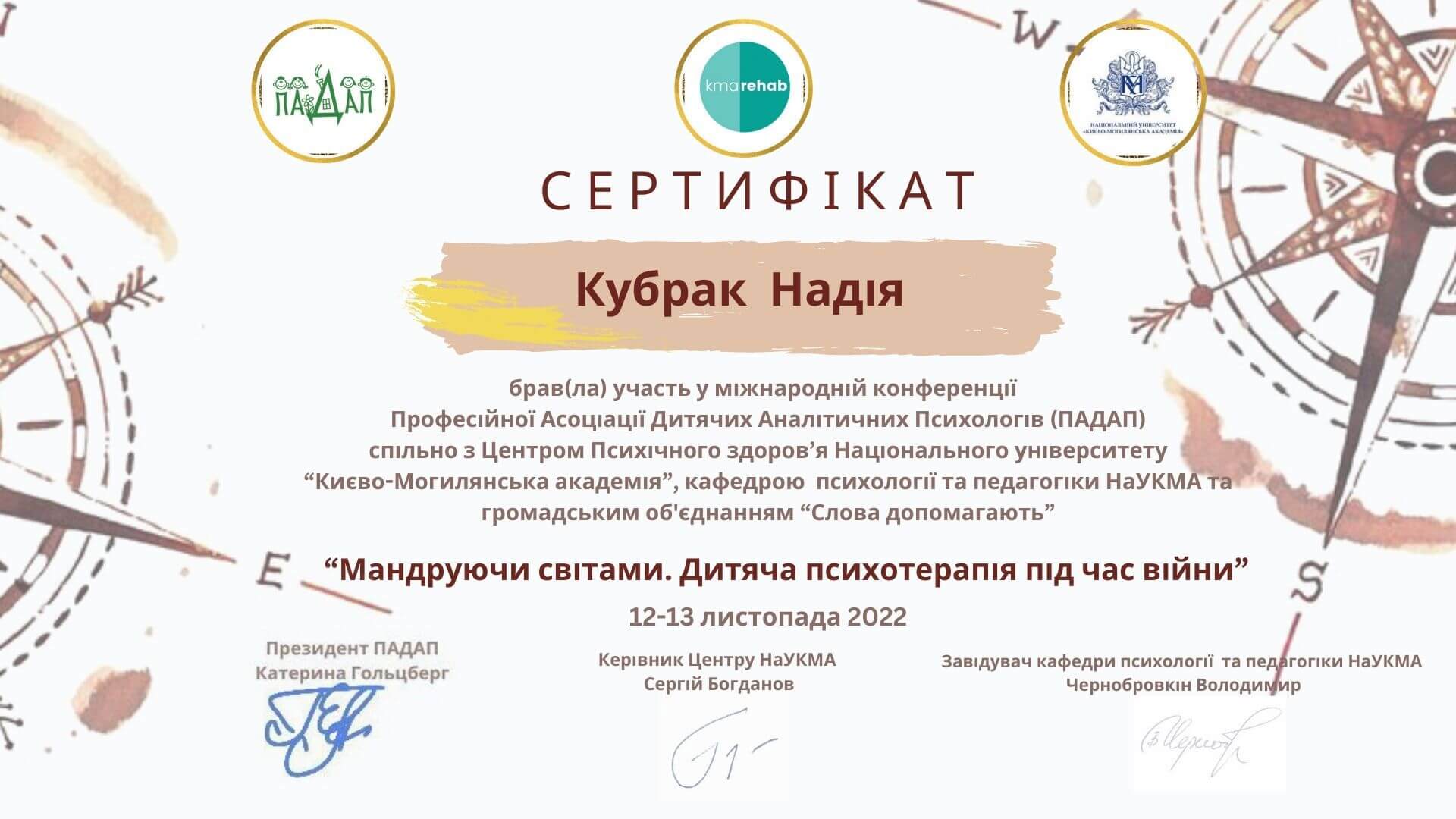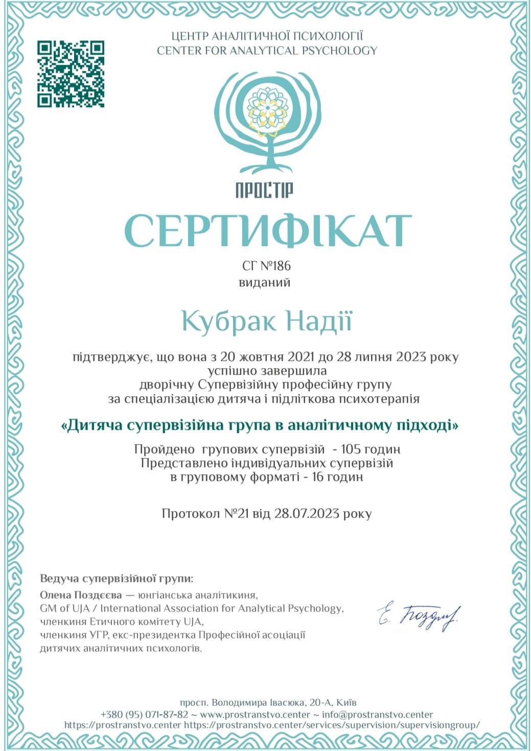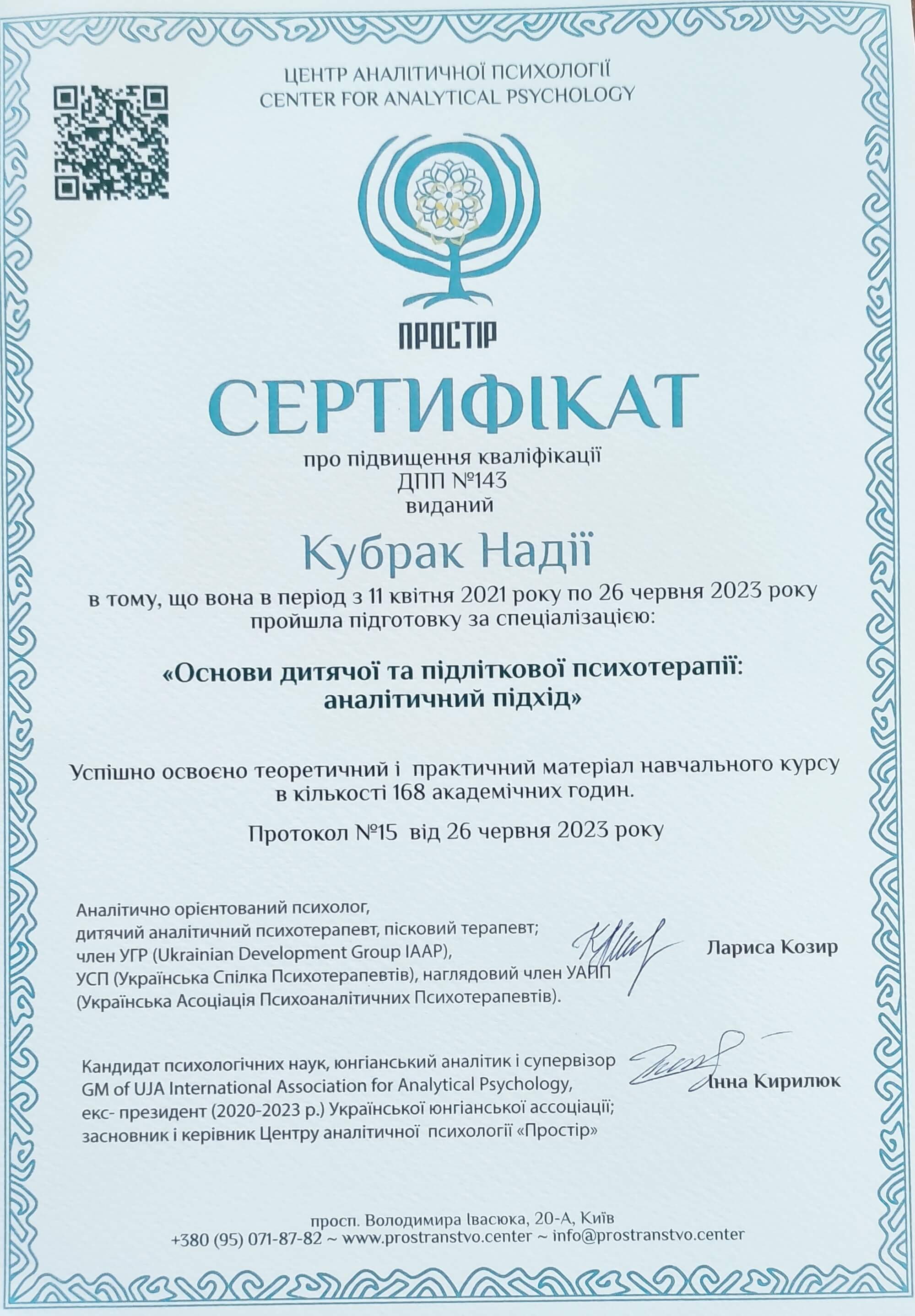 -Українська Спілка Психотерапевтів. Школа розвитку психотерапії. Закінчила курс «Пропедевтика психіатрії» 2013 р. (156 год)