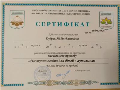 - Навчання за програмою навчального проекту "Доступна освіта для дітей з аутизмом 2016 р. (30 год)
