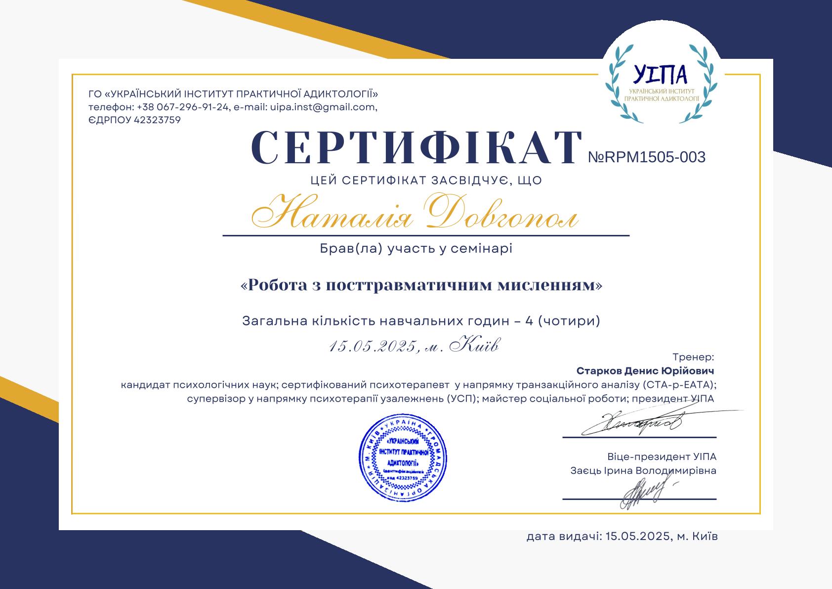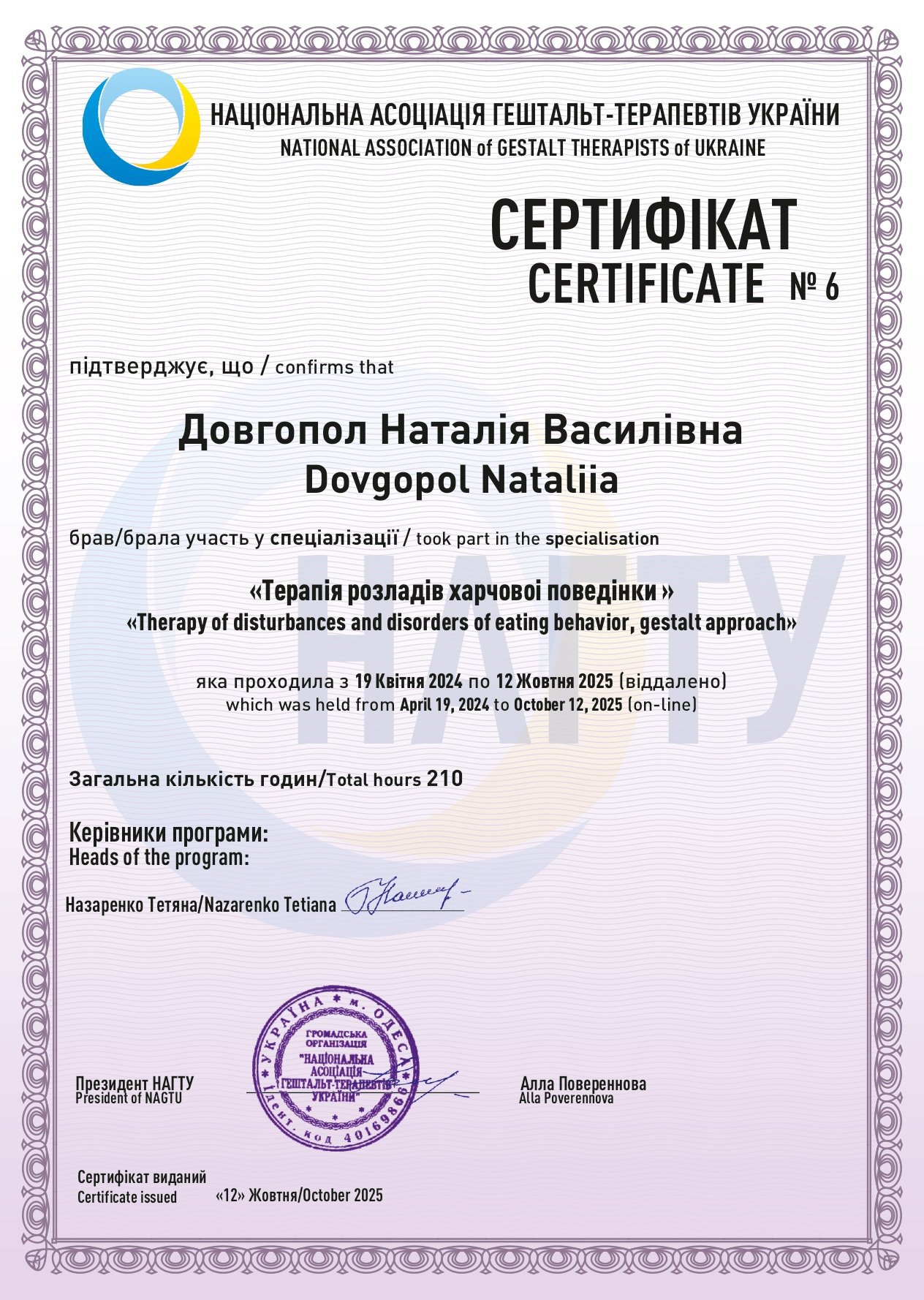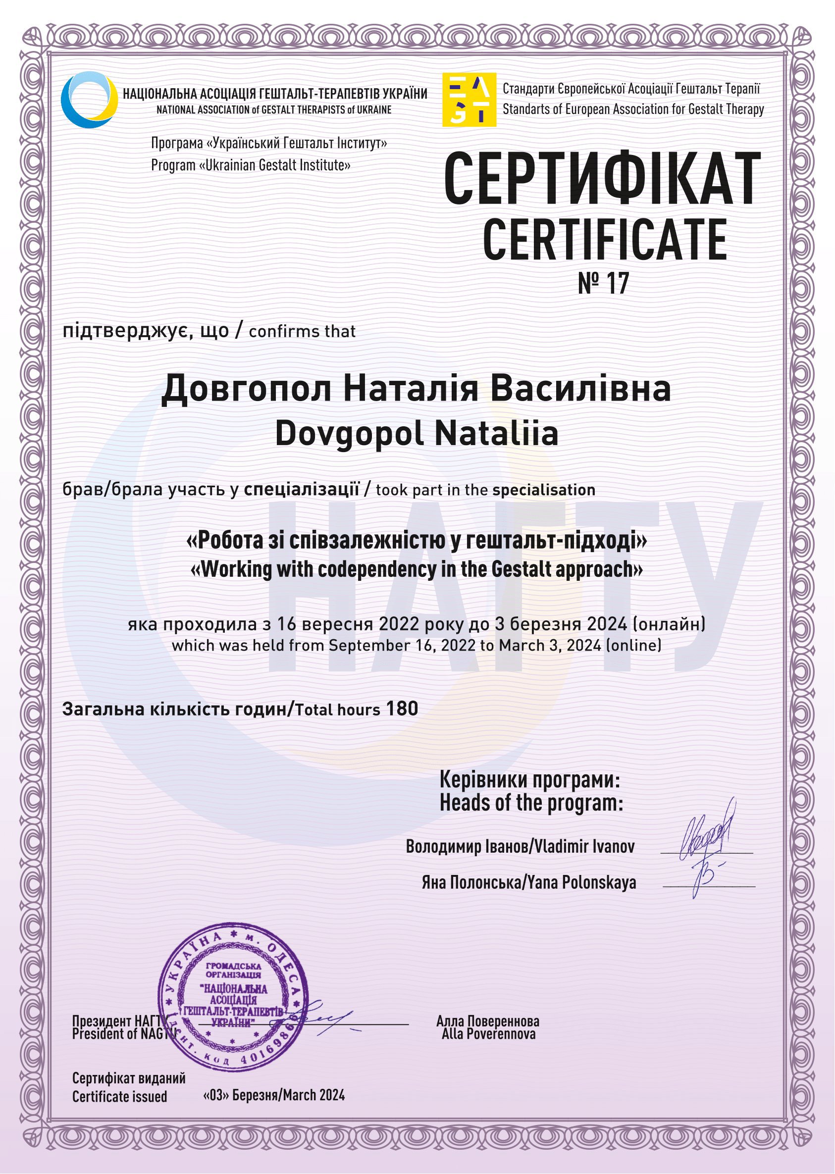 Национальная ассоциация гештальт-терапевтов Украины (НАГТУ), 2 степень, закончена специализация по работе с созависимостью в гештальт подходе. Я являюсь членом НАГТУ. Имею опыт собственной, групповой терапии, участвую в супервизорских группах, участник конференций и других образовательных мероприятий в сфере психологии. Работаю под регулярным супервидением.
