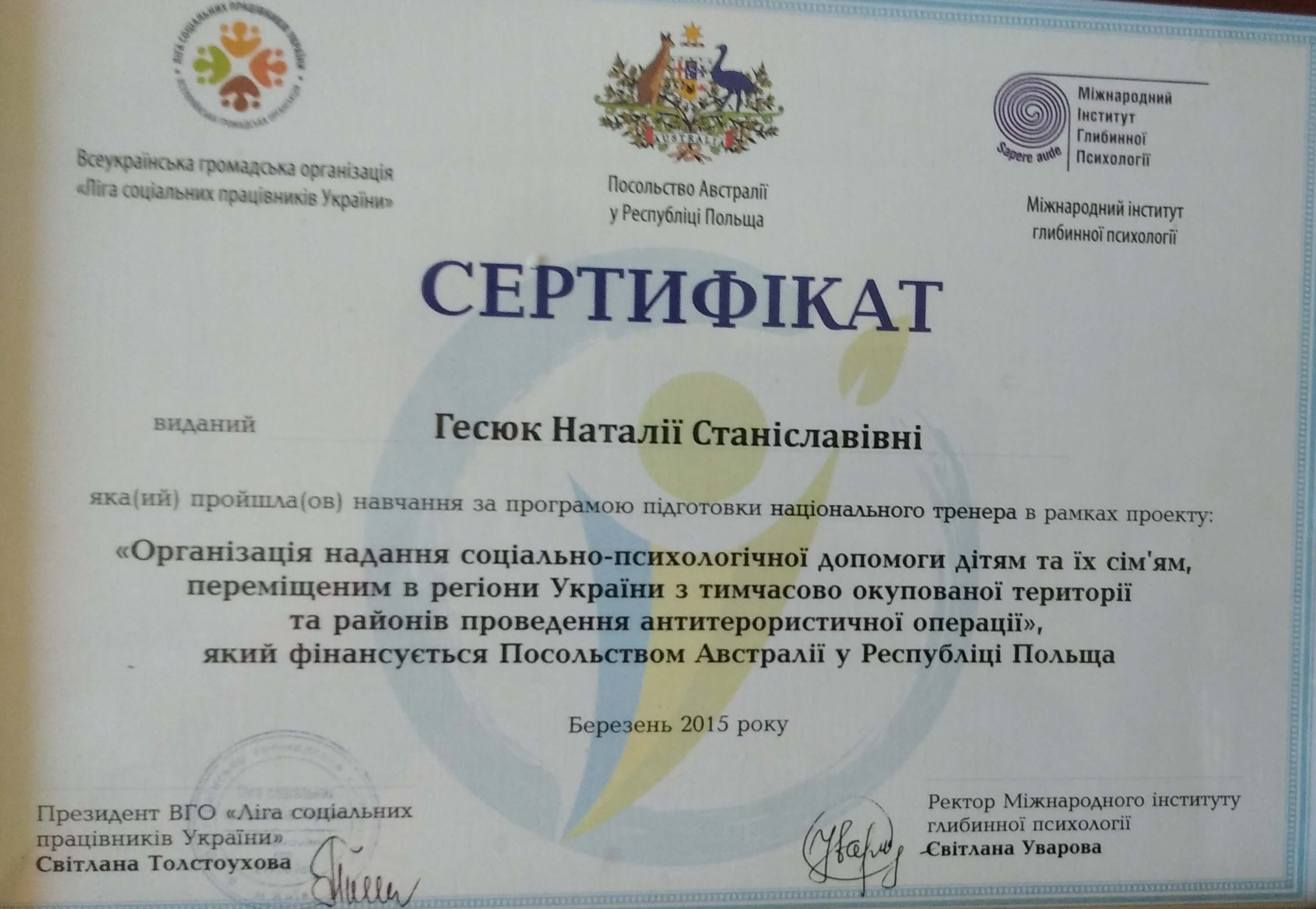 - 2015 г. Национальный тренер по проекту "Организация оказания социально-психологической помощи детям и их семьям, перемещенным в регионы Украины из временно оккупированной территории и районов проведения антитеррористической операции" (сертификат Международного института глубинной психологии" при поддержке Посольства Австрии в Украине)