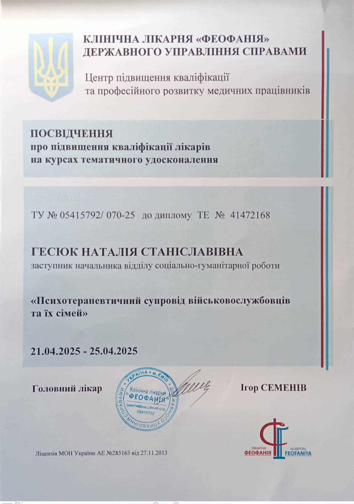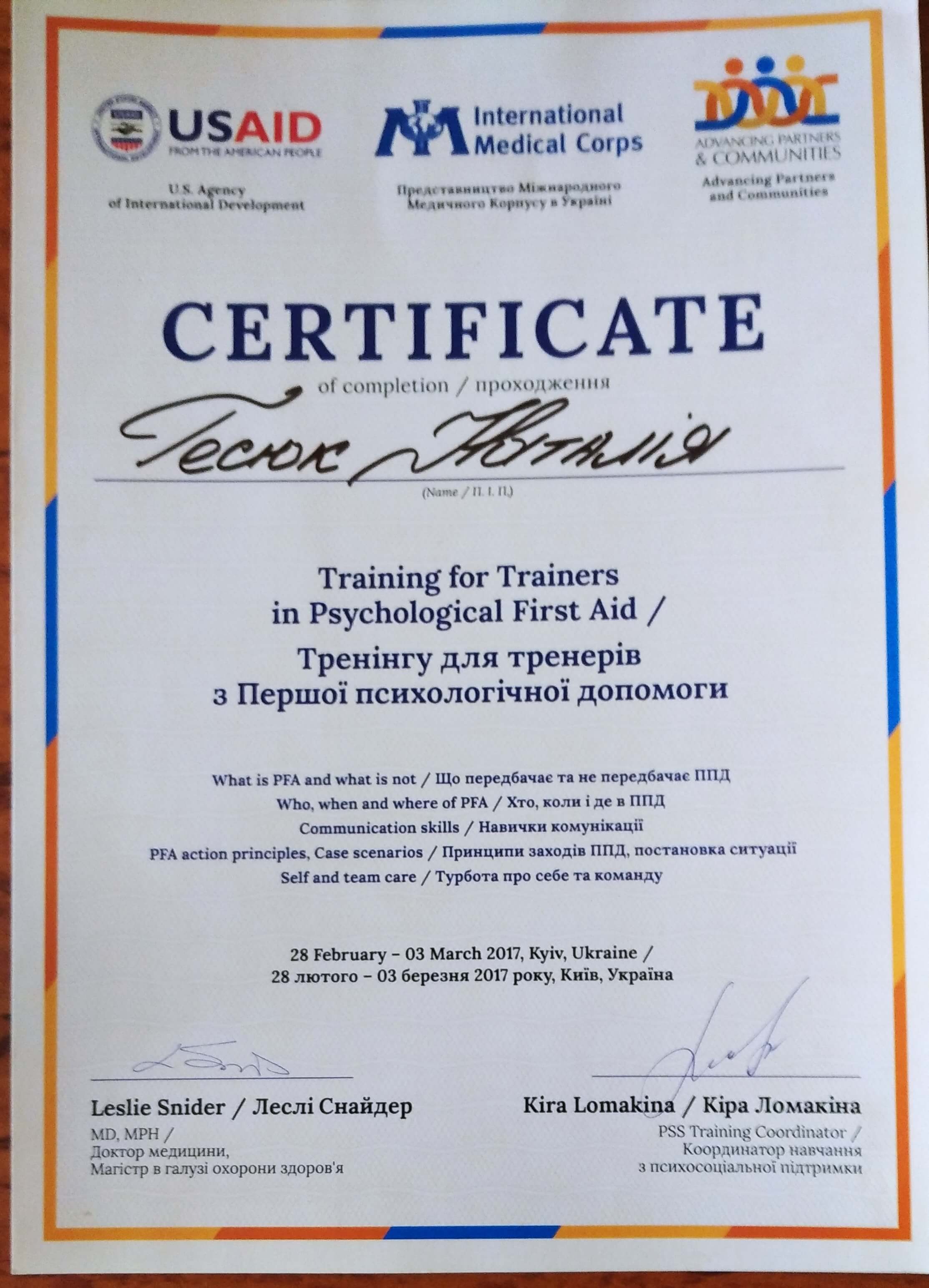 2018 г. - Львовский университет безопасности жизнедеятельности (работа со стрессом, навязчивыми мыслями, паническими атаками; методы работы с горем; ранняя травматизация)