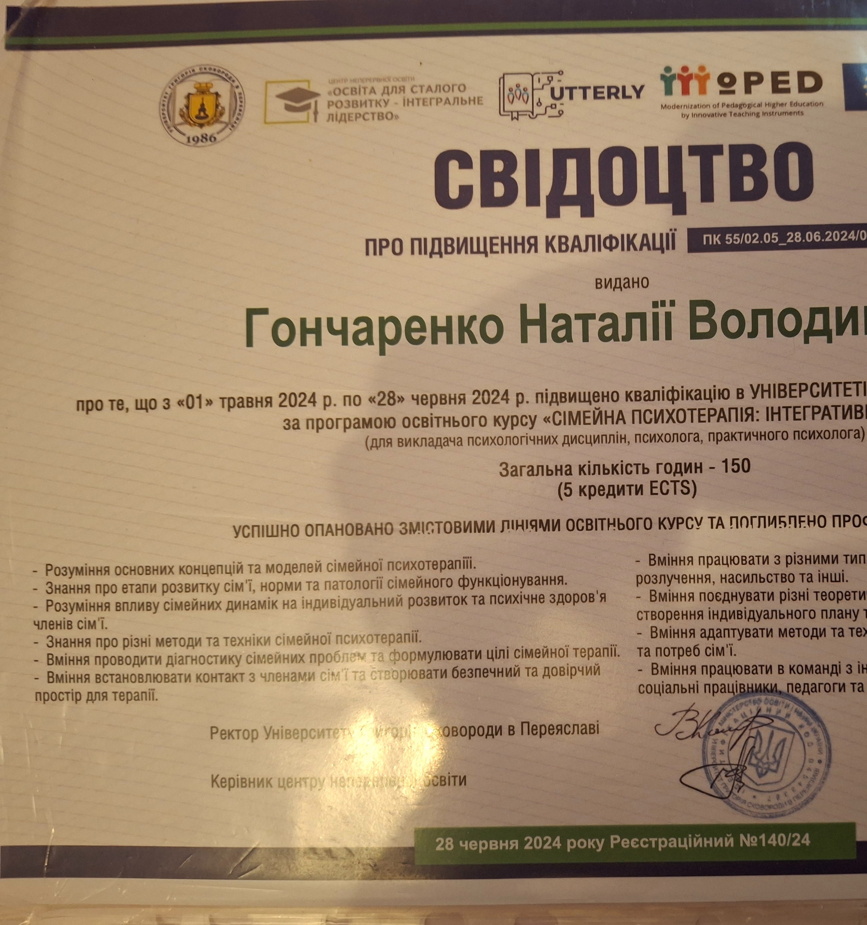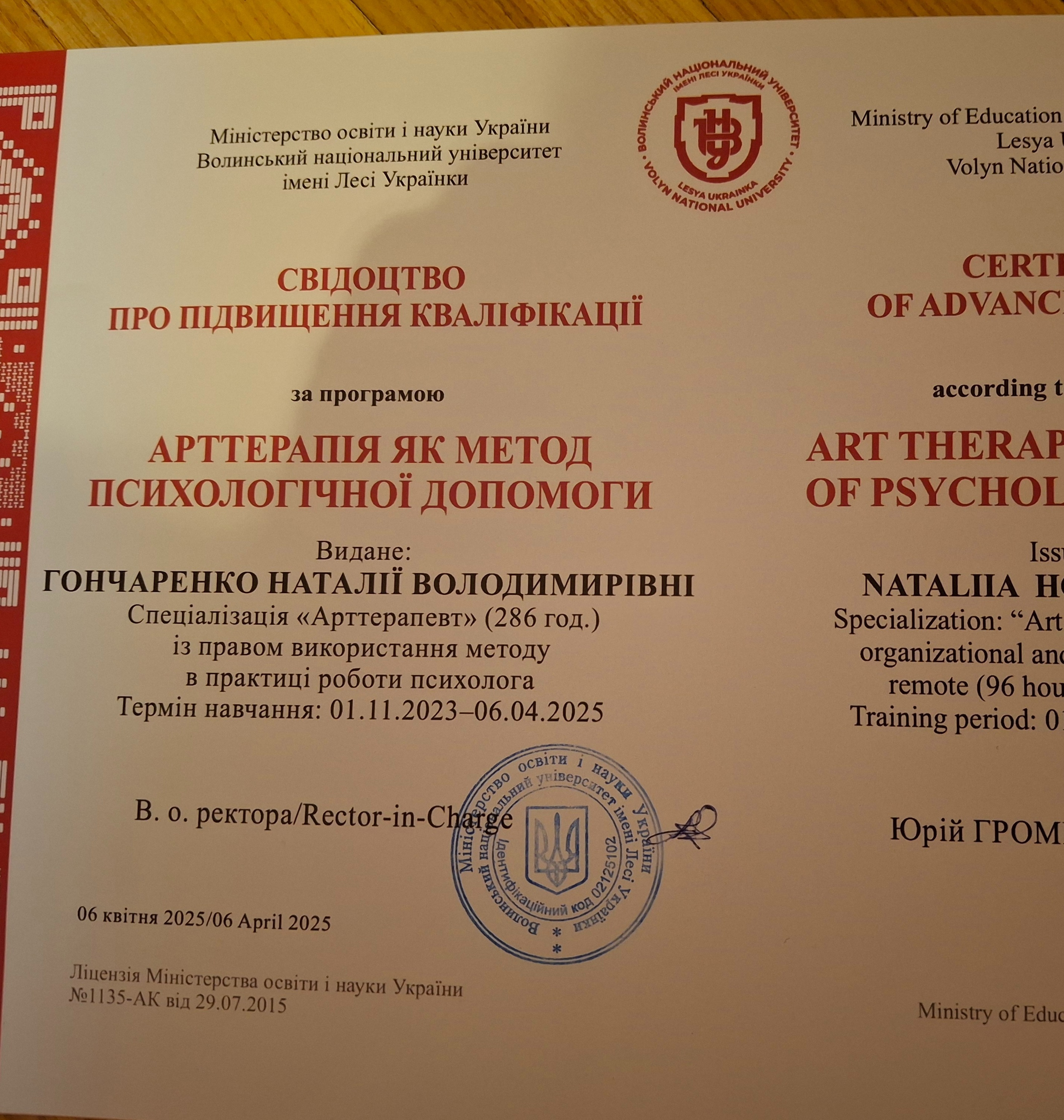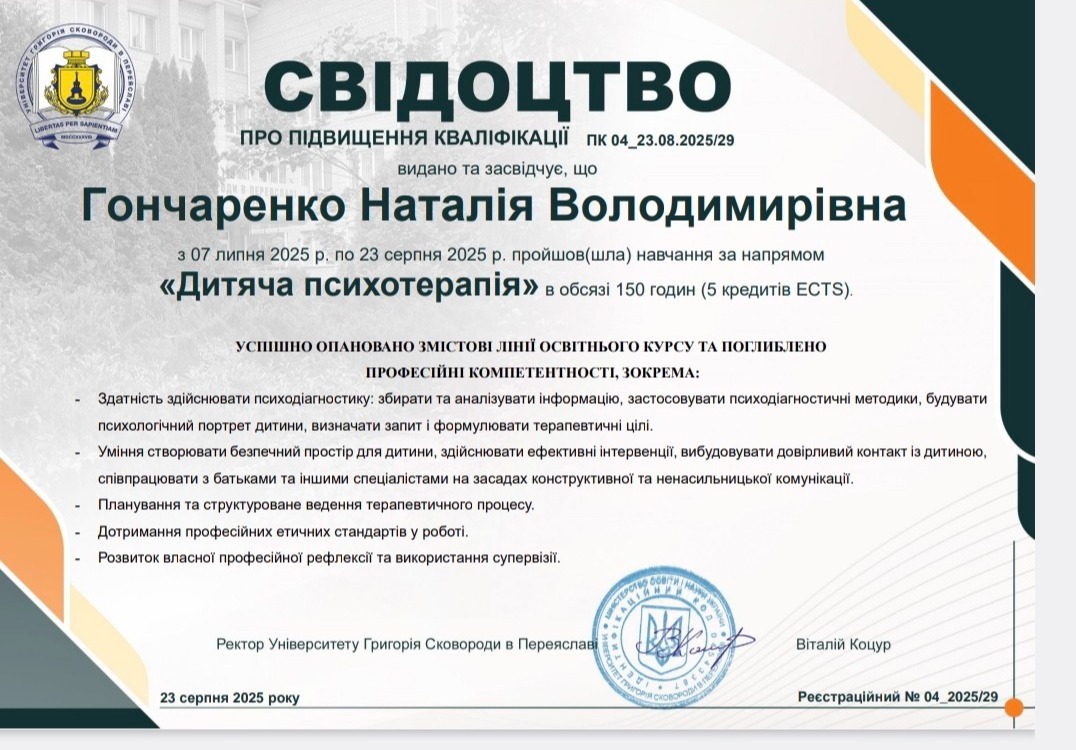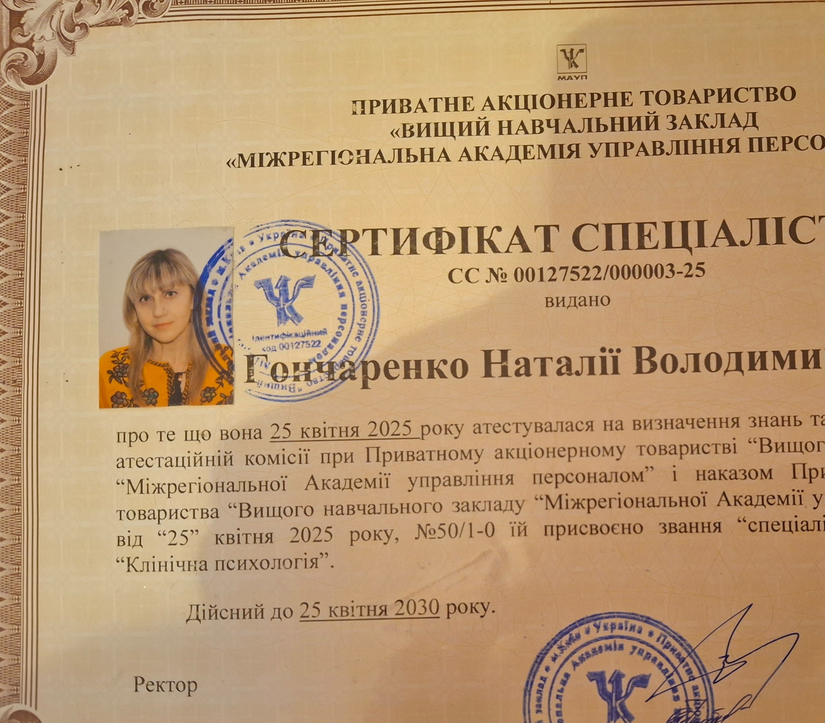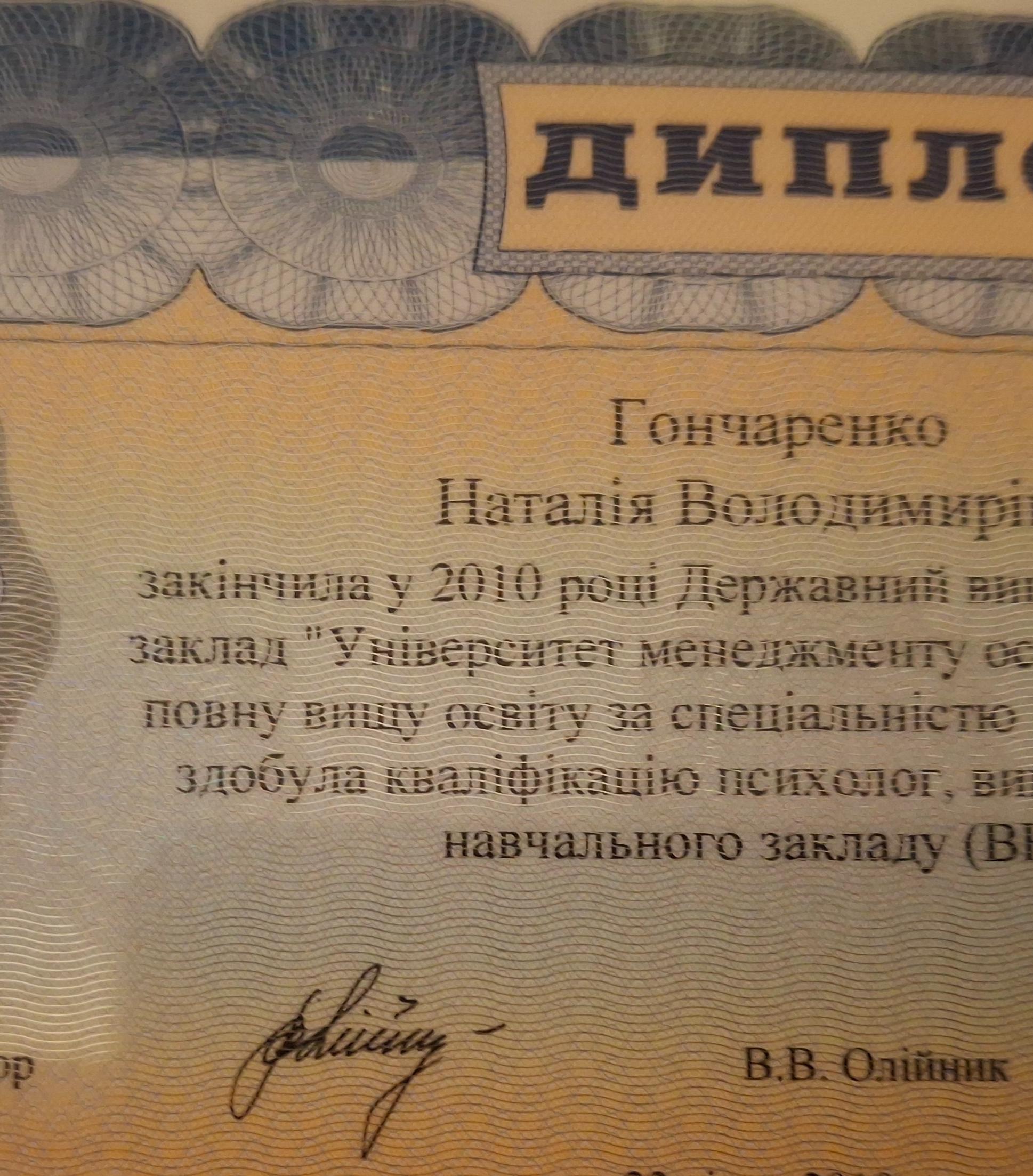 НМУ им. Богомольца, аспирантура по специальности "медицинская психология", защитила диссертацию в 2015 году. НПУ им. Драгоманова, дефектологический факультет, Университет менеджмента образования (2010), факультет психологии, Одесский психоаналитический институт (2025), УИКПТ училась на годовой программе КПТ+), перинатальная психология и сейчас учусь на Схема-терапии; имею сертификат Арттерапевта Переяслав-Хмельницкий университет (2025 г.),травматерапевта (учебный центр Натальи Саблиной,специализация по клинической психологии и аттестация на клинического психолога МАУП, специализация по психотерапии в Донецком медицинском университете, обучение по нейропсихологии при кафедре соматических медицины.