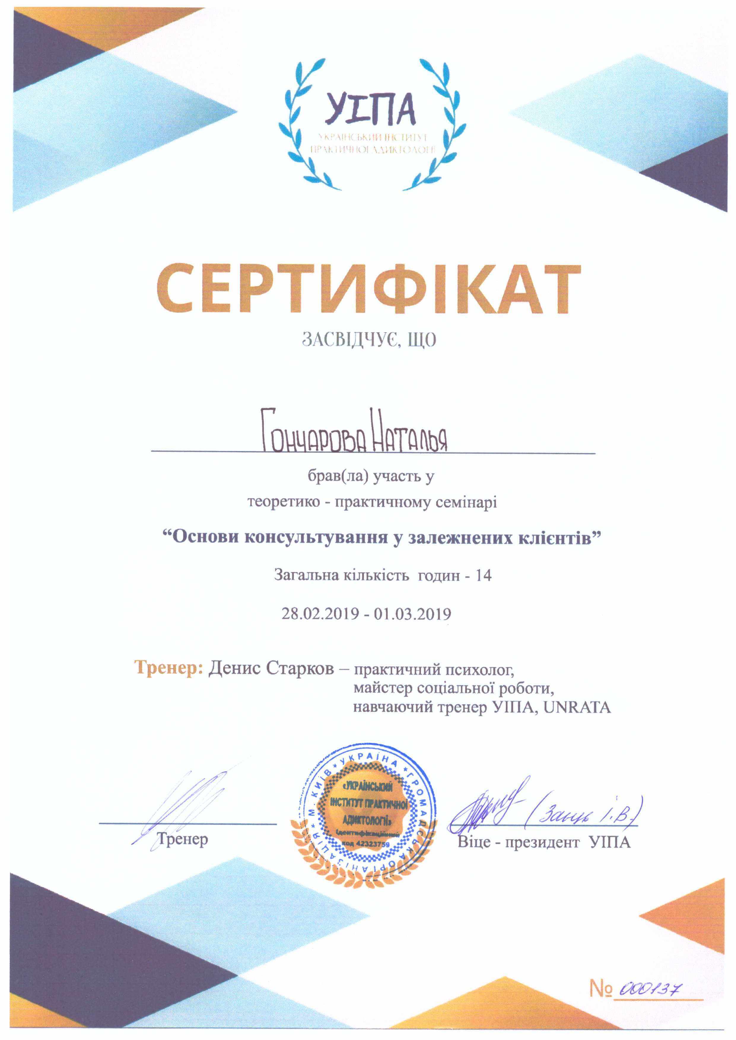 – Украинский научно-методический центр практической психологии и социальной работы, курс "Теория и практика психологического консультирования" (14.10.2016-11.10.2018н.р.);