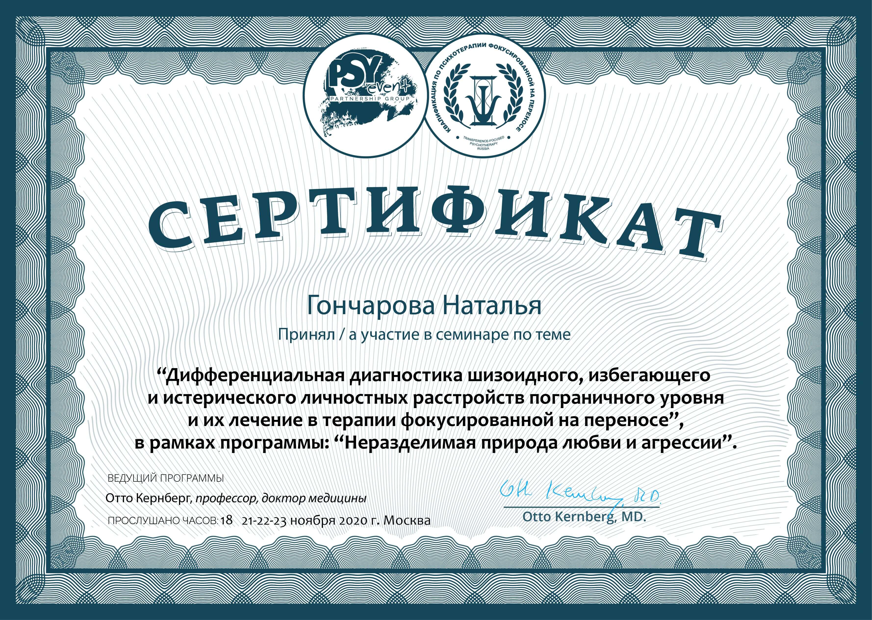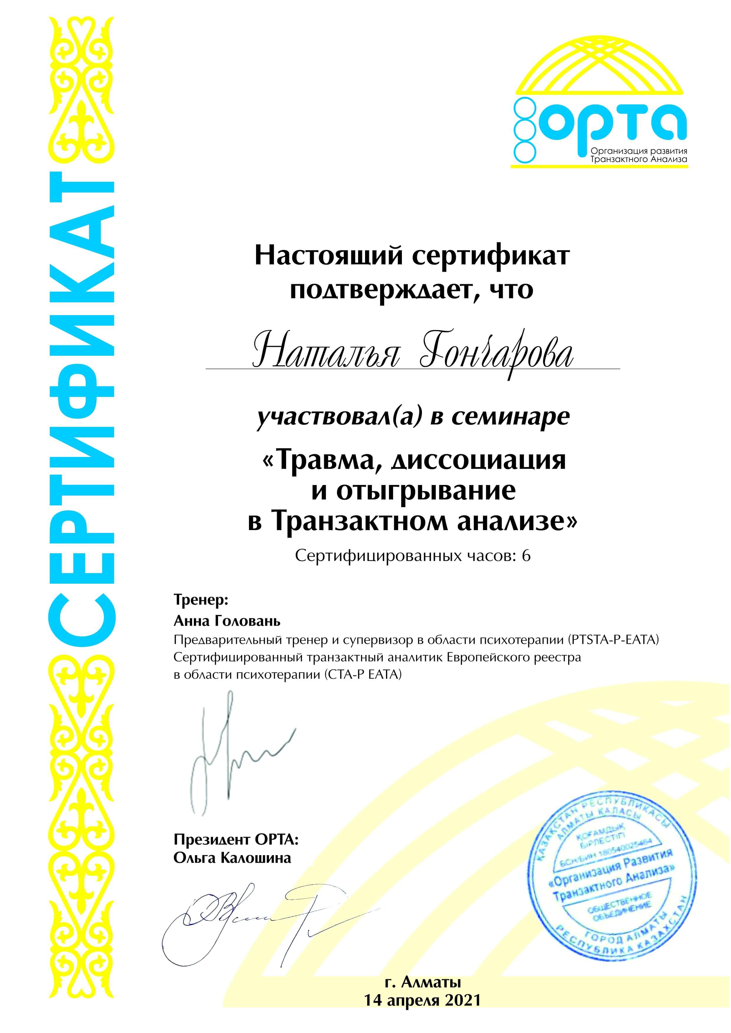 - украинское сообщество транзакционного анализа, 4-х летняя программа подготовки в методе транзакционного анализа по направлению Психотерапия (04.12.2016-01.11.2020н.р.);