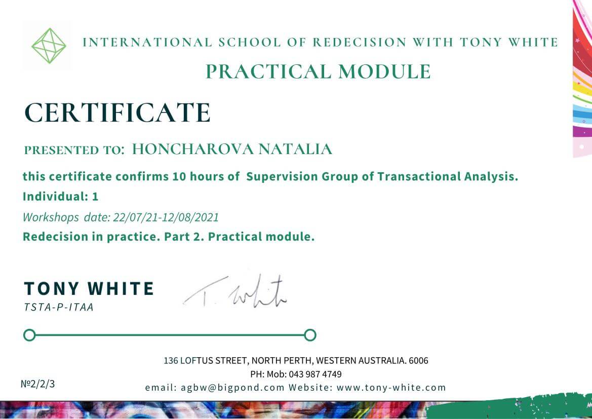 - Интернациональная школа Пререшения с Тони Уайтом, курс повышения квалификации в Транзакционном анализе. Пререшение в практике (11.03.2021 – 17.06.2021н.г.);