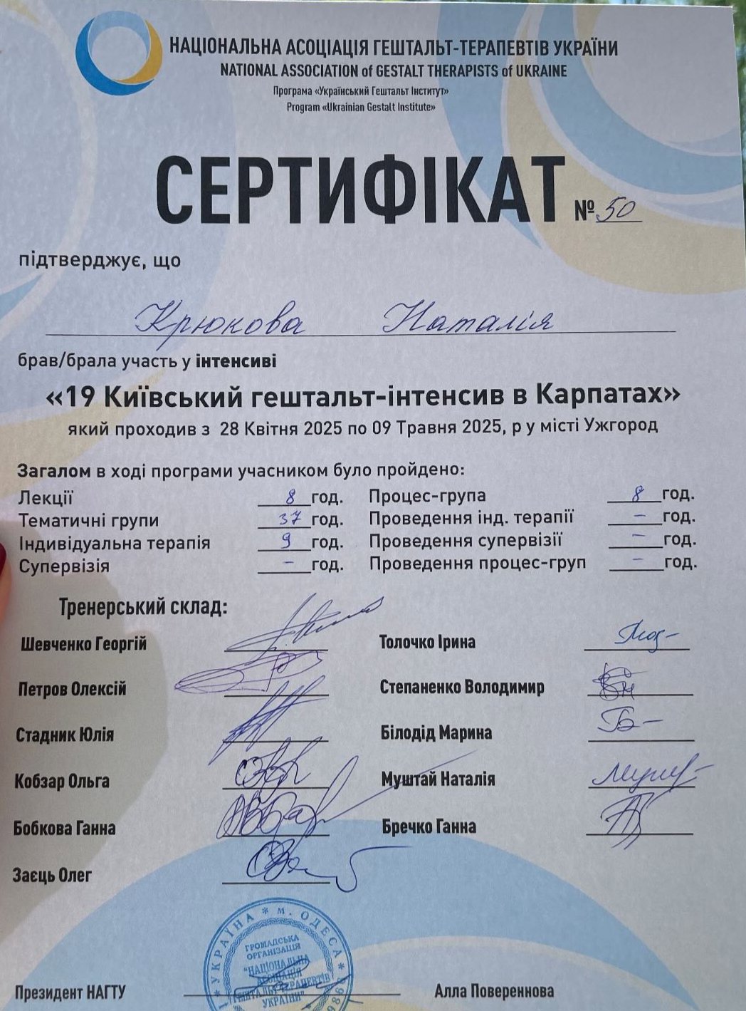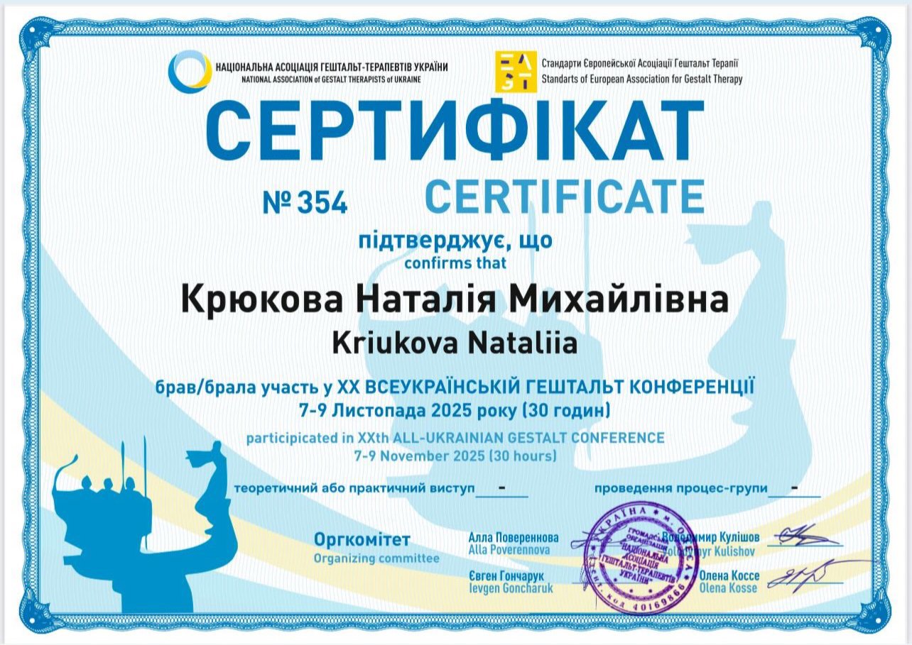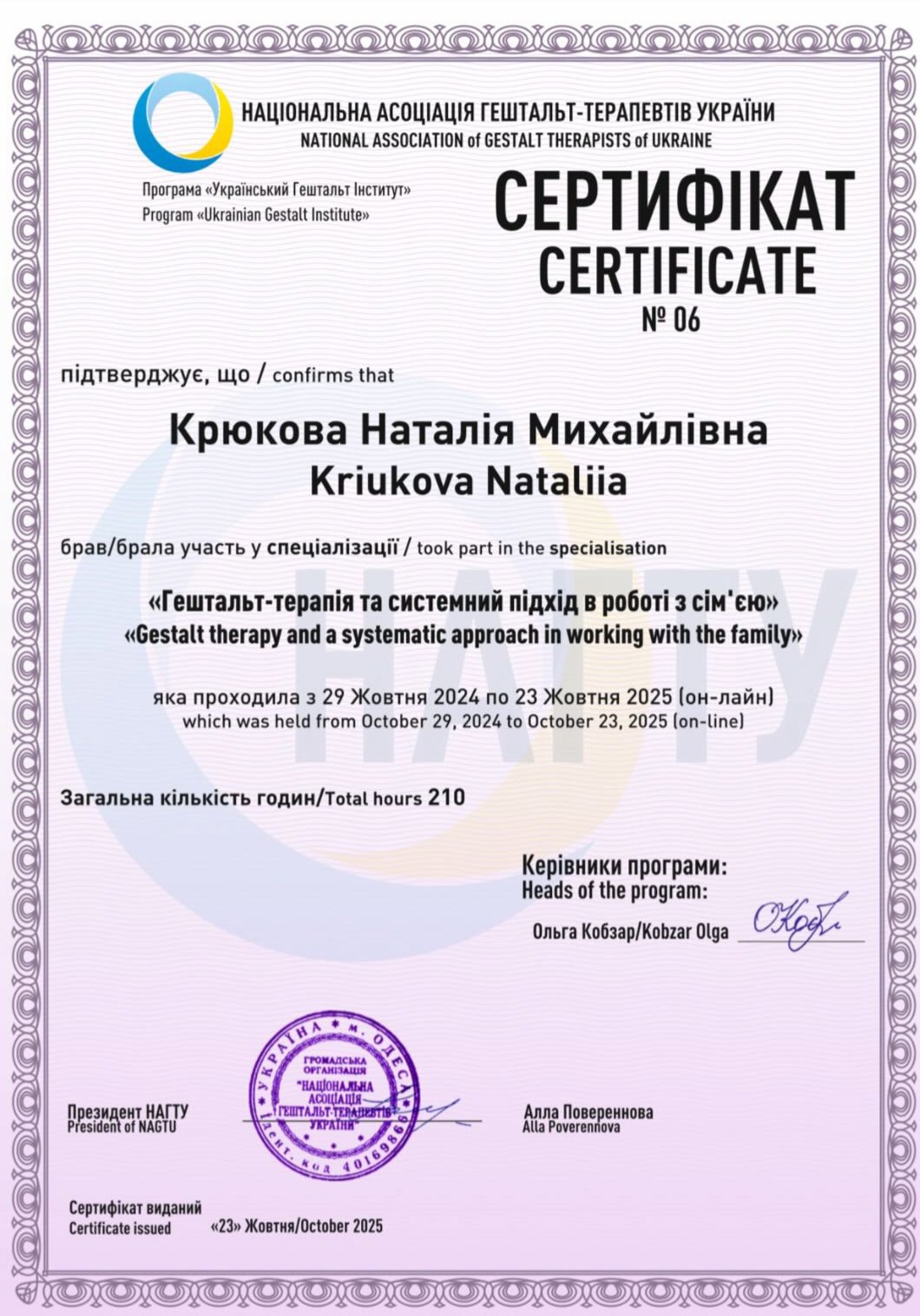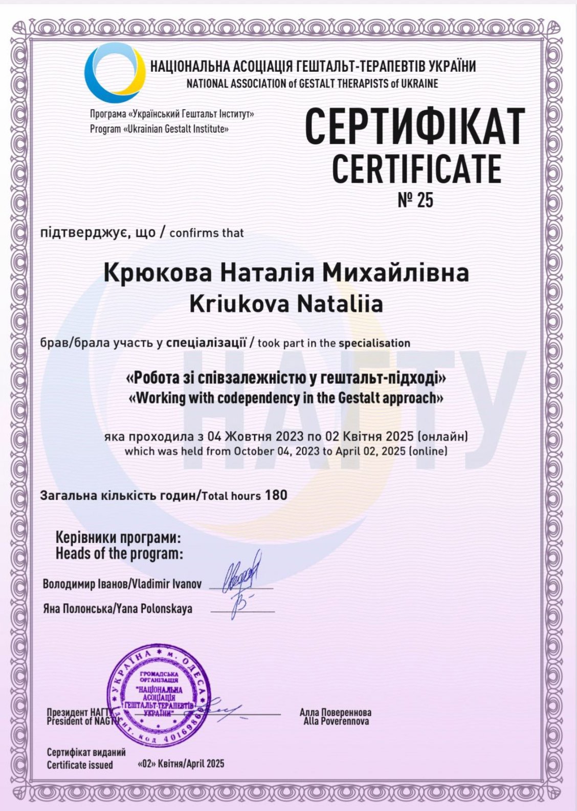 - Украинский Гештальт Институт – специализация "Созависимость" (дата окончания-апрель 2025 года);
