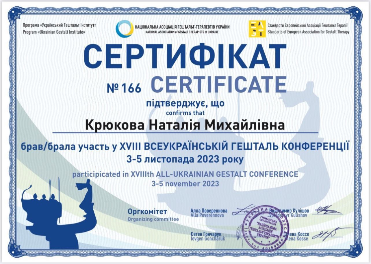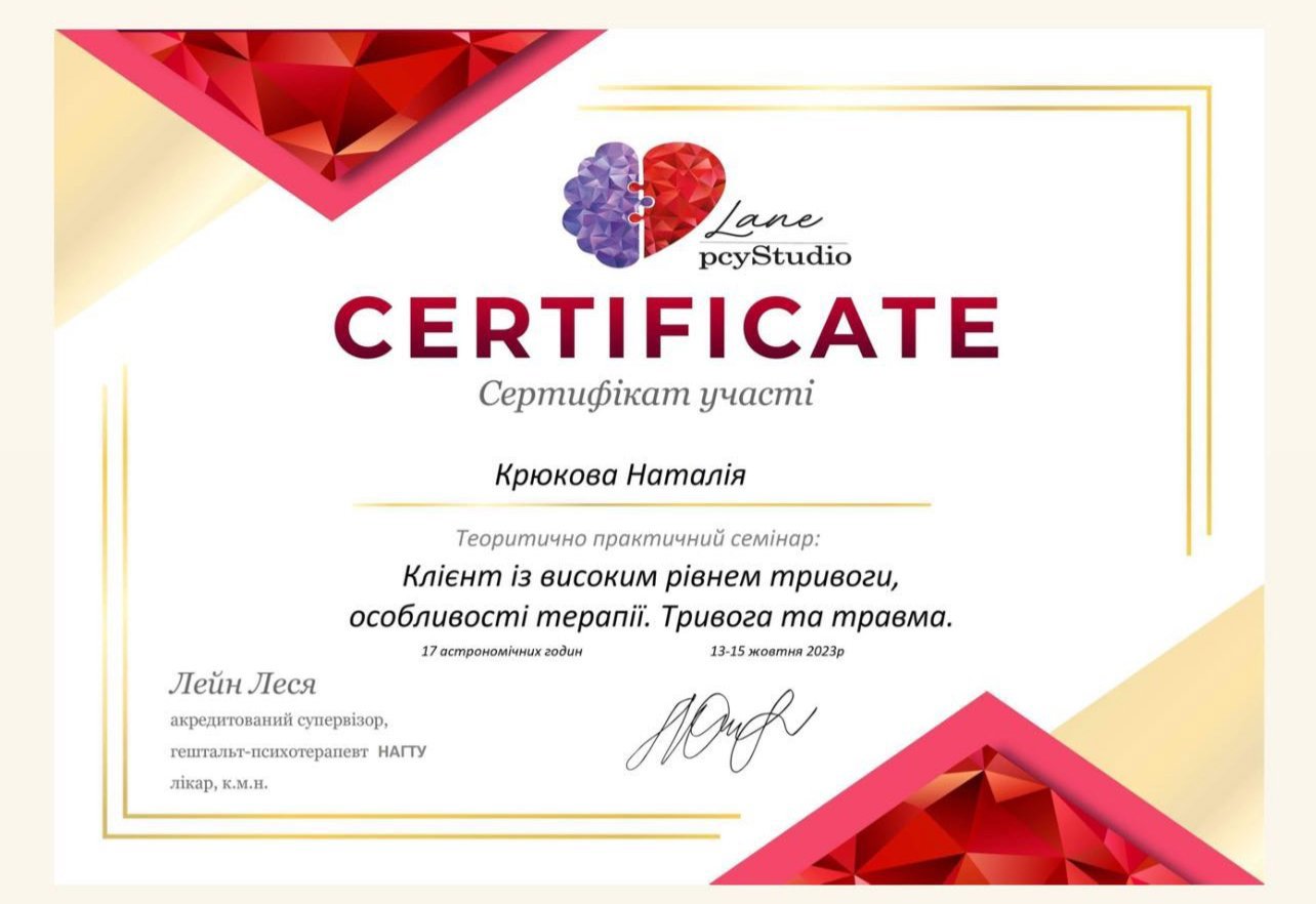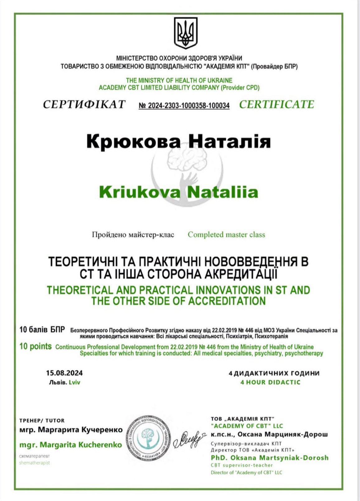 - Украинский Гештальт Институт – специализация "Созависимость" (дата окончания-апрель 2025 года);
