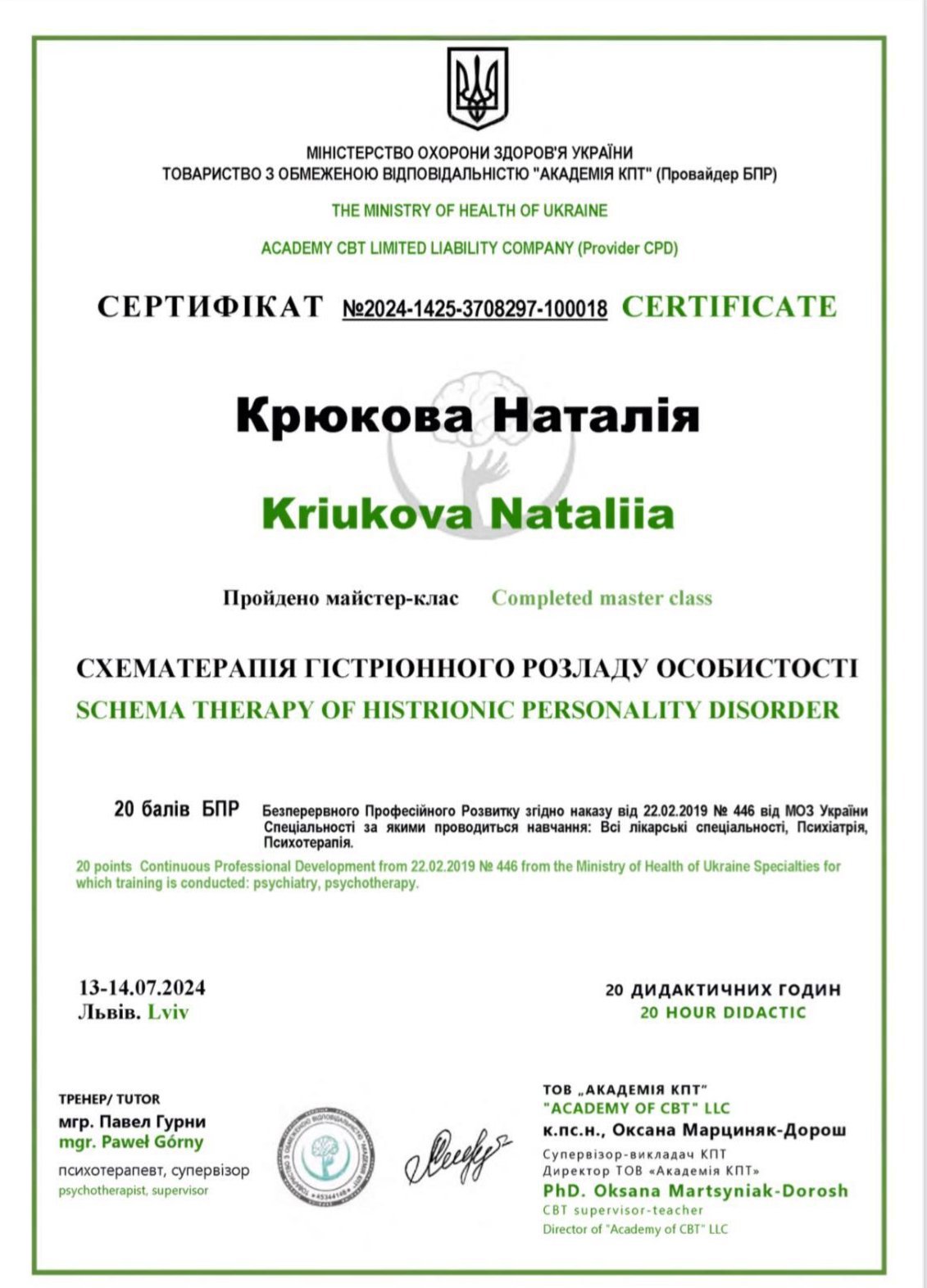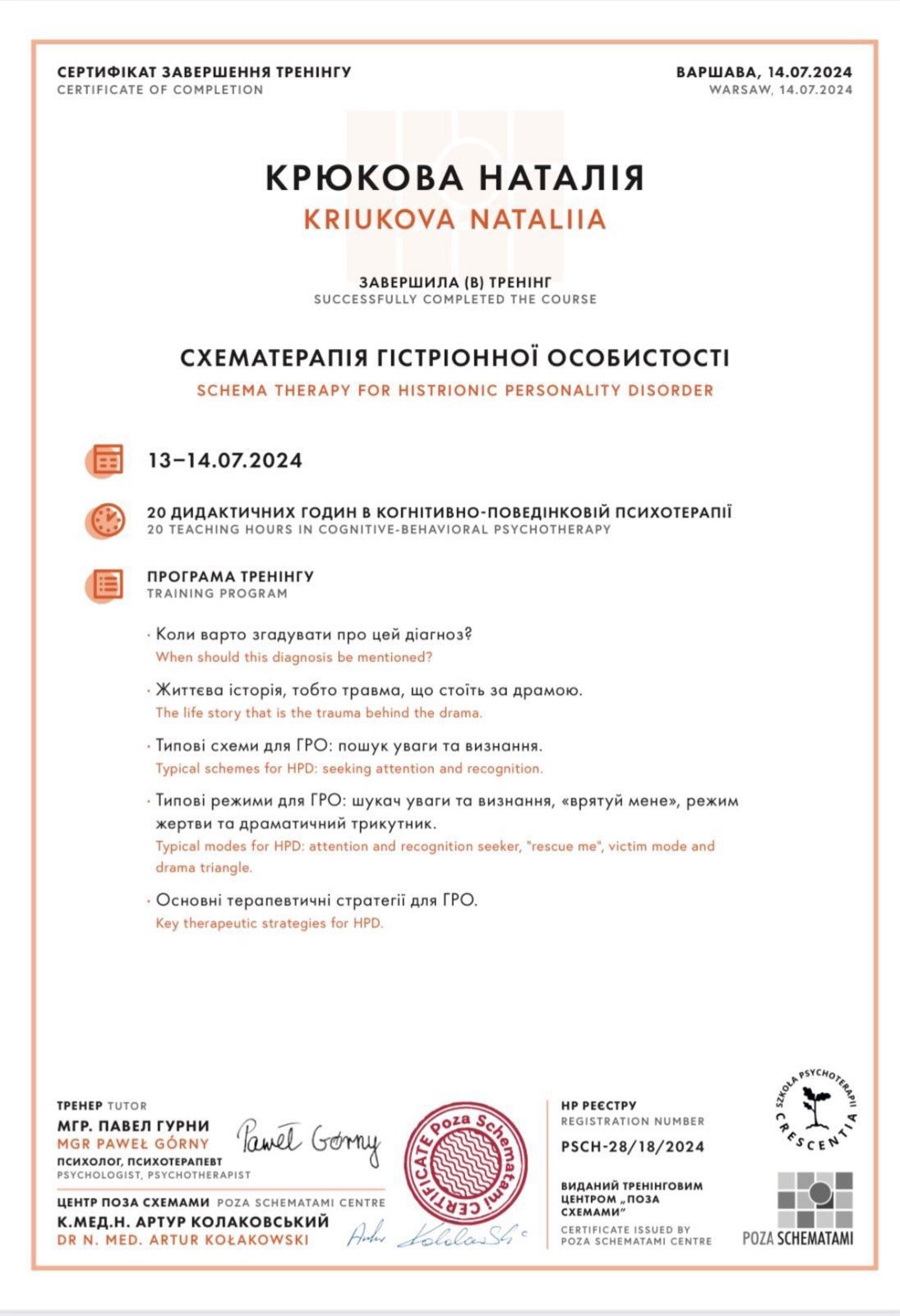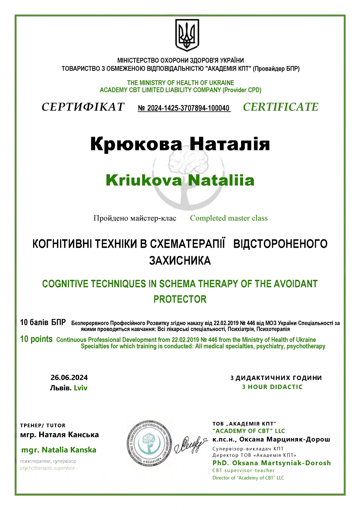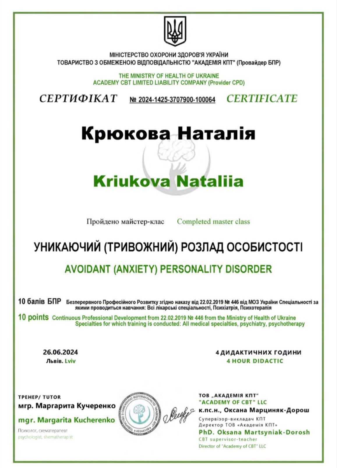 - Украинский Гештальт Институт – специализация "Созависимость" (дата окончания-апрель 2025 года);