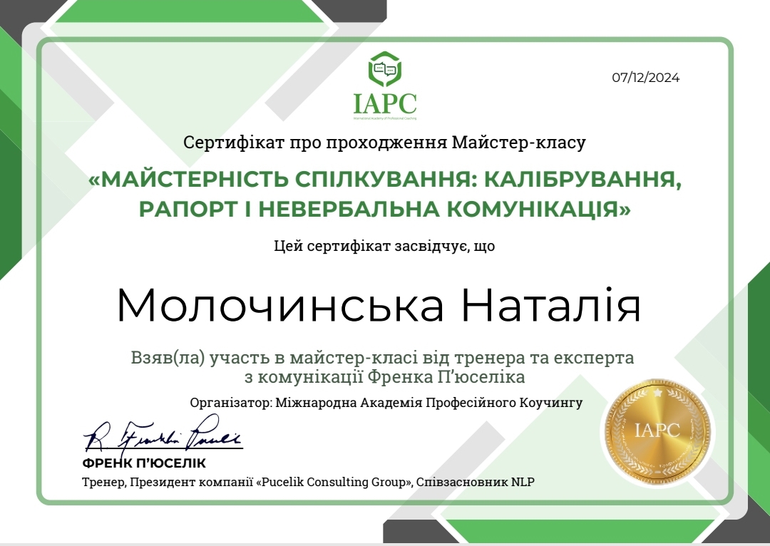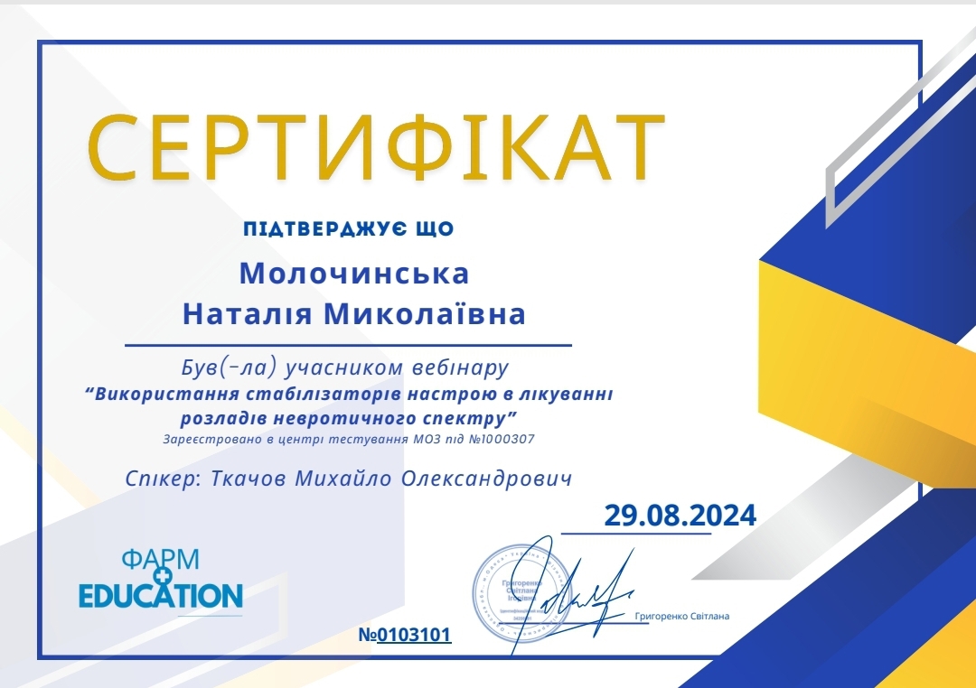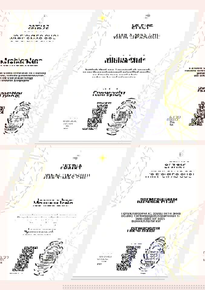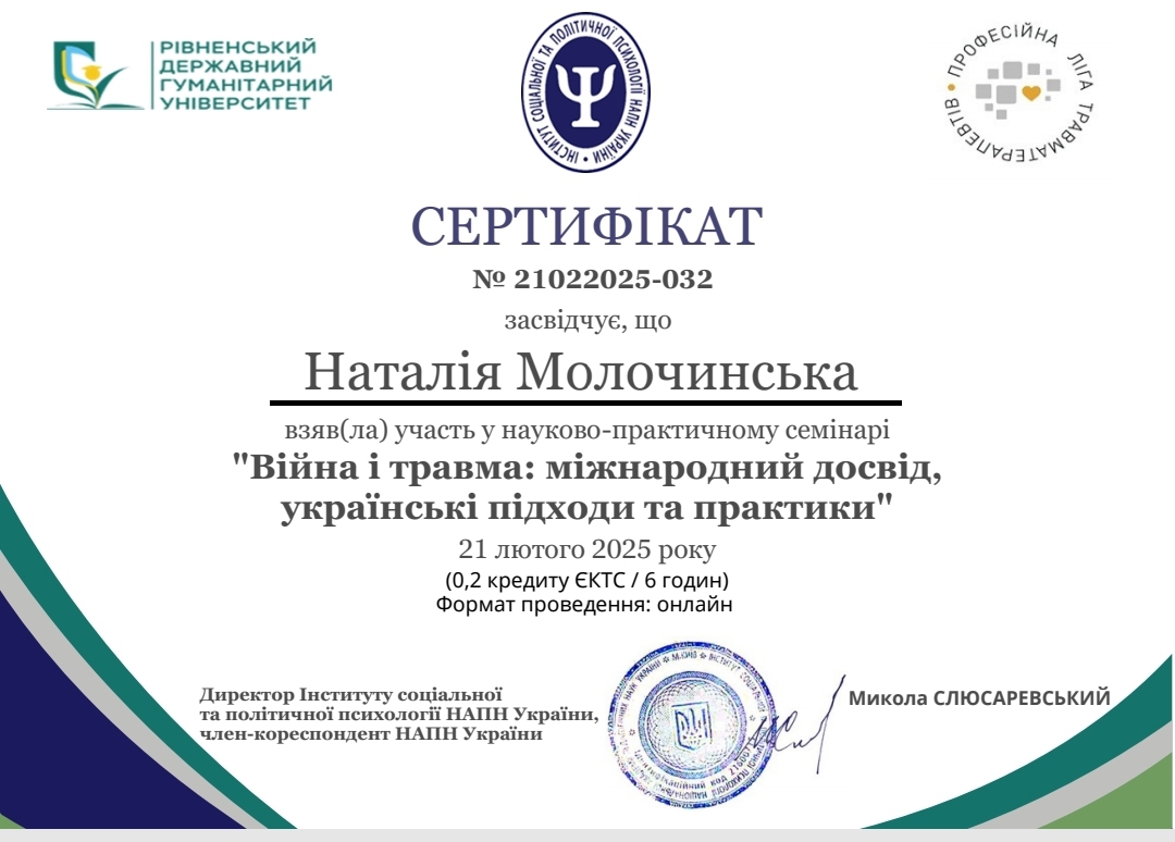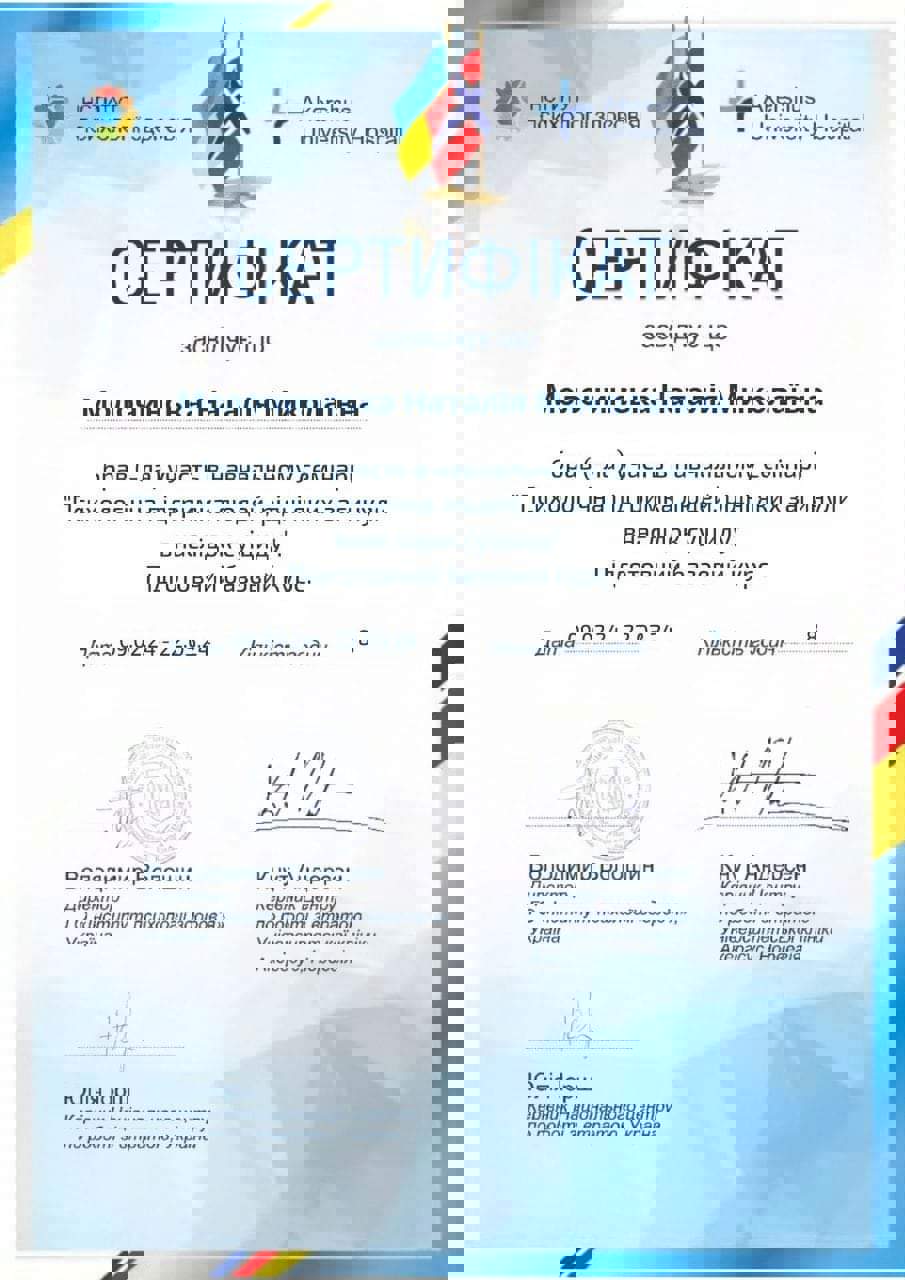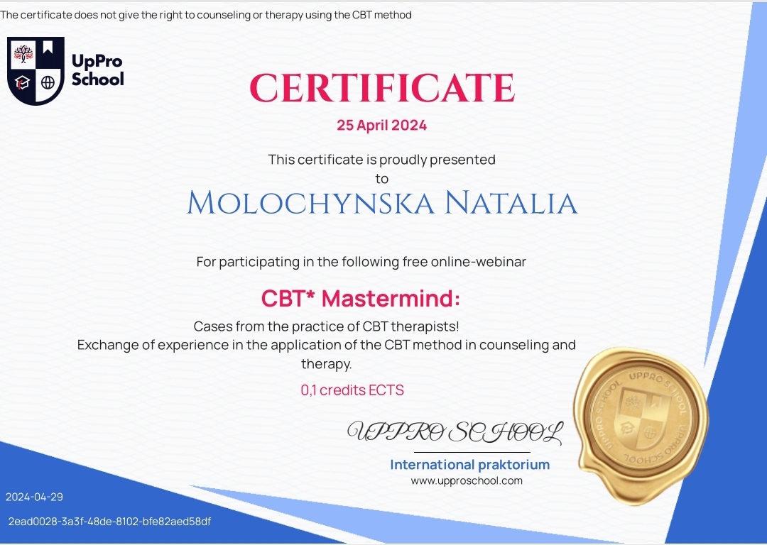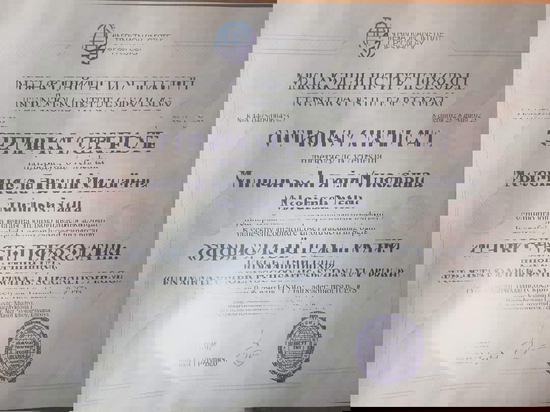 У меня есть степень магистра психологии Западноукраинского национального университета, специализируюсь в клинической психологии. Прошла обучение с повышением квалификации "Клиническая и реабилитационная психология" в Университете Ушинского. Сейчас я в процессе подтверждения квалификации ЭМДР-терапевта и прохожу интернатуру в Международном институте последипломного образования. Работаю под супервидением, имею опыт собственной психотерапии. Отдельная моя специализация – работа с темой горя: я завершила восьмишаговую программу обучения по потере.