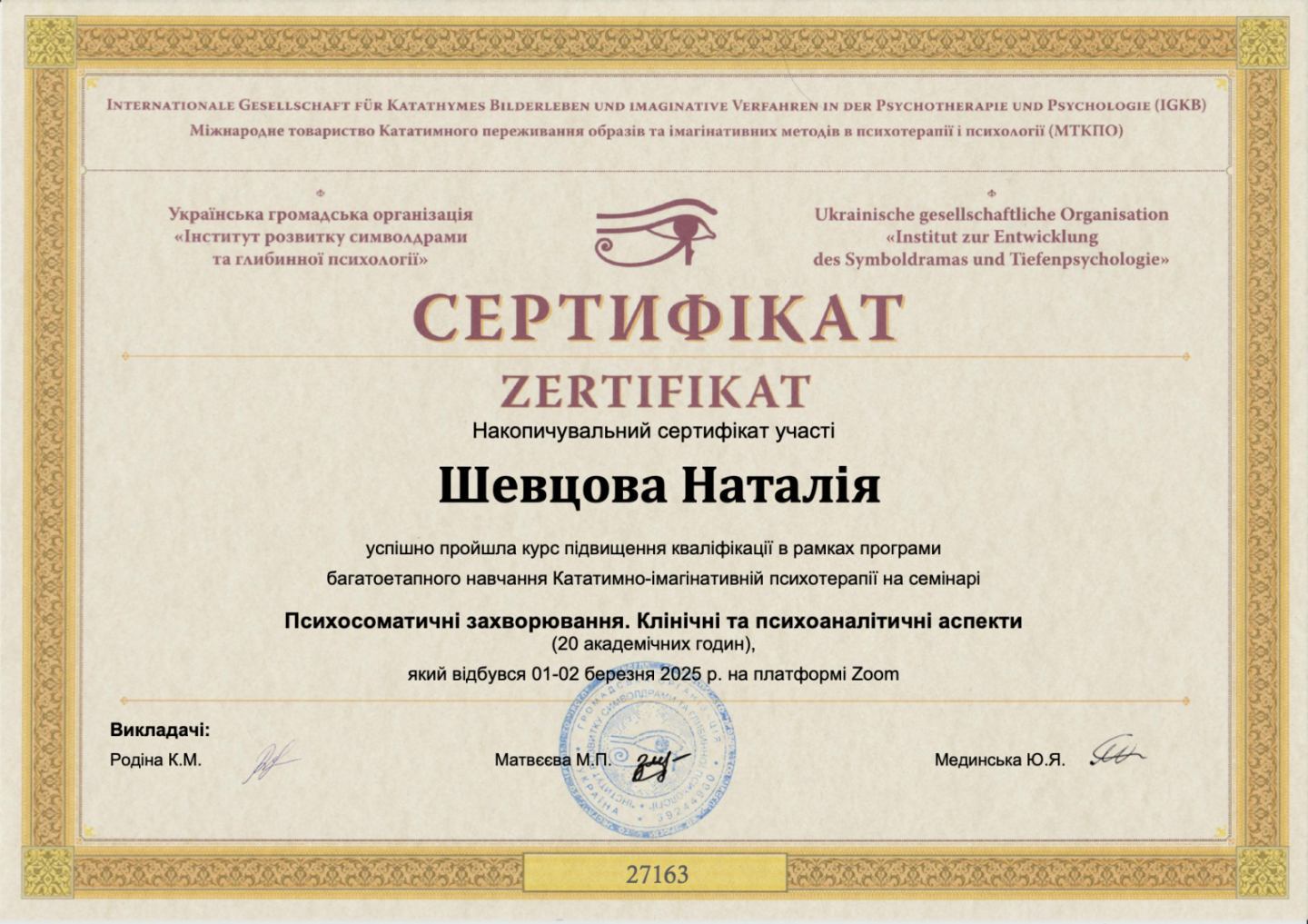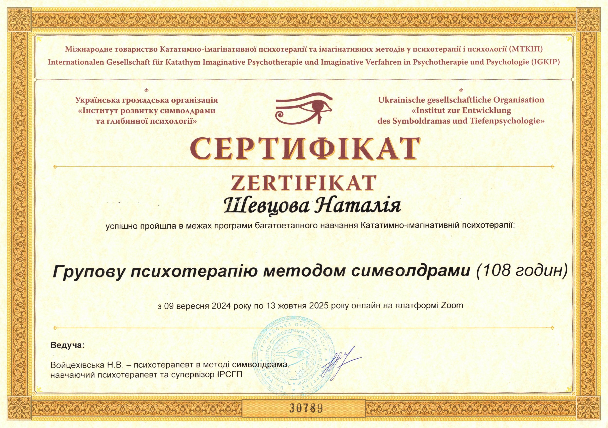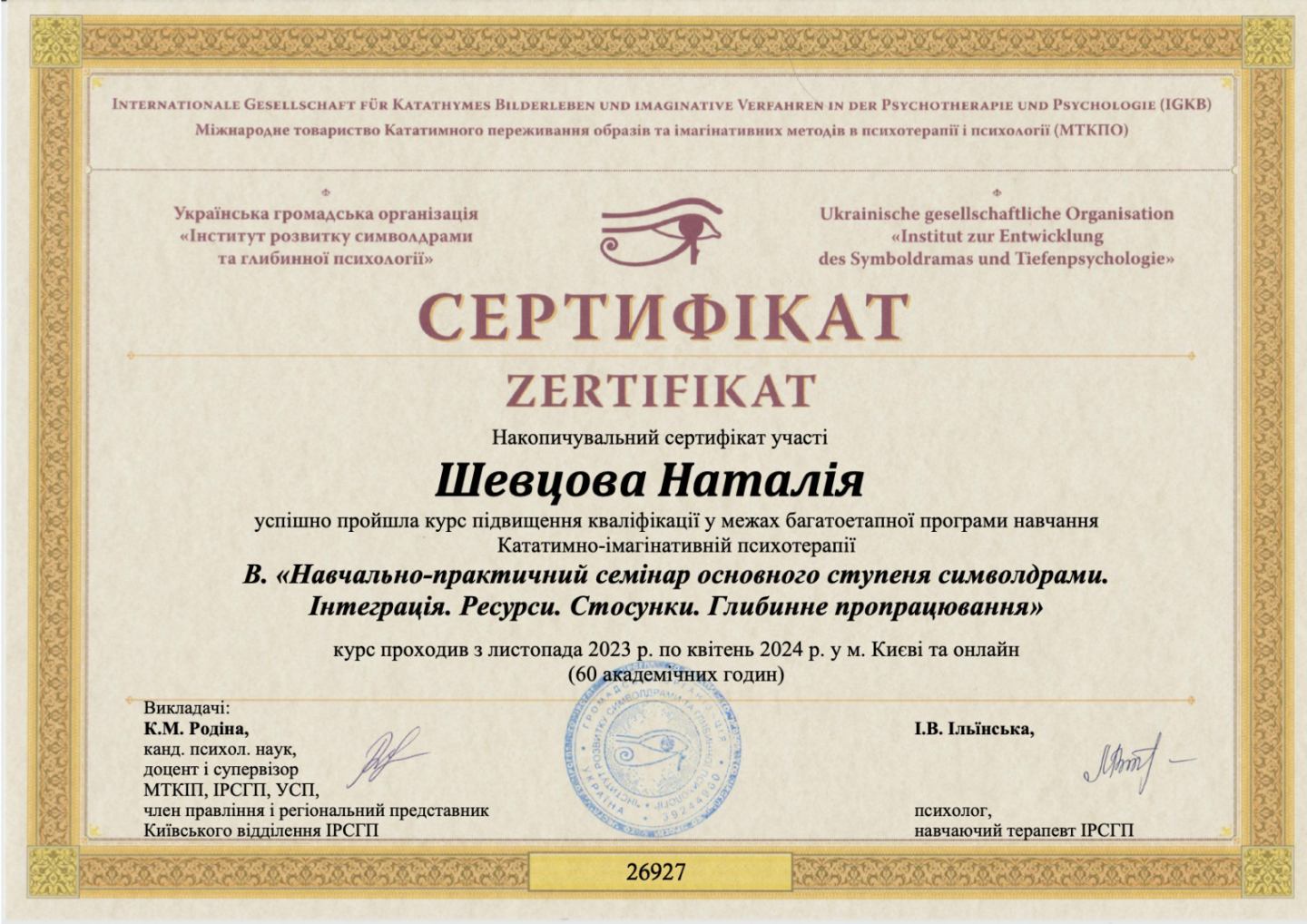 Окончила: -Днепровский гуманитарный университет по специальности "Практический психолог"