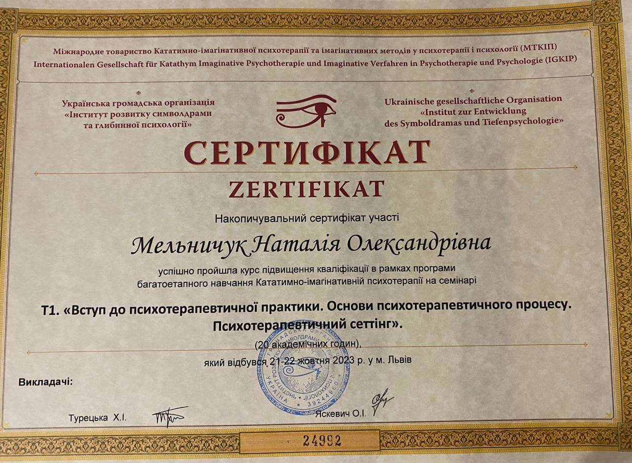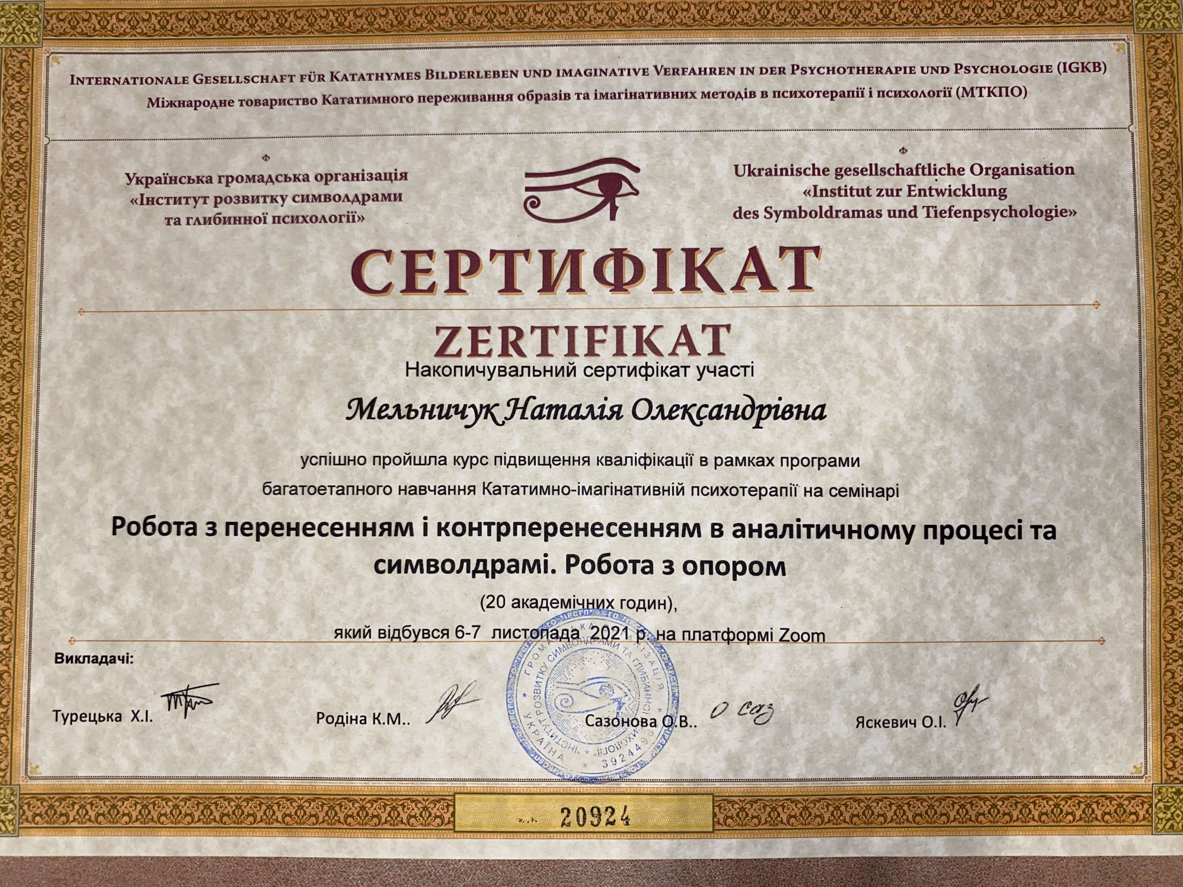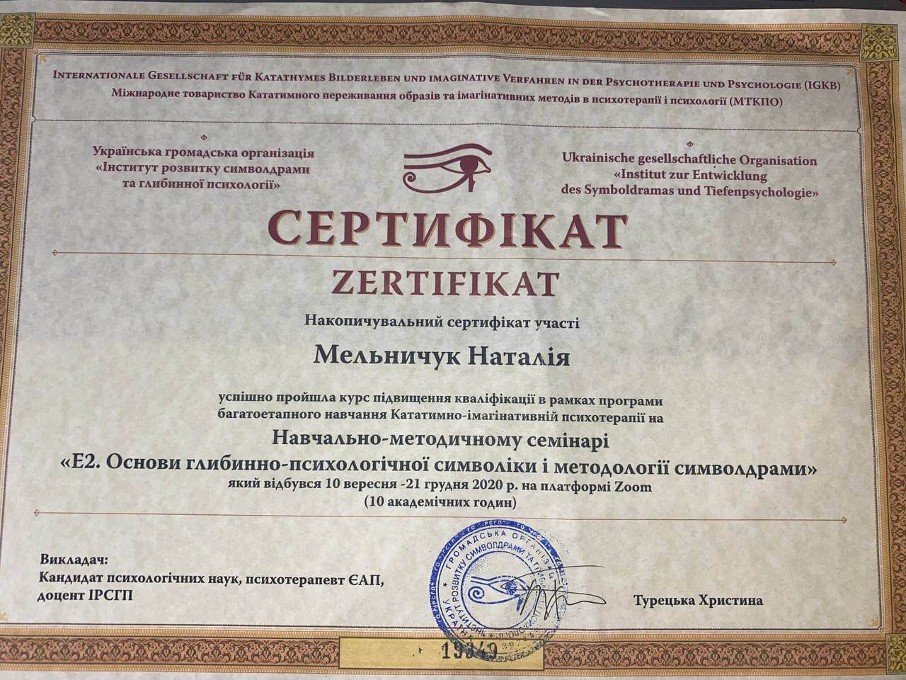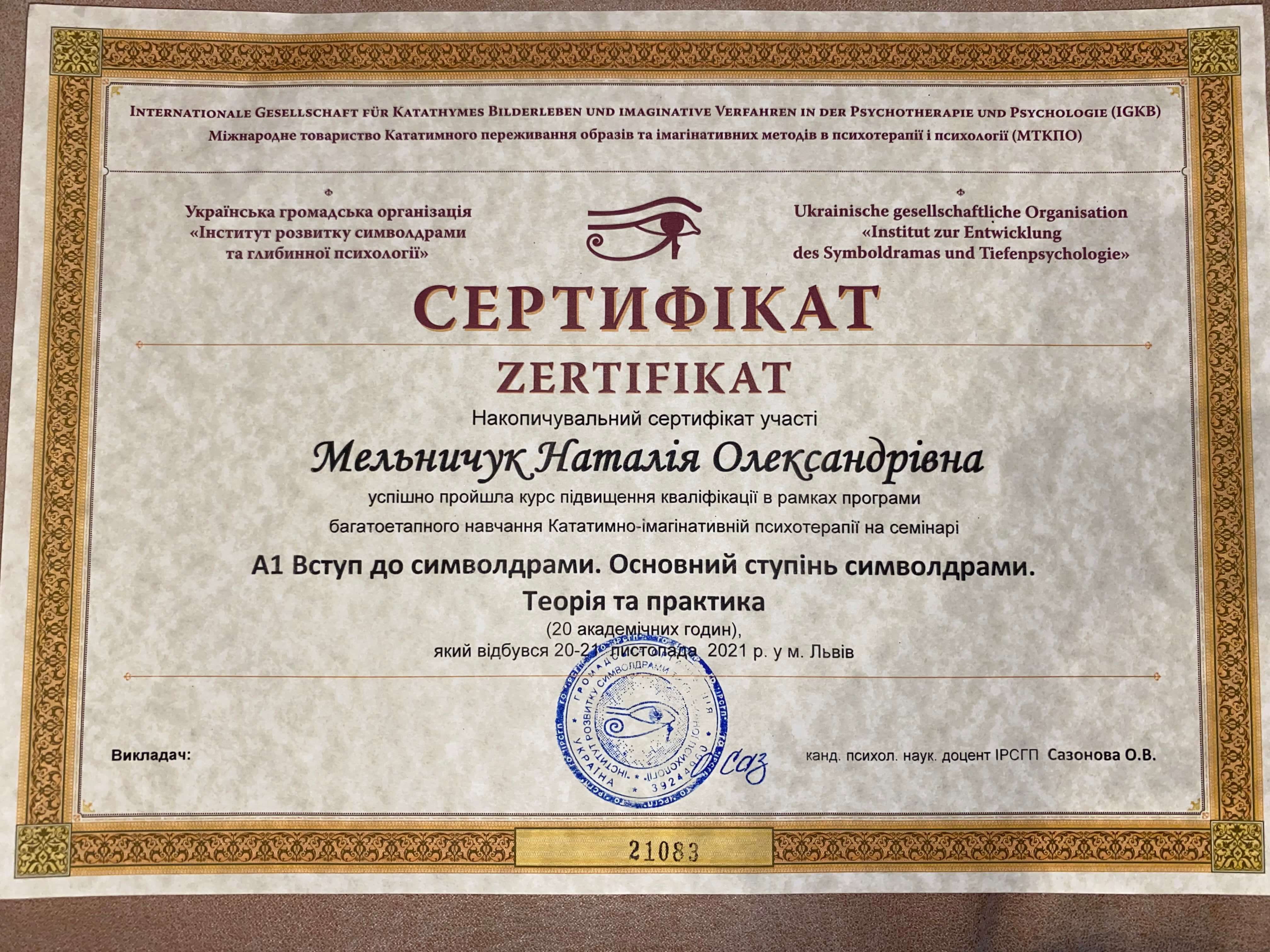 Сейчас учусь на проекте с символдрами, являюсь кандидатом в психотерапевты по методу кататимно-имагинативной психотерапии. Завершила индивидуальную терапию (прошла 100 часов собственной терапии) и групповой психоанализ.