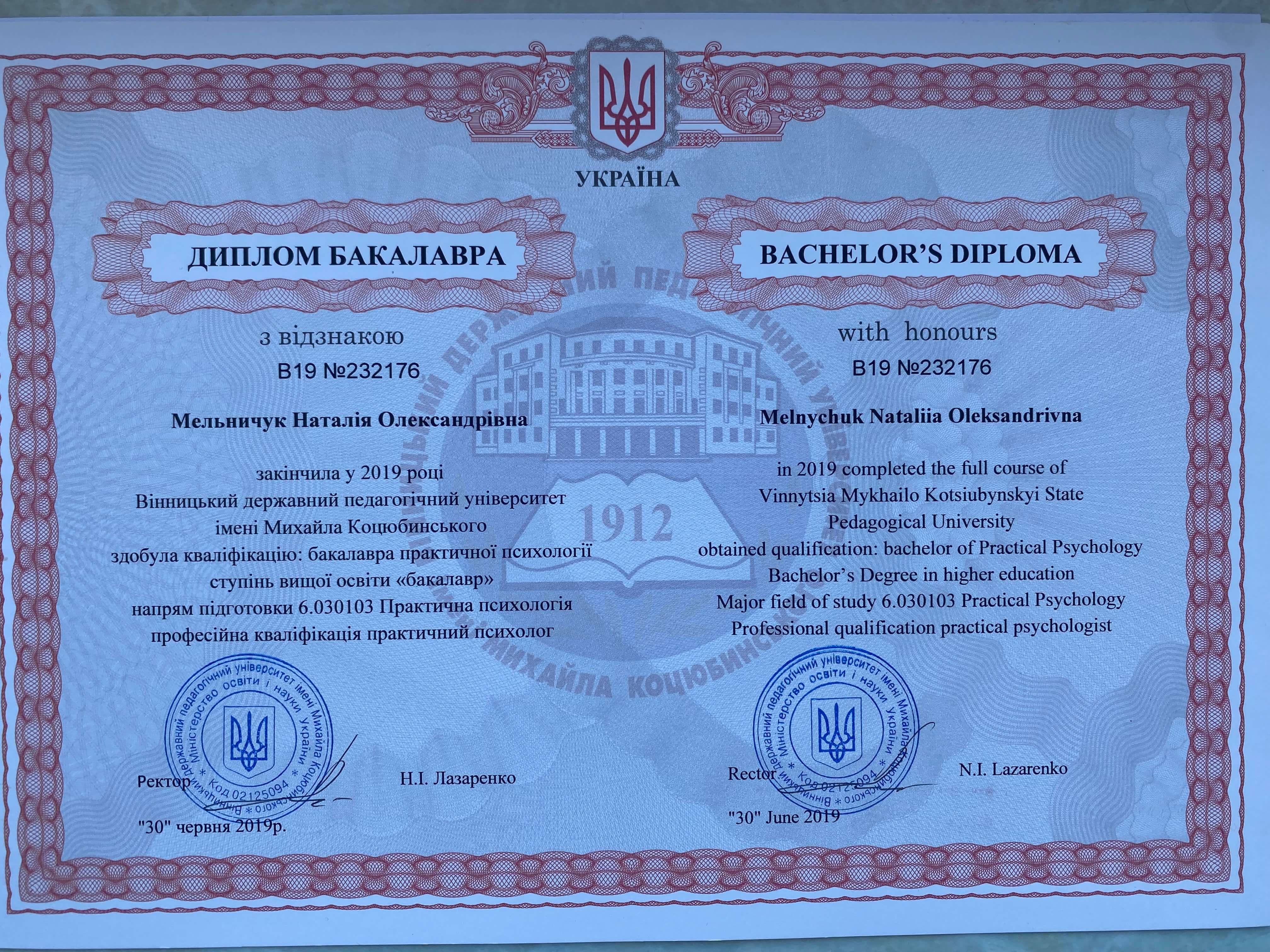 В 2019 г. получила базовое психологическое образование (степень бакалавра) в Винницком государственном педагогическом университете им. М. Коцюбинского.