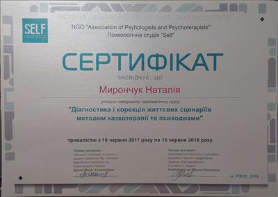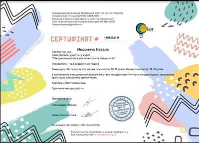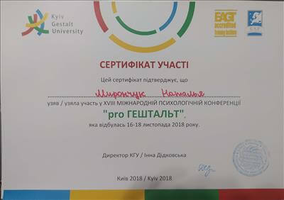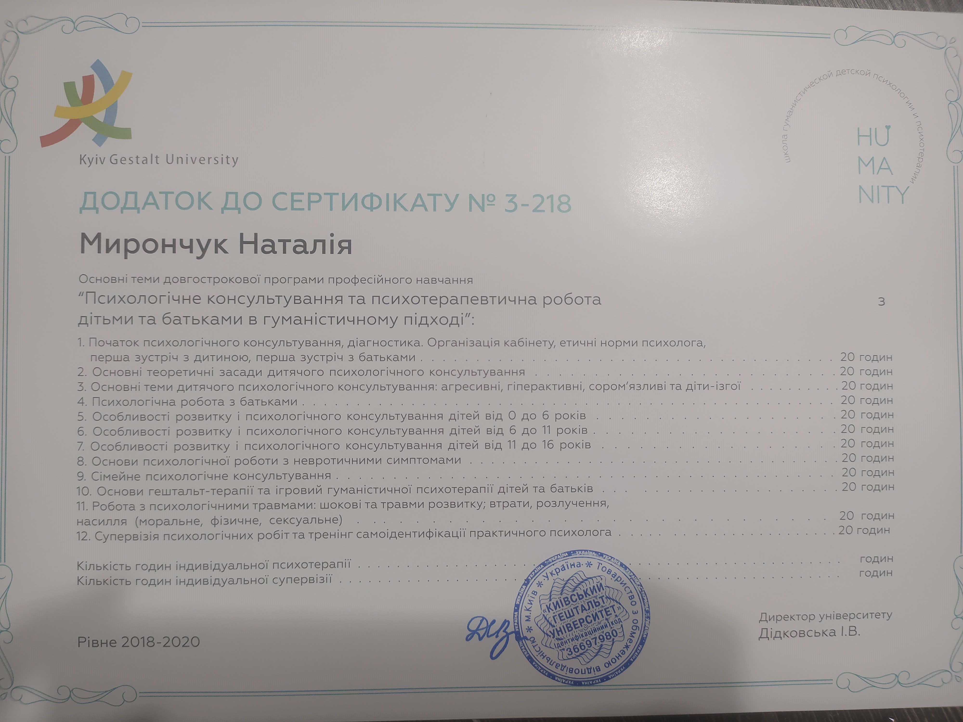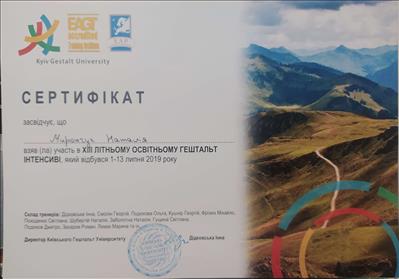Октябрь 2018 - Апрель 2020 - специализация КГУ "Детская психотерапия и консультирование в гештальт-подходе" (тренерский состав: Елена Ратинская, Людмила Баталина, Елена Возиянова)
