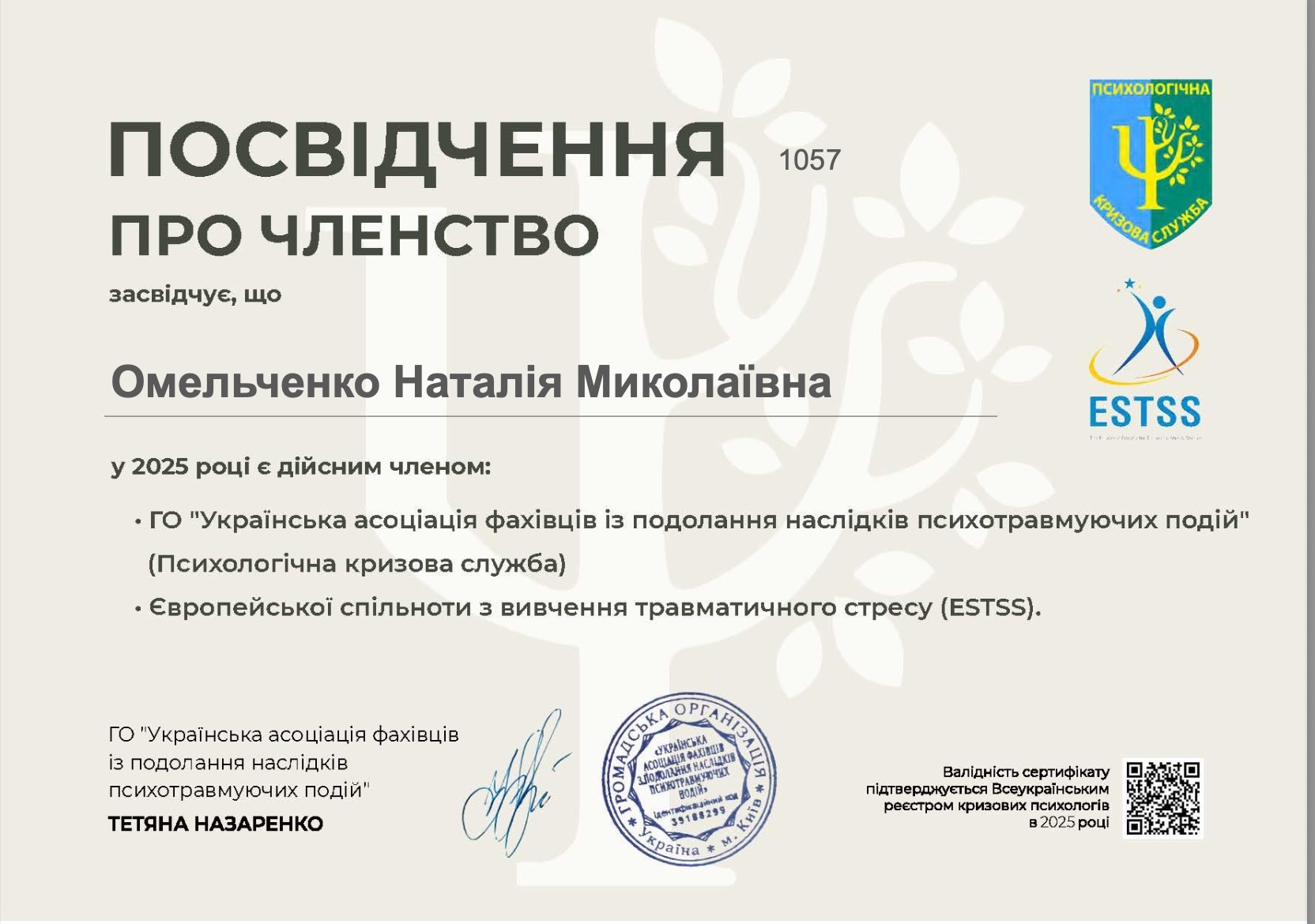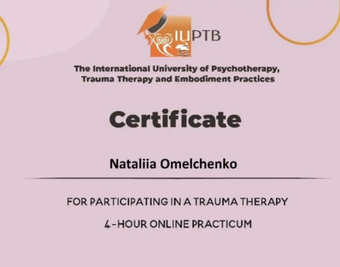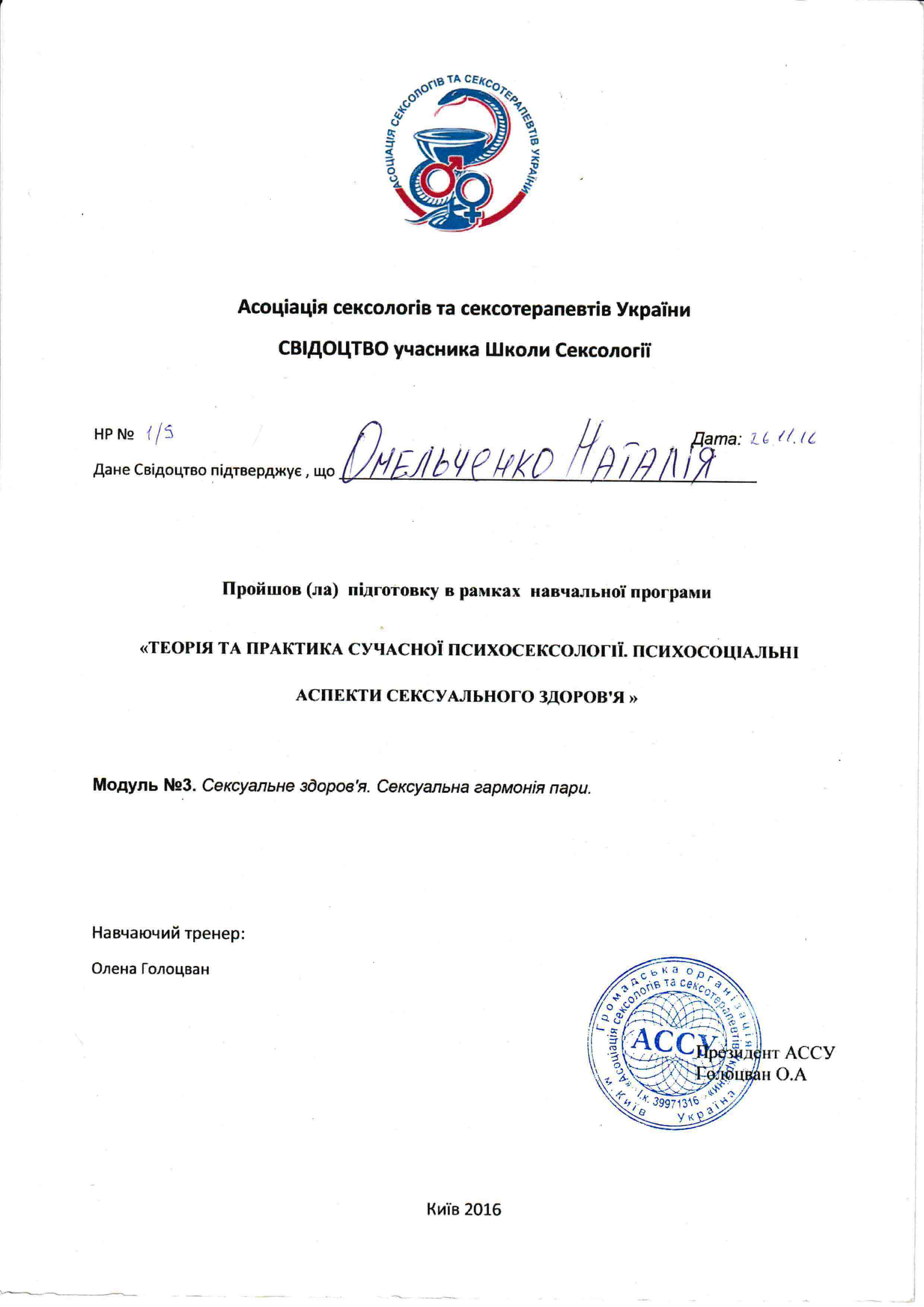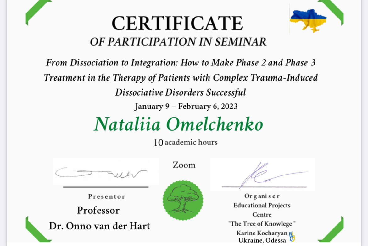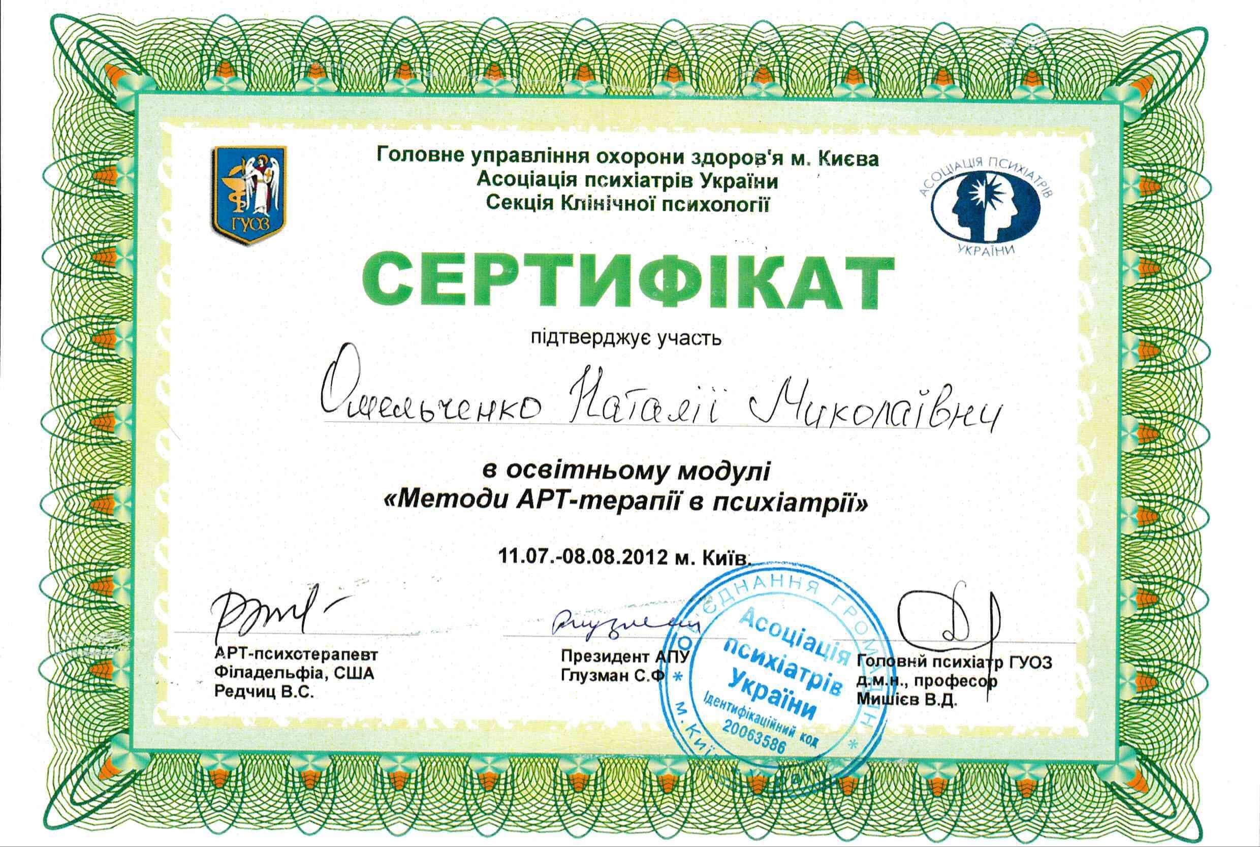 - 2012 - ГУЗ г.Киева, Ассоциация психиатров Украины, Секция Клинической психологии - Образовательный модуль "Методы АРТ-терапии в психиатрии" - 32 часа