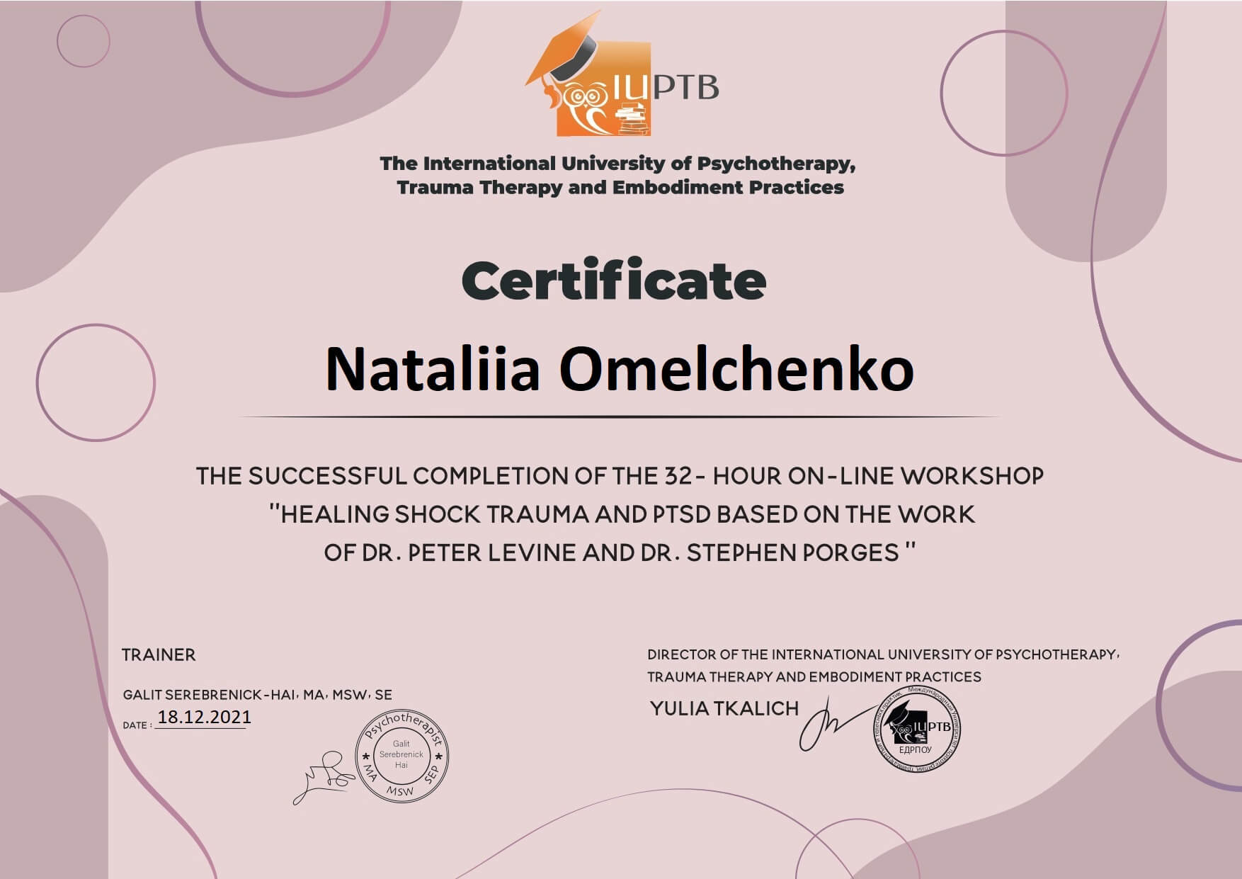 2021 – работа с шоковой травмой и ПТСР по методу Питера Левина -36 часов