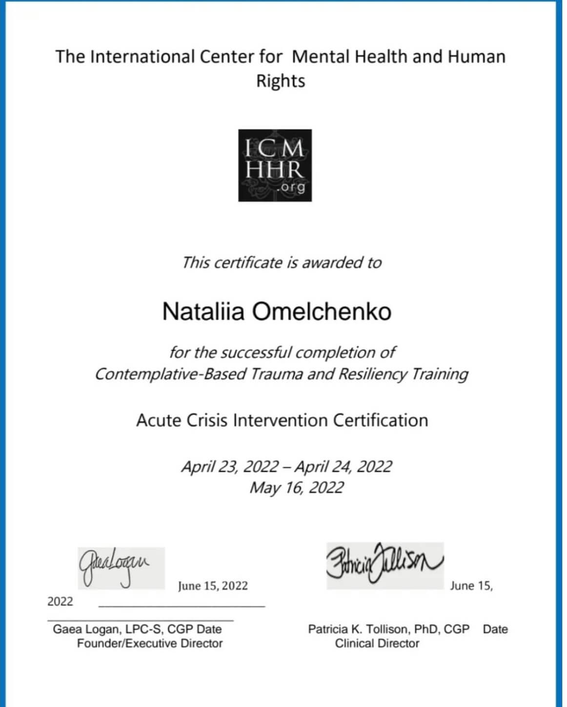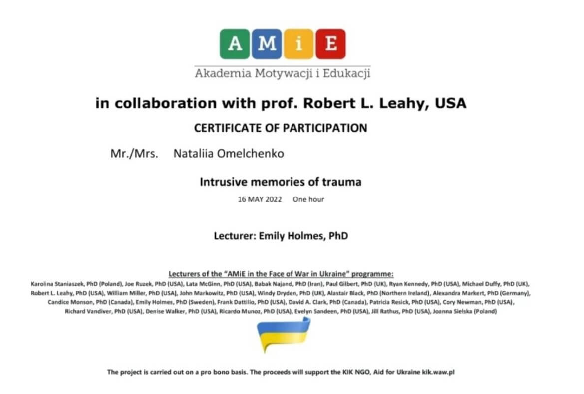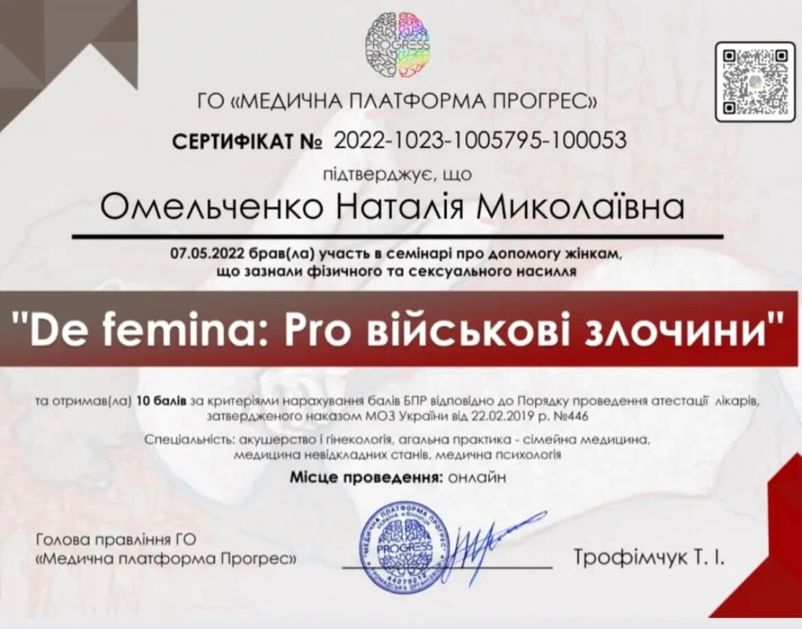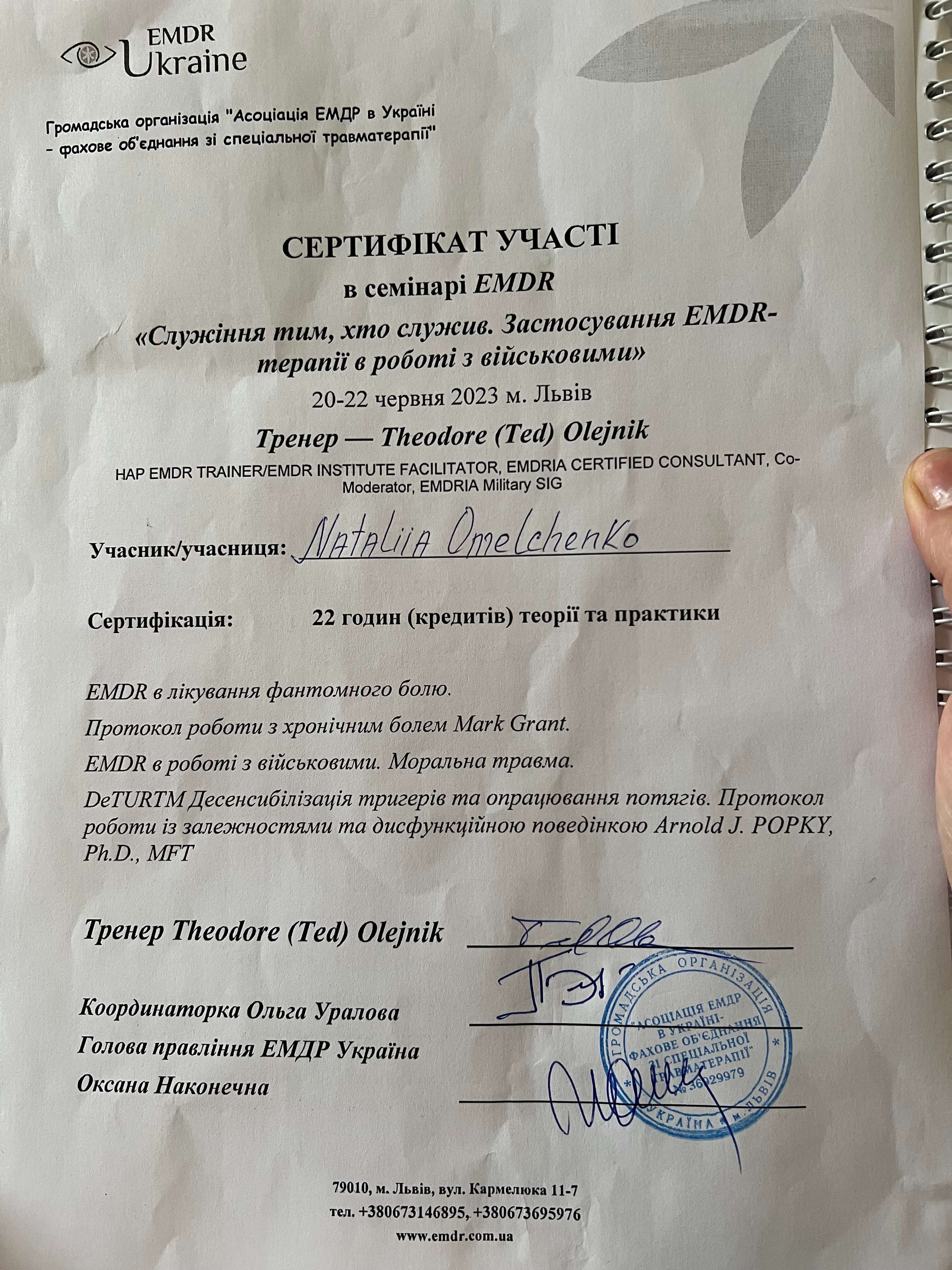 2023- повышение квалификации- работа с фантомными болями, хронической болью, зависимостями у военных и гражданского населения