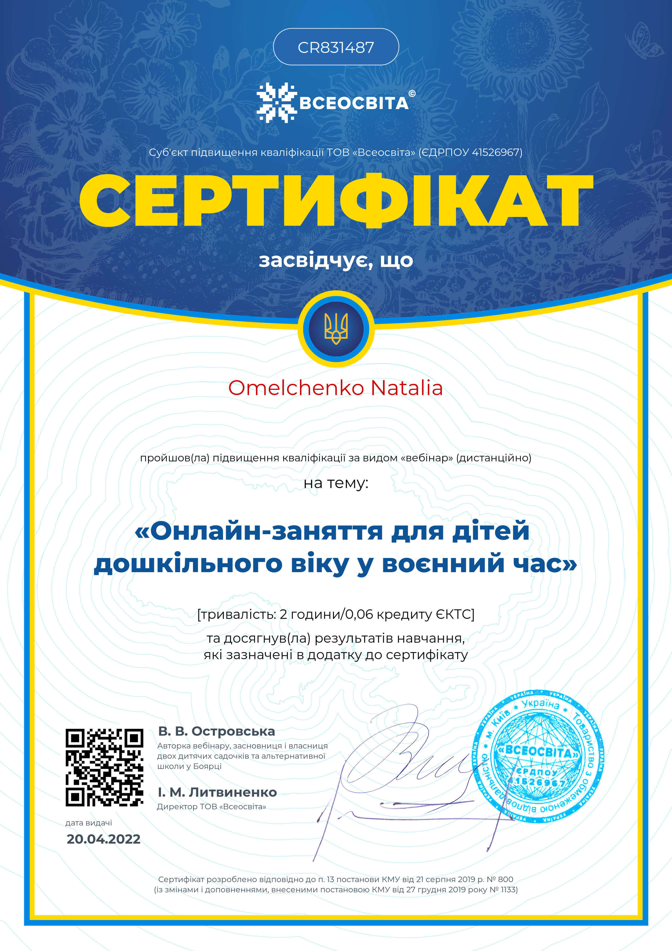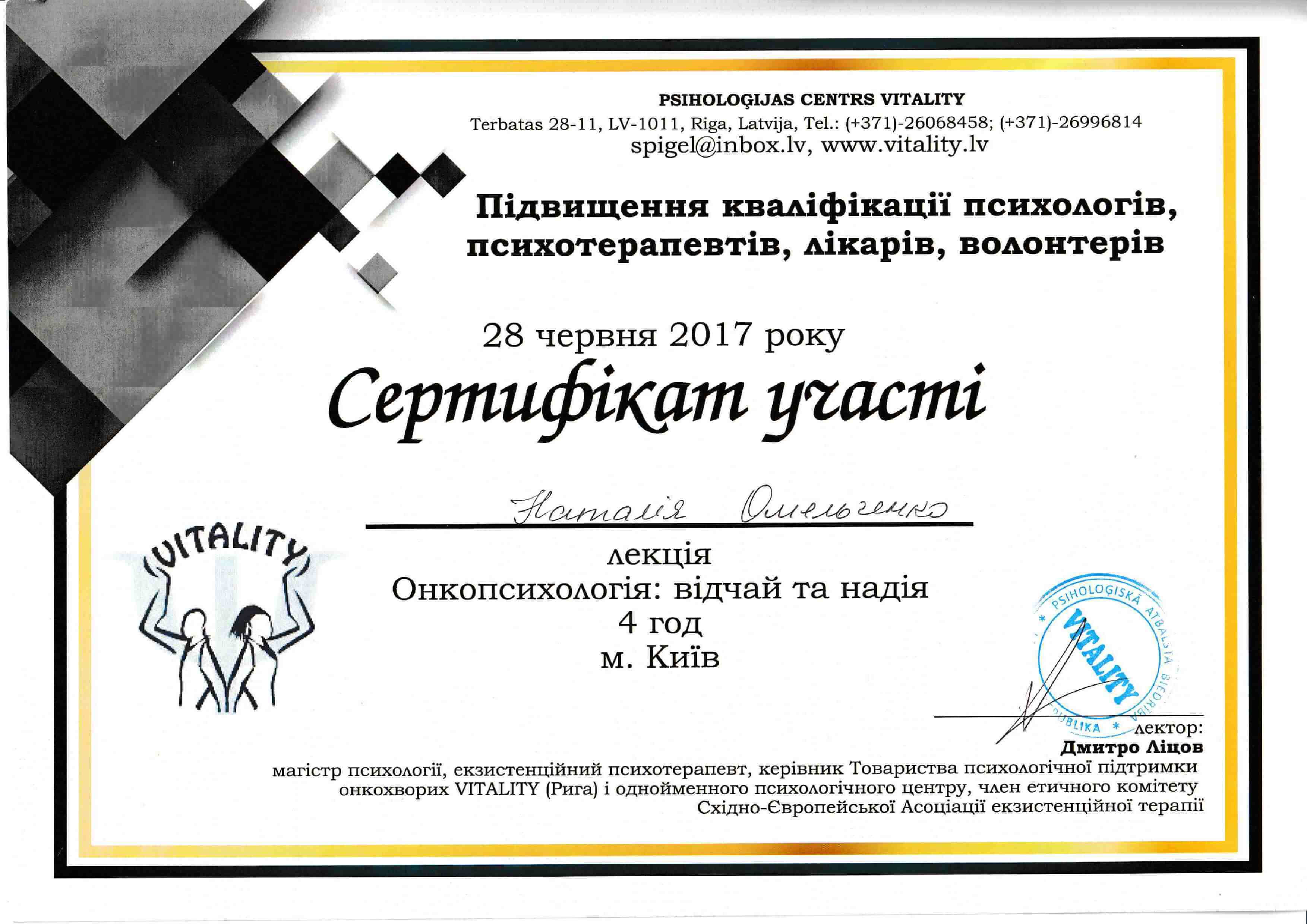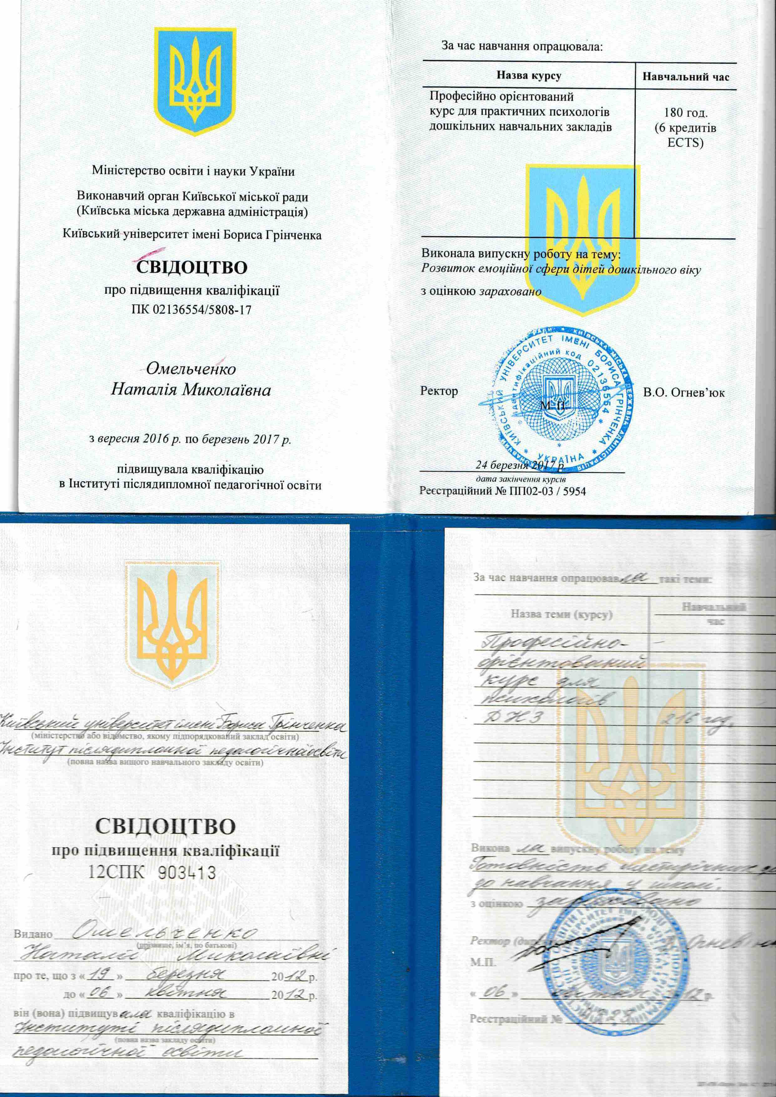 -2012 – повышение квалификации для детских психологов Киевский университет им. Б.Гринченко-216 часов.