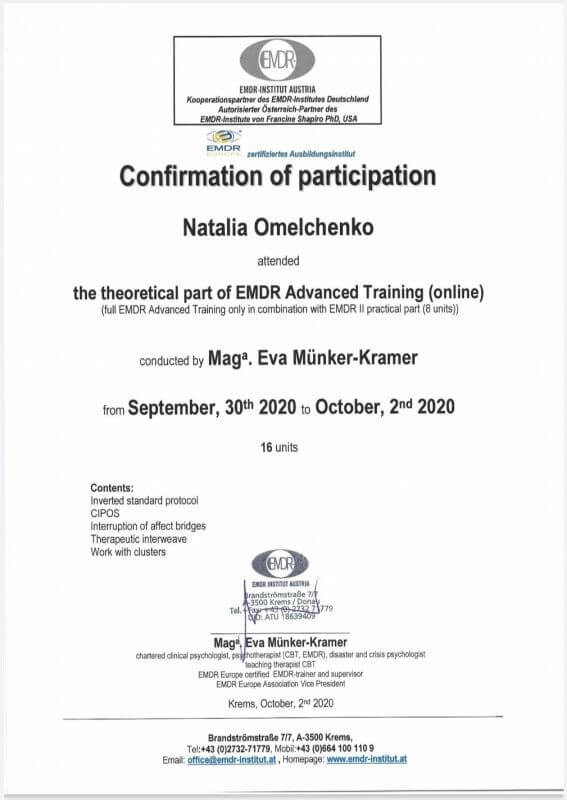 2019-2021 – программа подготовки EMDR терапевтов -ЭМДР Институт Австрии