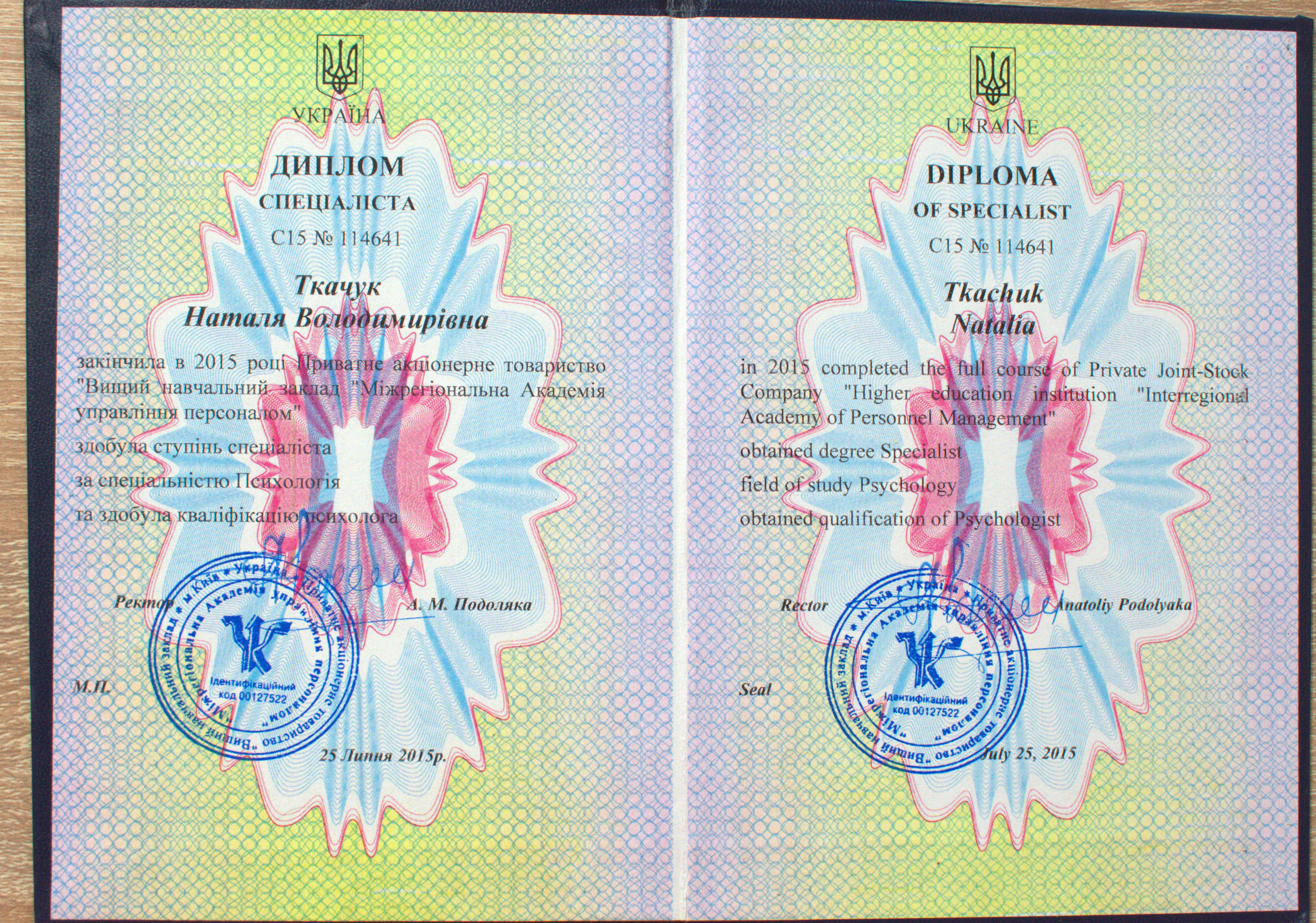 В 2015 году окончила Одесский институт МАУП и получила степень специалиста психологии.