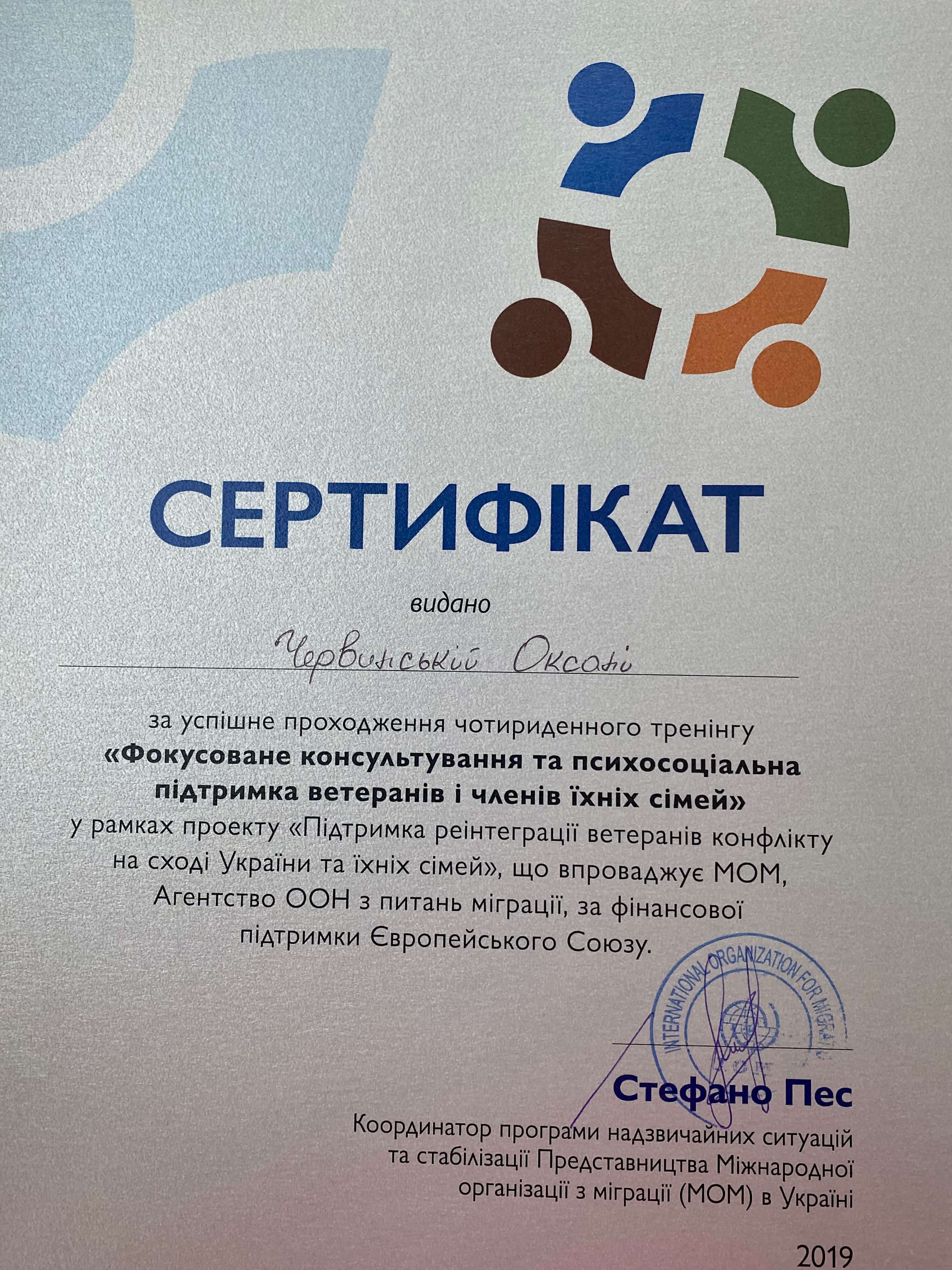 Скртификация по Арт-терапии, Тематические Усовершенствования УВМА (Укр Военно-Медицинская Академия), участие в конференциях и тренингах, семинарах и форумах.