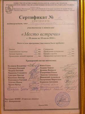 Окончила обучение - ВОППГП Украинский Гештальт-институт, теория и практика в гештальт-подходе, окончила 1,2 ступени, сертифицированый гештальт-терапевт.