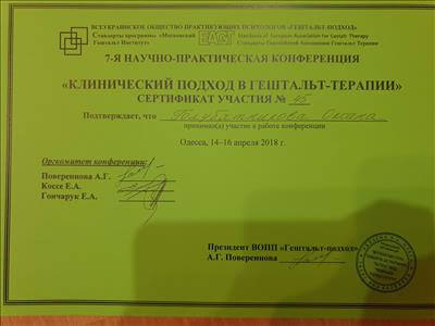 Прошла специализацию "Терапия состояний в гештальт-подходе" на базе украиского Гештальт - института.