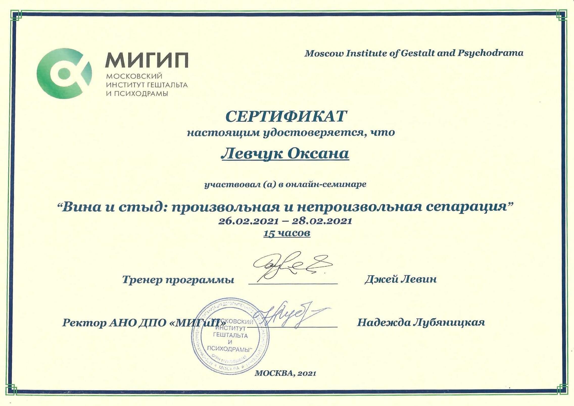 МИГиП: сертифицированный гештальт-терапевт (выпускающий тренер Михаил Кряхтунов).