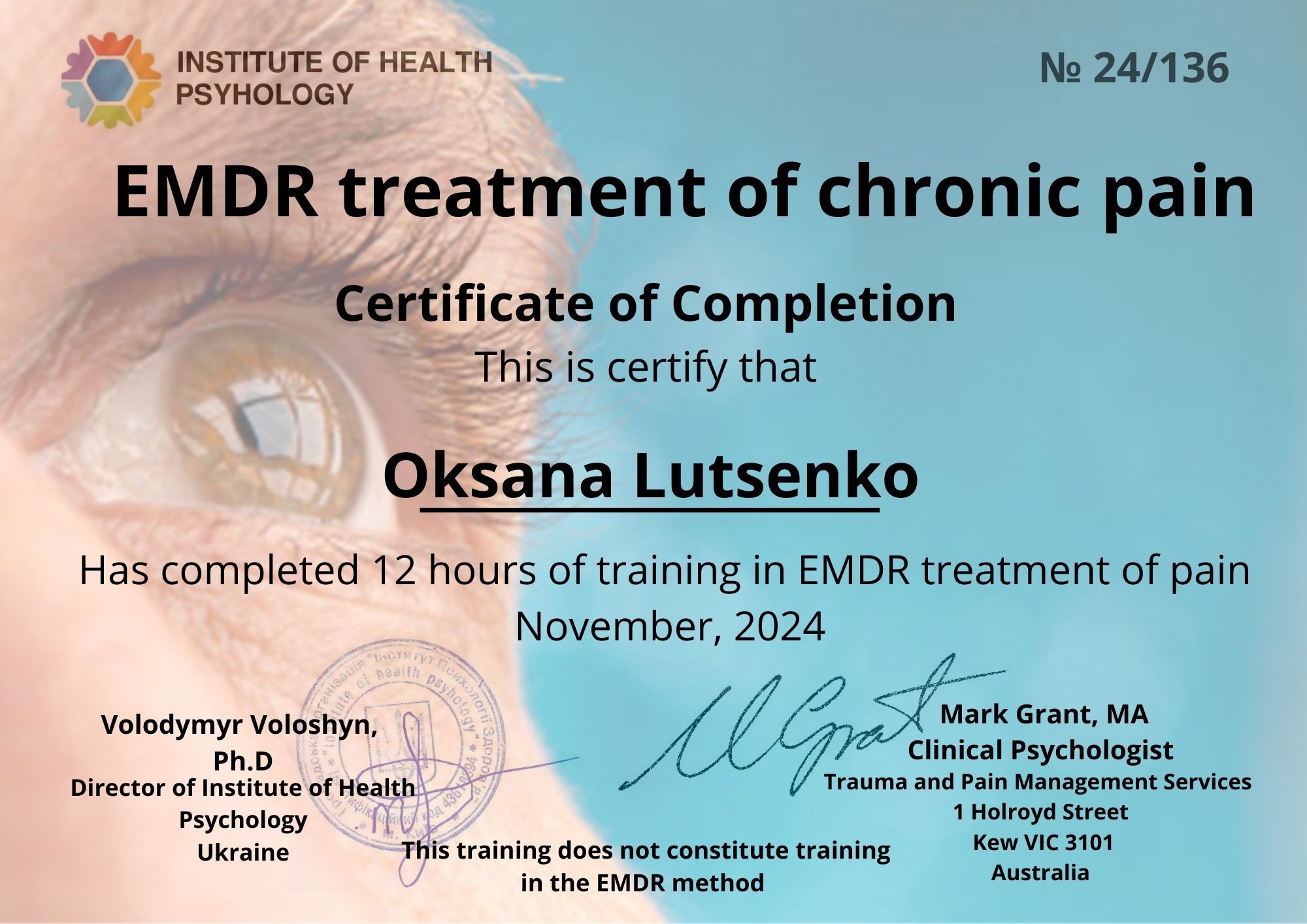 Я – Оксана, дипломированный психолог, сертифицированный сексолог, член Украинского Союза психотерапевтов, системный семейный психотерапевт в обучении, а также дипломированный психосоматический релаксолог.