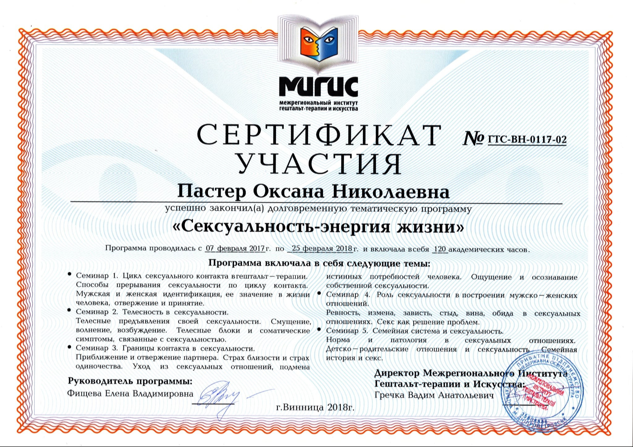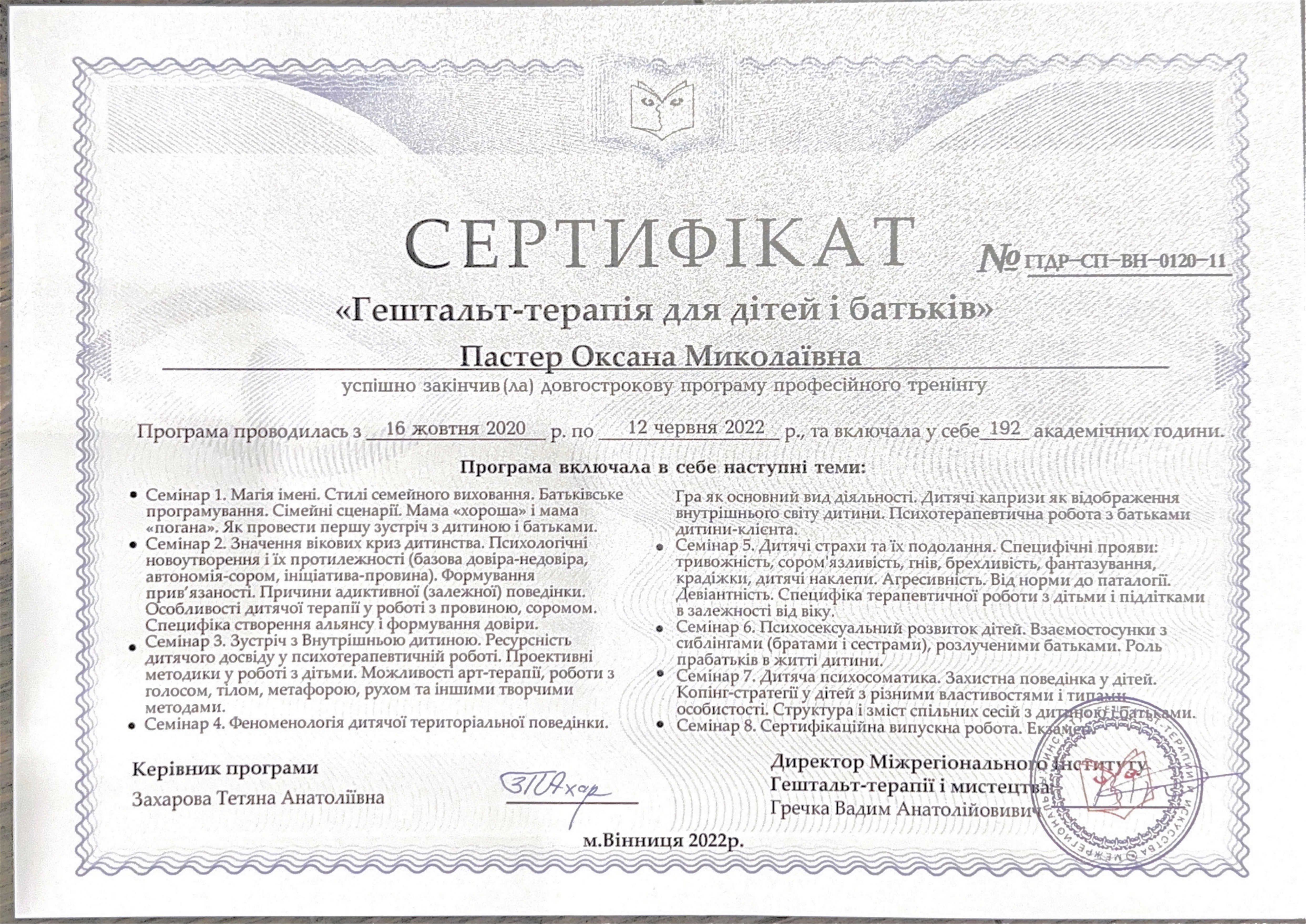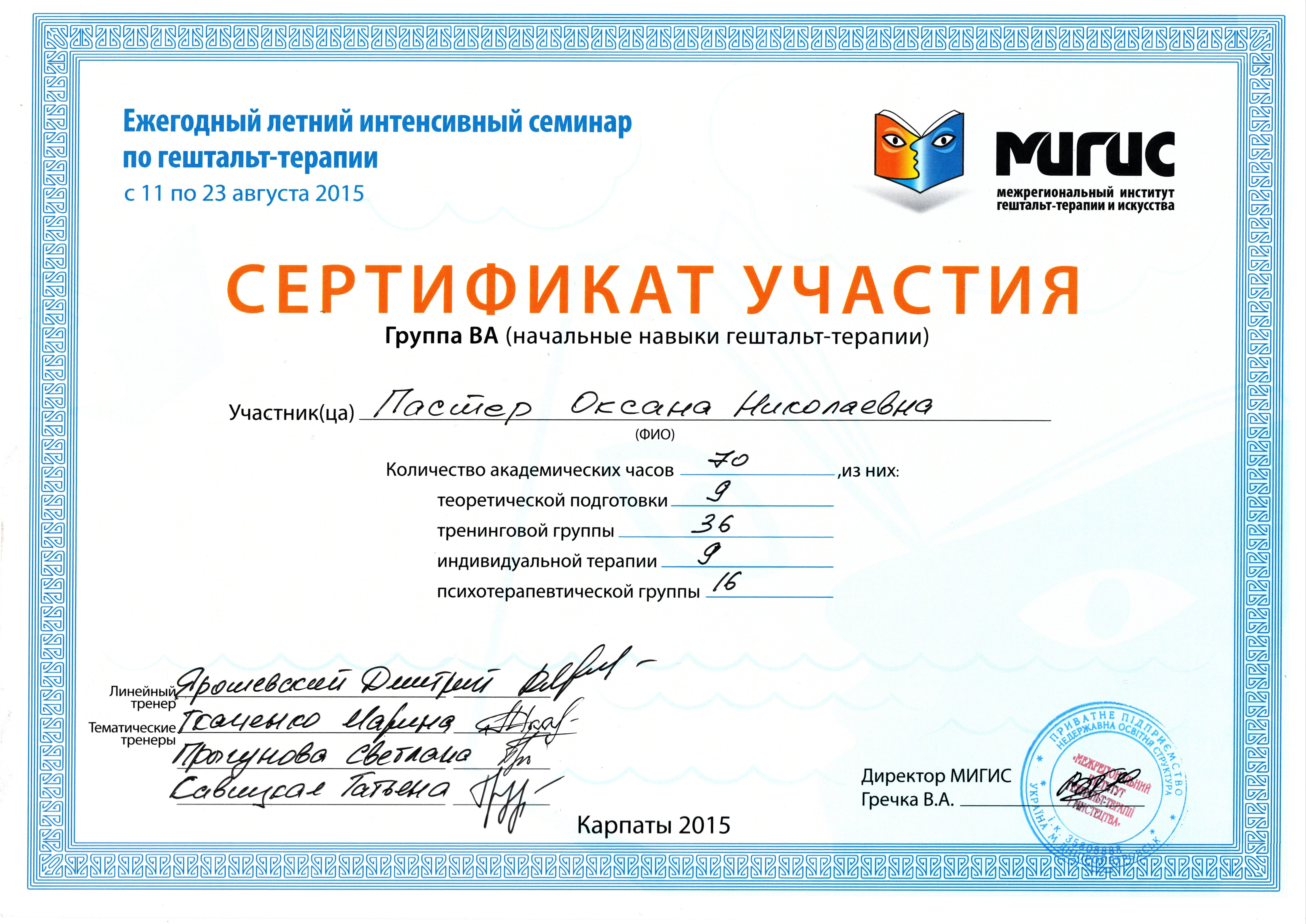 - усовершенствование в гештальт-терапии (3 степень, тренерская).