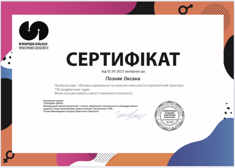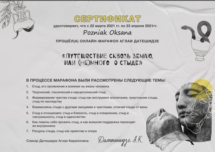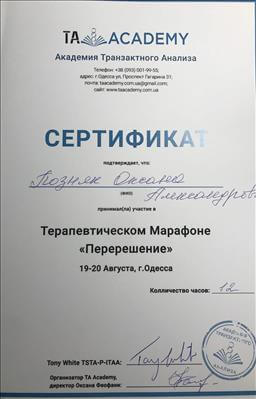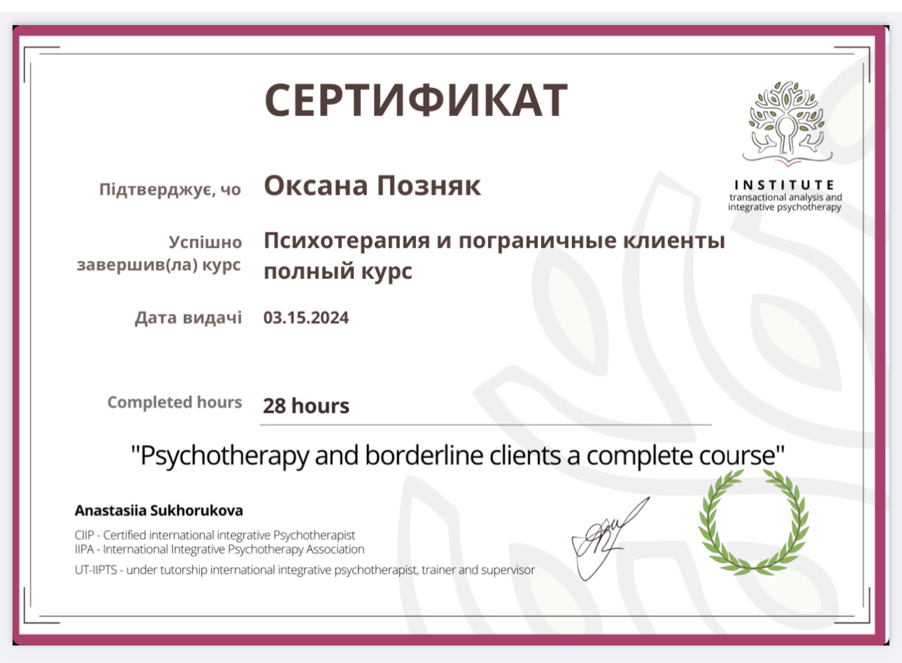 20 лет назад я пришла получать второе высшее образование к Татьяне Калашник. Это была первая группа по Позитивной Психотерапии в Одессе. На тот момент я стояла на пороге развода и начала свой путь познания психологии через себя. Это увлекательное путешествие. Иногда штормит и выбрасывает на берег. И когда открывается второе дыхание, чувствуешь как можешь свернуть горы. Мне всегда интересно узнавать себя, так я лучше понимаю и чувствую других. Знаю, что потенциал человека огромный и всегда можно найти выход из ситуации. С каждым клиентом я отправляюсь в уникальное путешествие, сопровождаю его, как маяк в ночи.