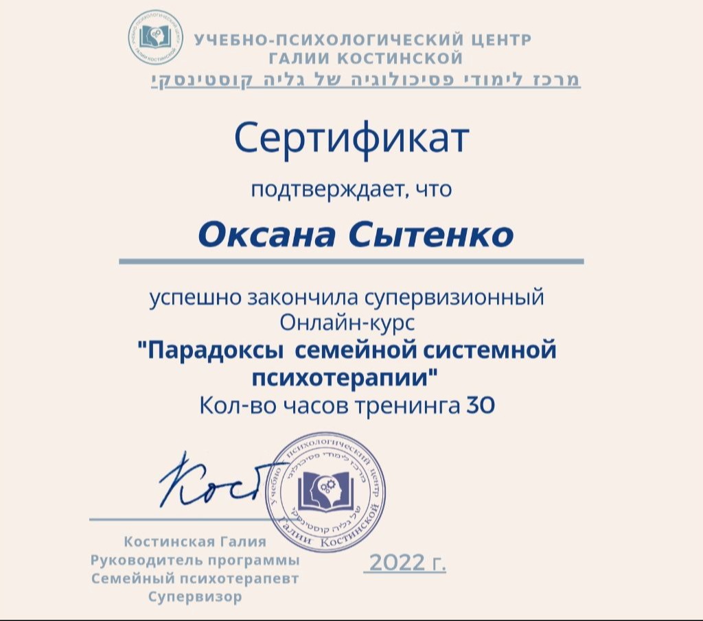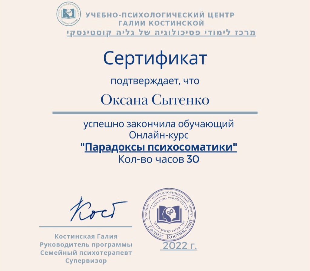 По основной профессии я врач-терапевт, в гештальт терапию пришла 5 лет назад, последние 2 года нахожусь в личной терапии. Работаю в гештальтном подходе, постоянно обучаюсь и улучшая свои профессиональные навыки психотерапевта. Имея опыт врача, могу давать рекомендации о дополнительных обследованиях по вопросам здоровья и это дает мне возможность четко отличать психосоматику и реальные физиологические проблемы у клиентов. В работе я всегда внимательна и отзывчива к клиентам, все свои профессиональные навыки и знания используя максимально в интересах клиентов, ответственно подхожу к своей работе, регулярно беру супервизии у коллег.