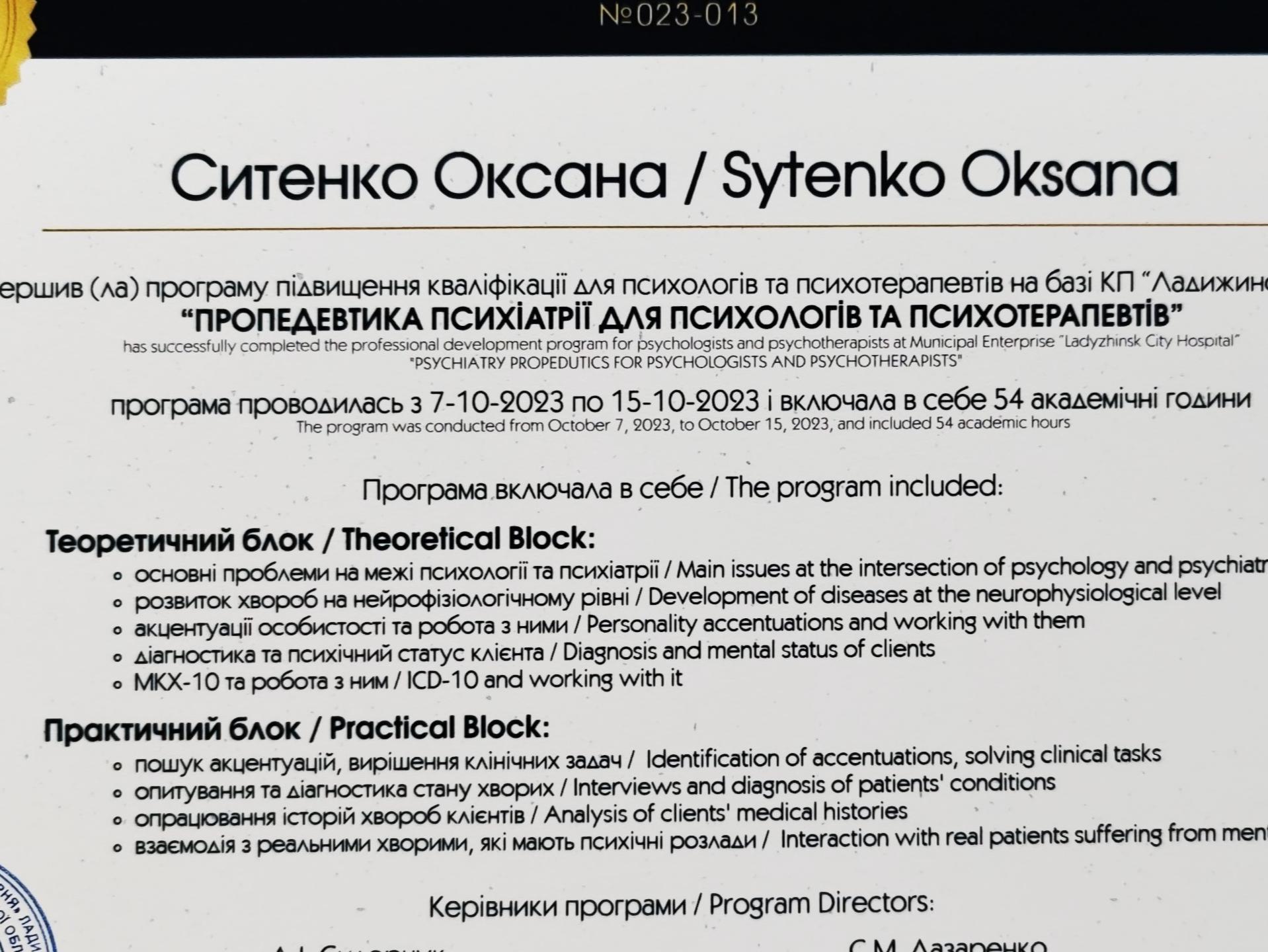Днепровский национальный университет имени А.Гончара по специальности лечебное дело, I степень института MIGIS психотерапии в гештальтном подходе, продолжая обучение на II ступени института MIGIS, прошла специализацию по теме "Терапия зависимых отношений", заканчиваю обучение по теме "Телесная терапия", маю об окончании программы "Пропедевтика психиатрии для психологов и психотерапевтов", имею сертификат об окончании онлайн курса "Парадоксы семейной системной терапии", "Парадоксы психосоматики".