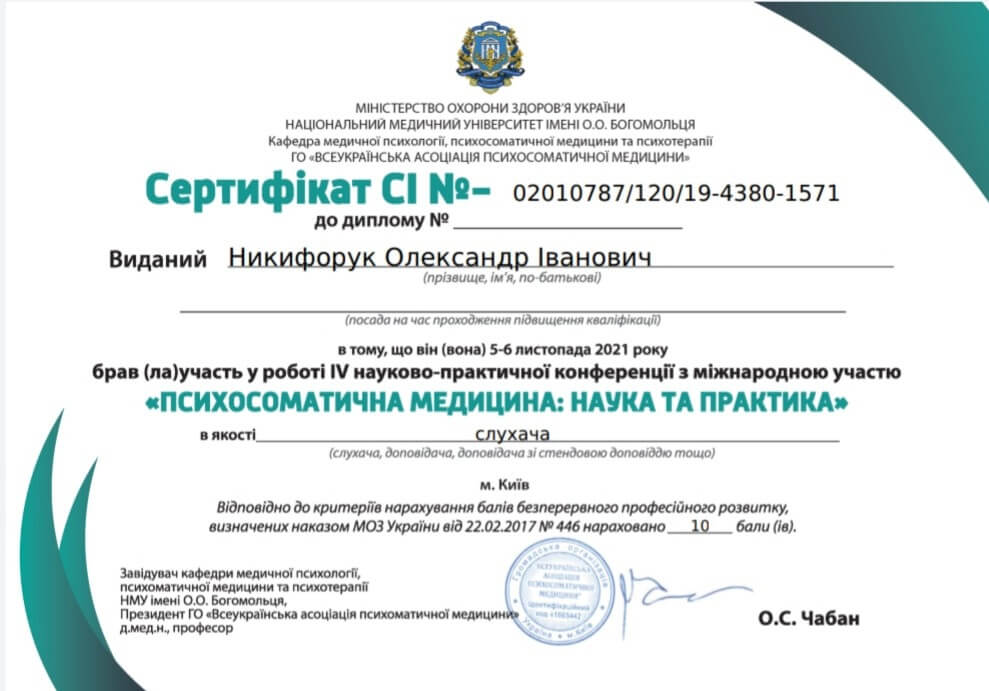 2. 2005 – 2019 постоянное прохождение повышения квалификации на базе НМА последипломного образования имени П.Л.Шупика, в том числе и по психофизиологии.
